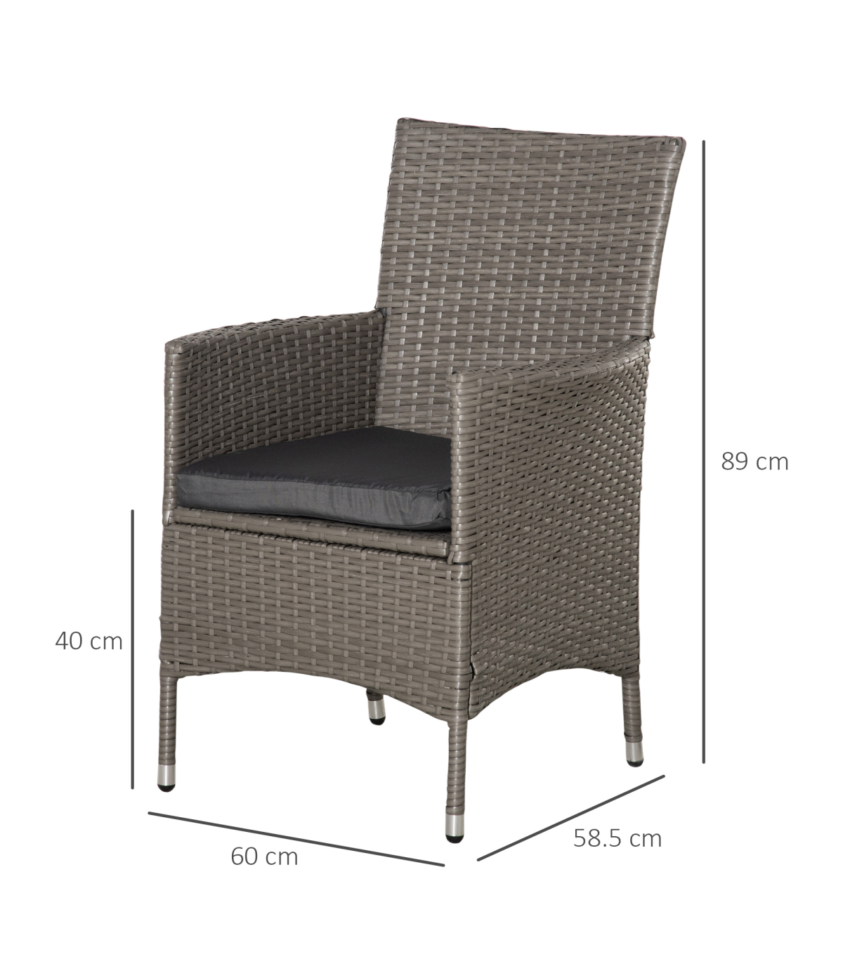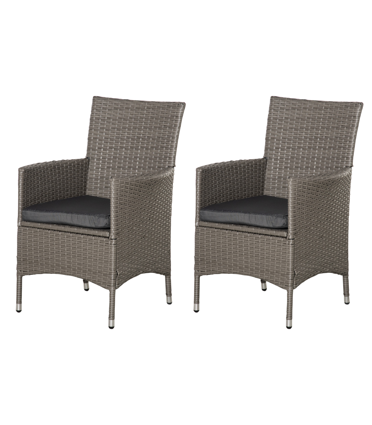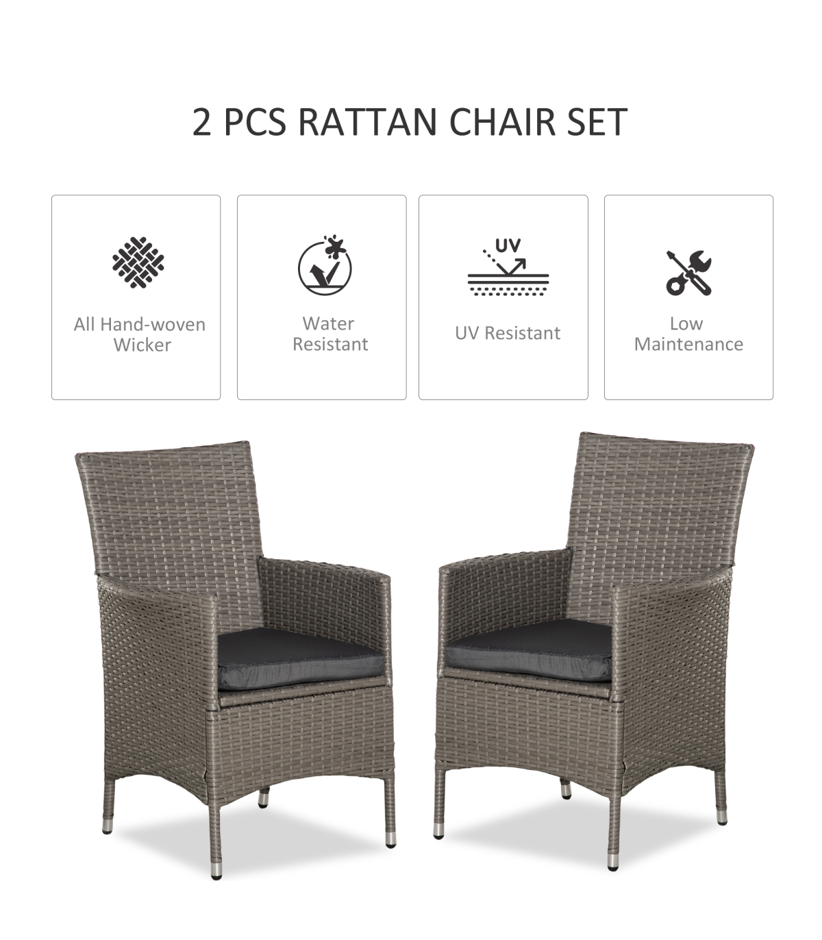 Introducing the Outsunny 2 Seater Grey Rattan Garden Chairs - a perfect blend of style, comfort, and durability for your outdoor spaces. Crafted with a strong galvanized metal frame and wrapped in resilient plastic rattan, these chairs promise longevity and are designed to withstand the elements. The set includes two chairs, each featuring tall backs and armrests for maximum comfort, complemented by 5cm thick padded seat cushions. Whether used alone or paired with other furniture sets, these rattan dining chairs are an ideal choice for enhancing your garden, patio, or any outdoor area. Start your season with elegance and comfort with this stylish two-part set.