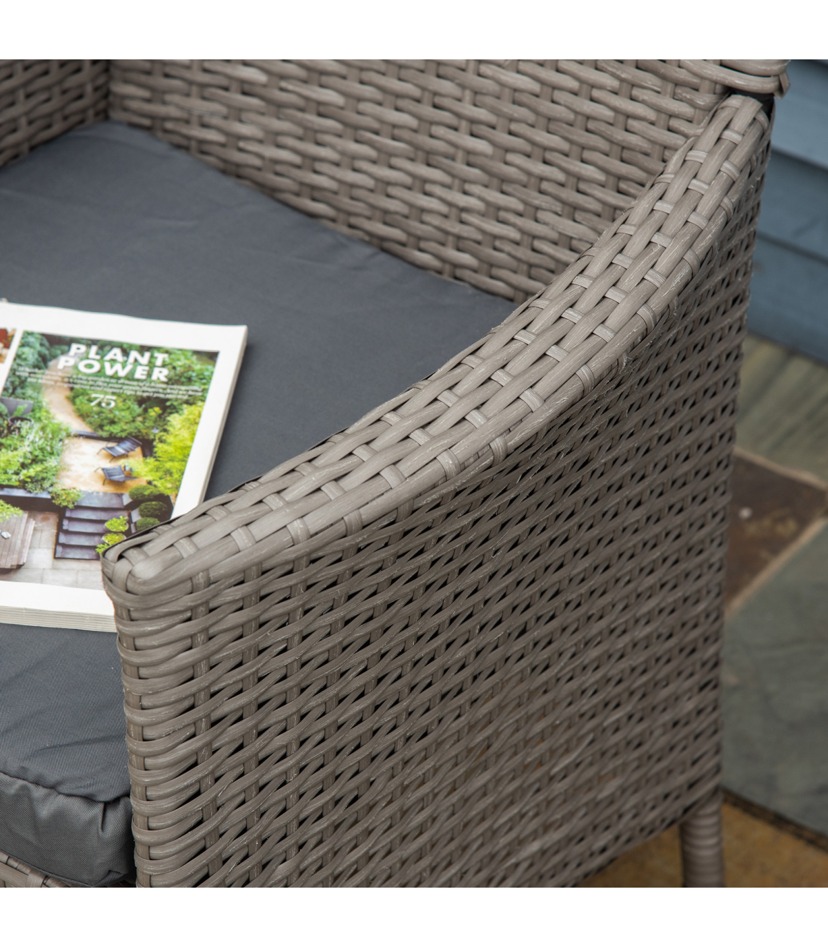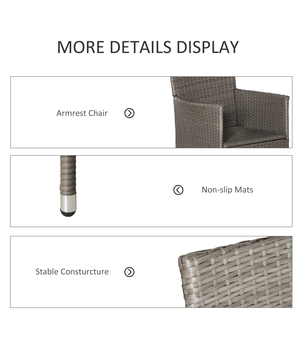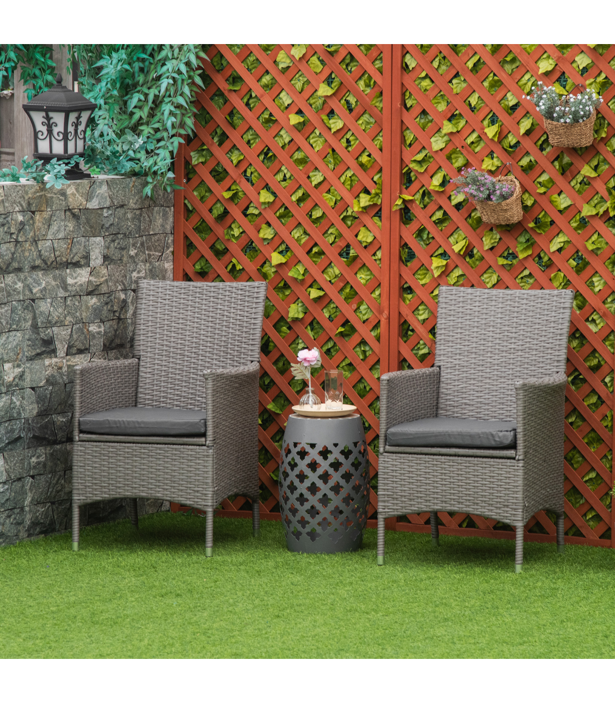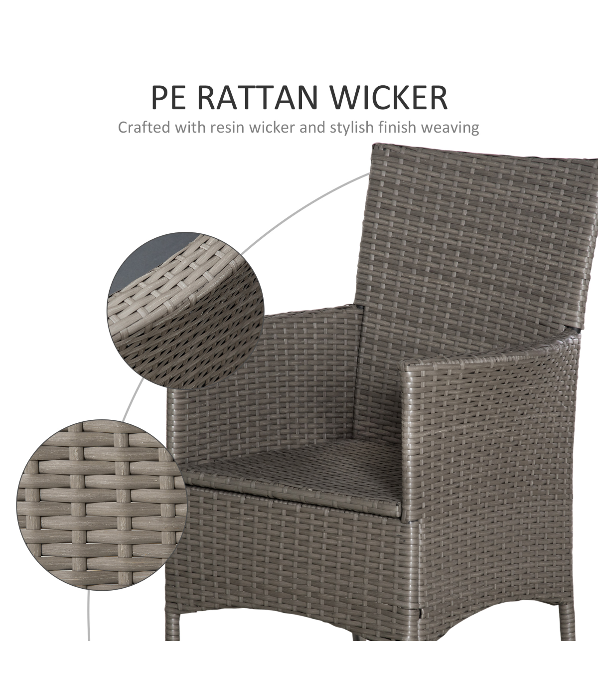 Introducing the Outsunny 2 Seater Grey Rattan Garden Chairs - a perfect blend of style, comfort, and durability for your outdoor spaces. Crafted with a strong galvanized metal frame and wrapped in resilient plastic rattan, these chairs promise longevity and are designed to withstand the elements. The set includes two chairs, each featuring tall backs and armrests for maximum comfort, complemented by 5cm thick padded seat cushions. Whether used alone or paired with other furniture sets, these rattan dining chairs are an ideal choice for enhancing your garden, patio, or any outdoor area. Start your season with elegance and comfort with this stylish two-part set.