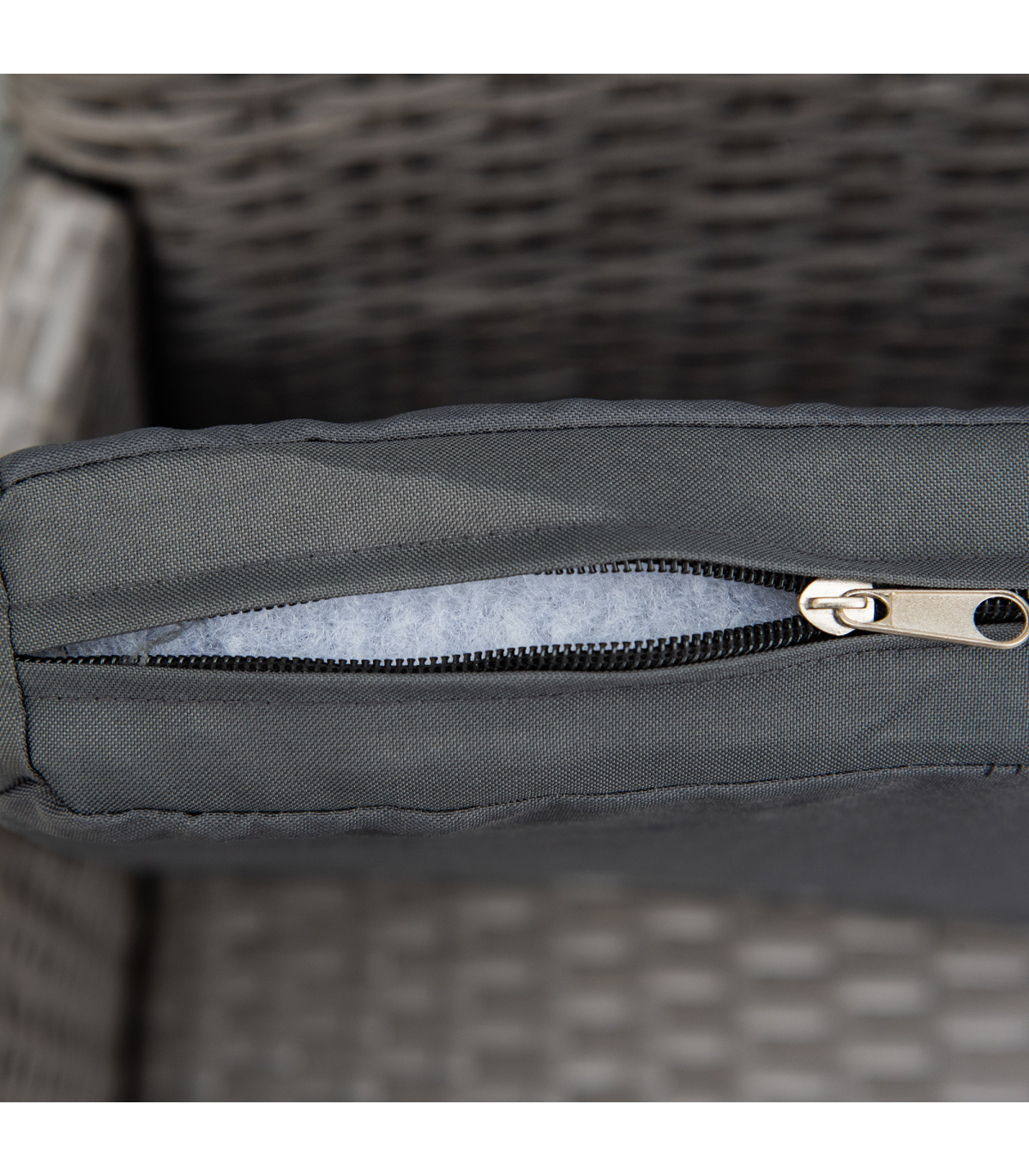 - Material: Galvanized metal, plastic rattan, fabric cushion