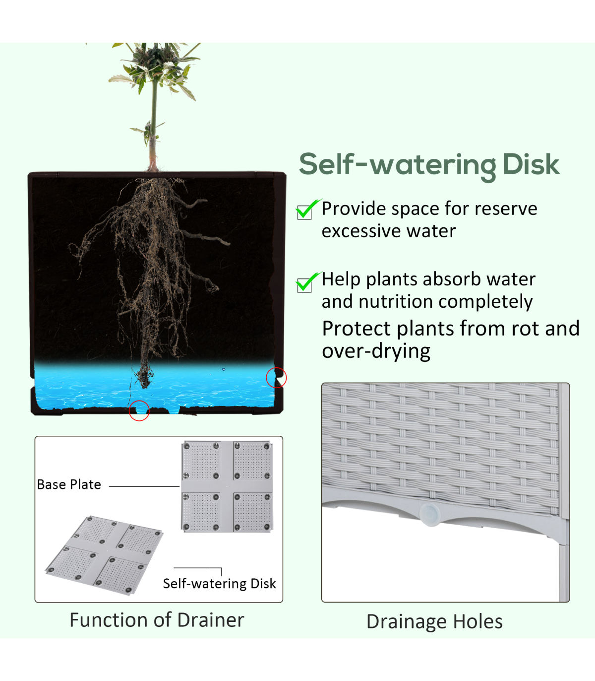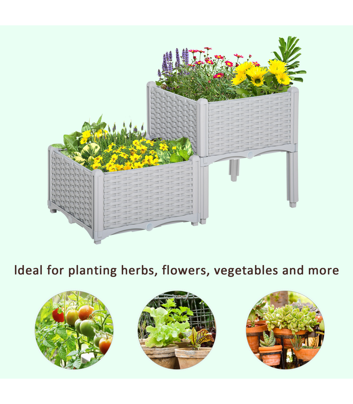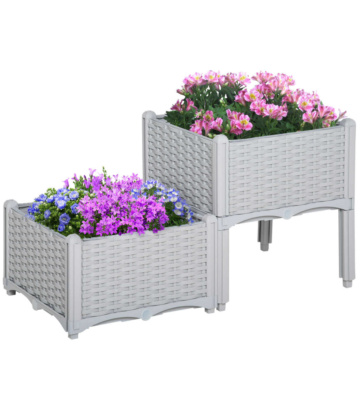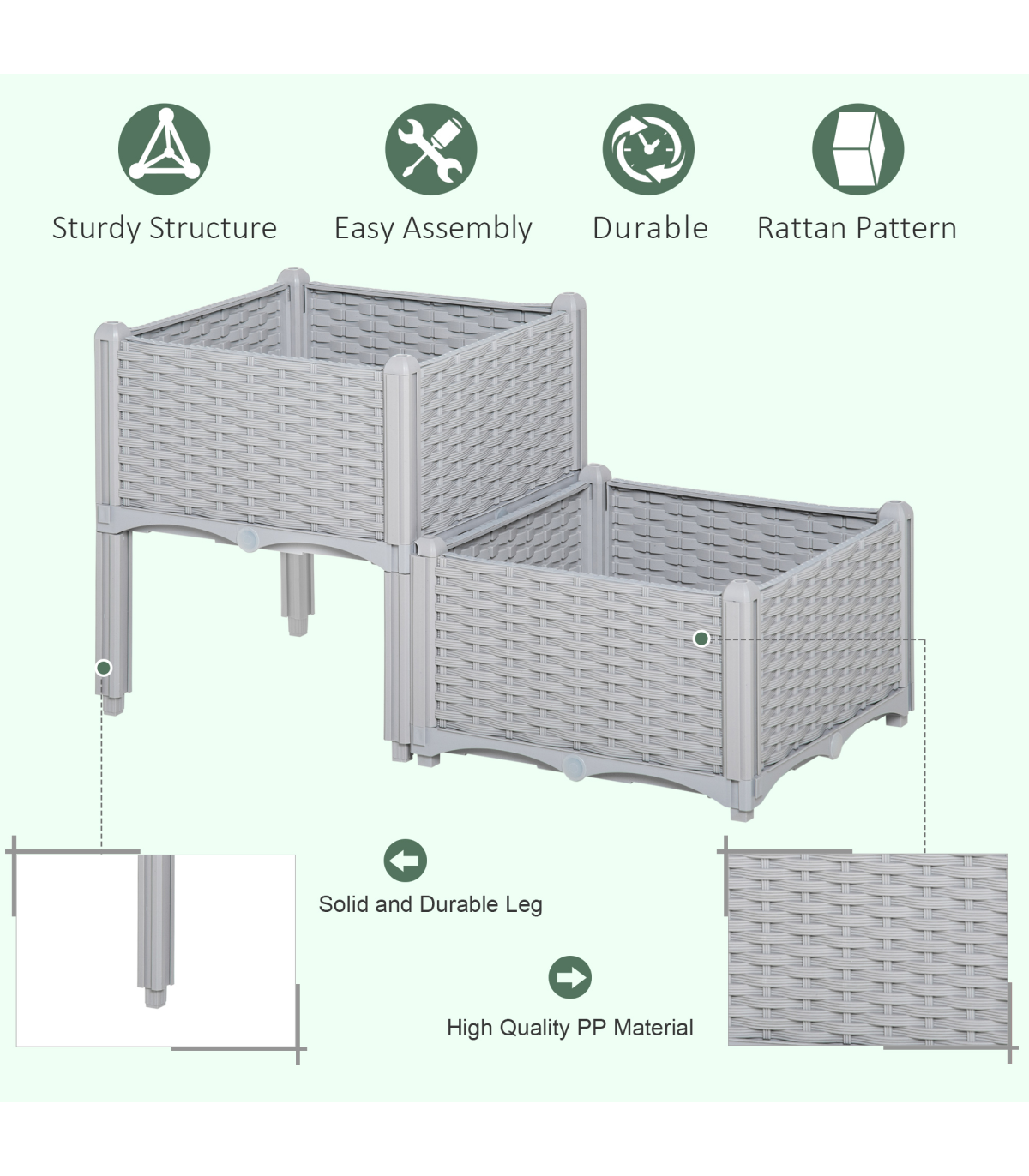 Description: Give your greenery the perfect new home – this duo plant stand from Outsunny. A two-tier design, which is ideal for organizing your plants and separating them if needed. The frame is formed from tough and thick plastic to ensure lasting use outdoors, finished in a rattan-effect look to blend in beautifully with your other garden furniture. Consisting of two pieces, the set is easy to set up and can be stored away easily. You can even buy multiple pieces to build for more display if needed. Each holder has a self-water disc at the bottom, which holds extra water to prevent overfeeding your plants. It also releases liquids when needed, keeping your plants well nourished and allowing them to grow beautifully all year round. The planter box has drainage holes for excess water and thick legs for balance and stability.