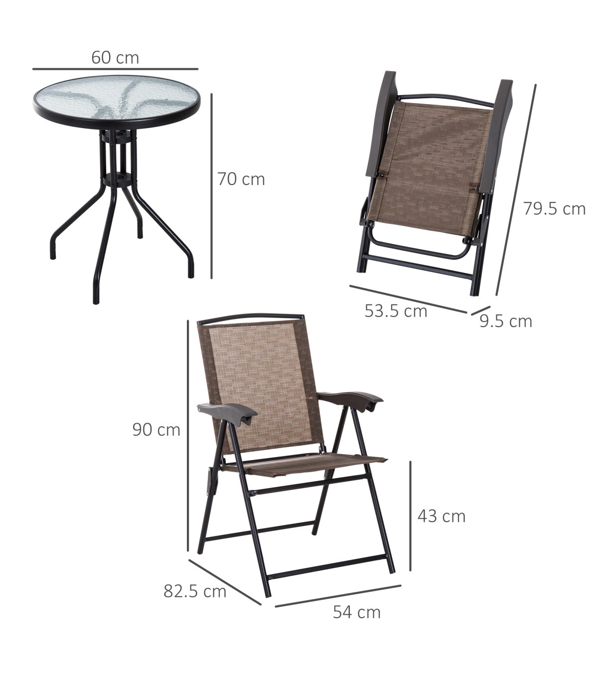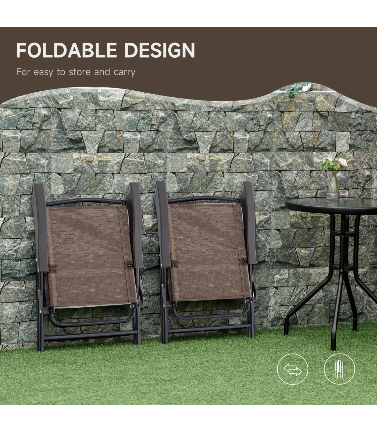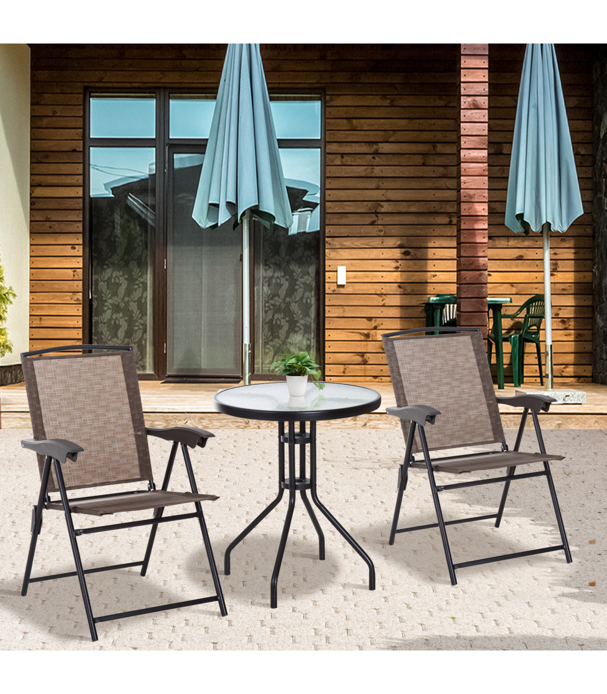 3PC Brown Mesh Patio Set: Folding Chairs, Tempered Glass Table