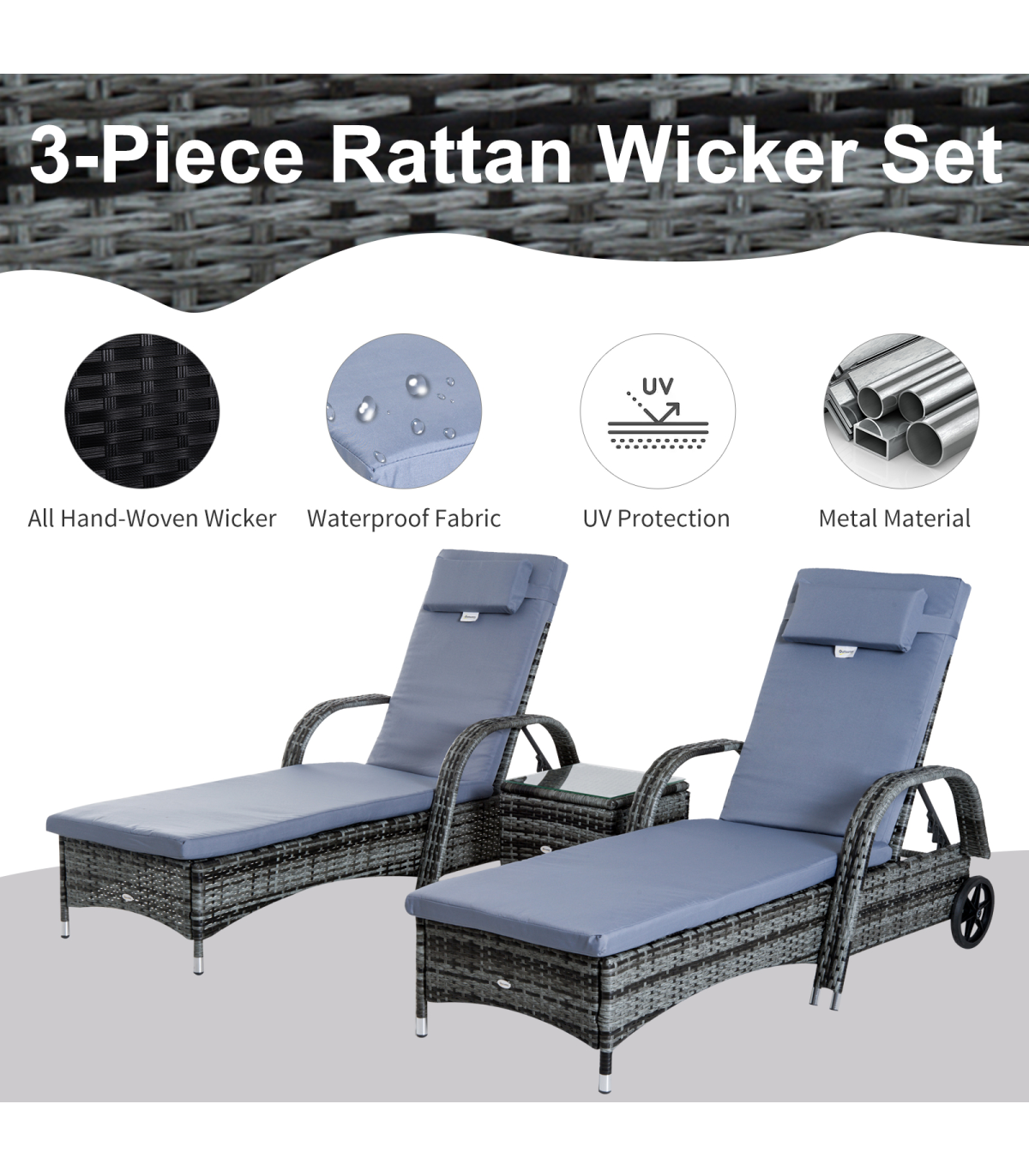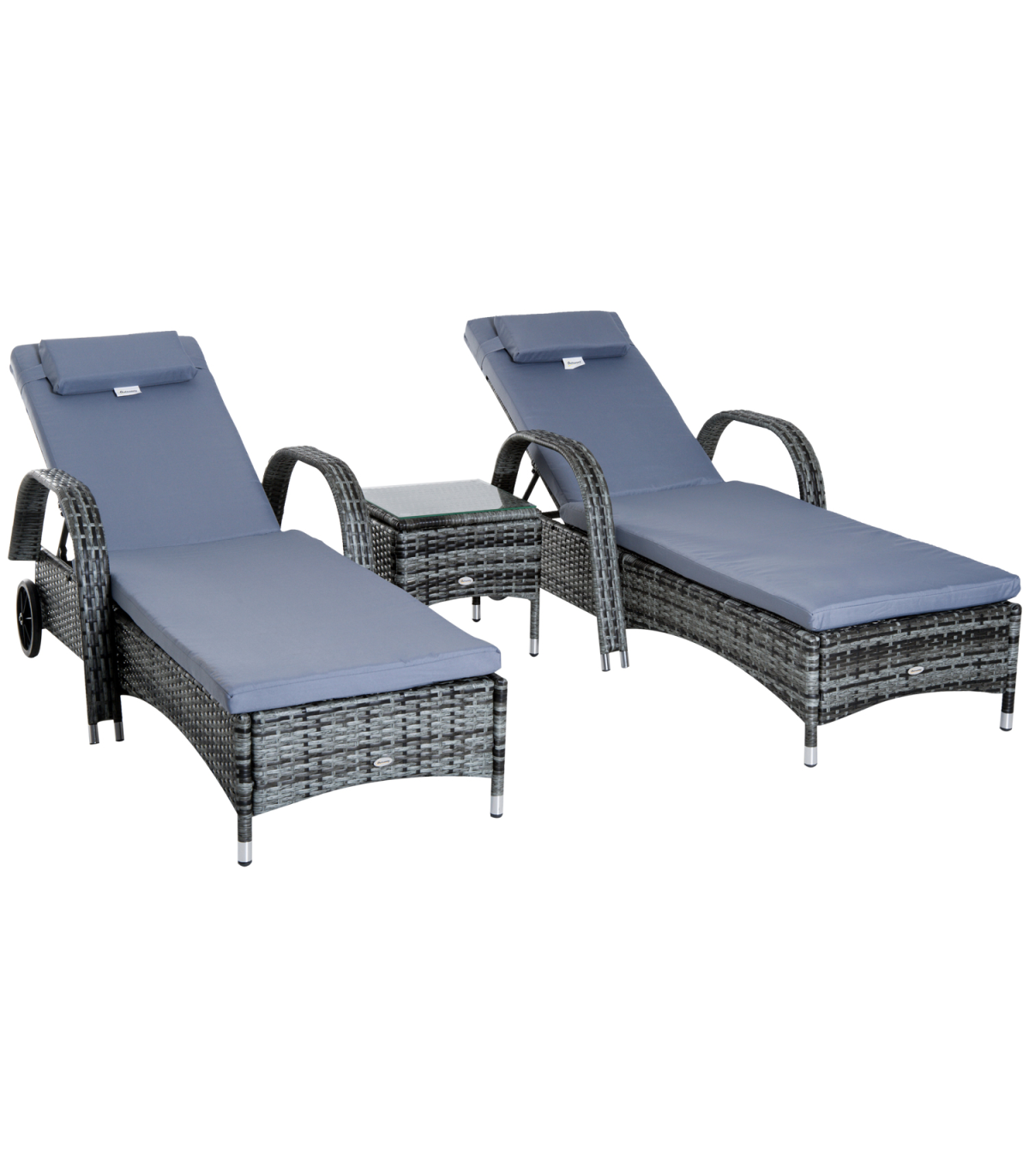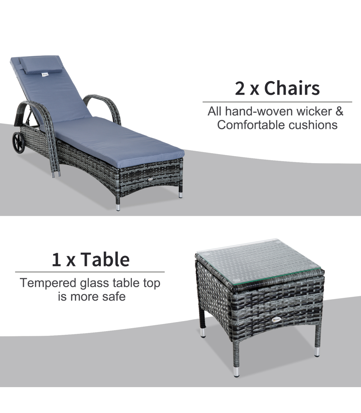 The rattan lounger set from Outsunny comes complete with 2 loungers, 1 side table and cushions. The seat has 5 adjustable positions to give maximum relaxation and comfort. The side table also has a glass top to keep your drinks at easy reach, and the set can be used indoors and outdoors.