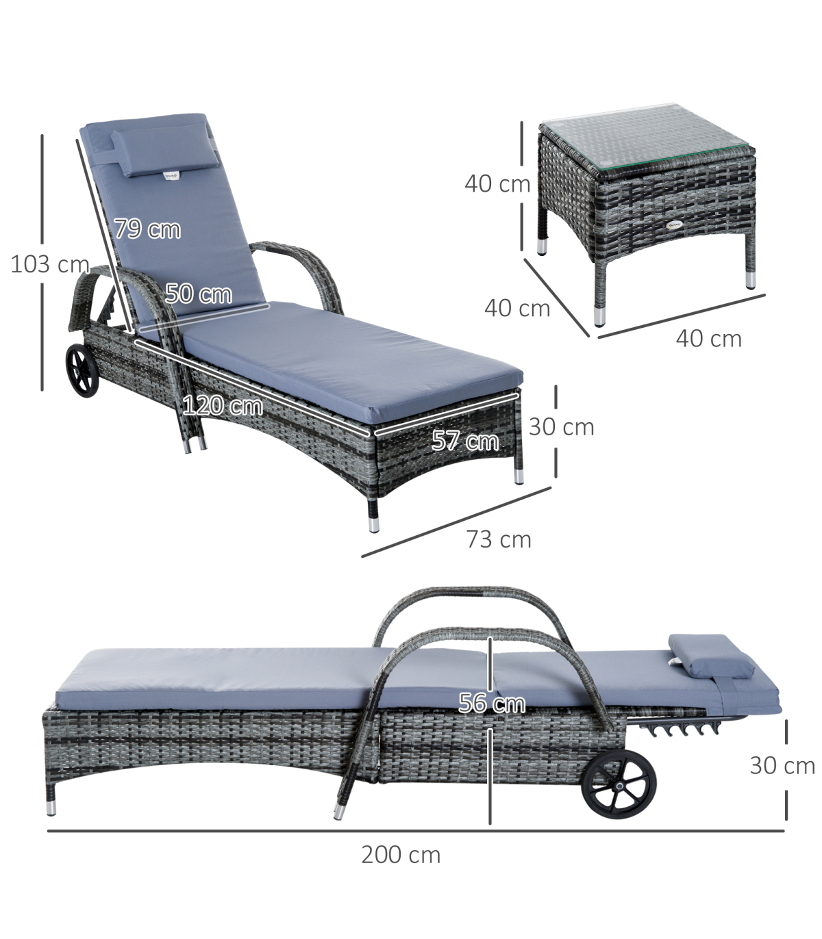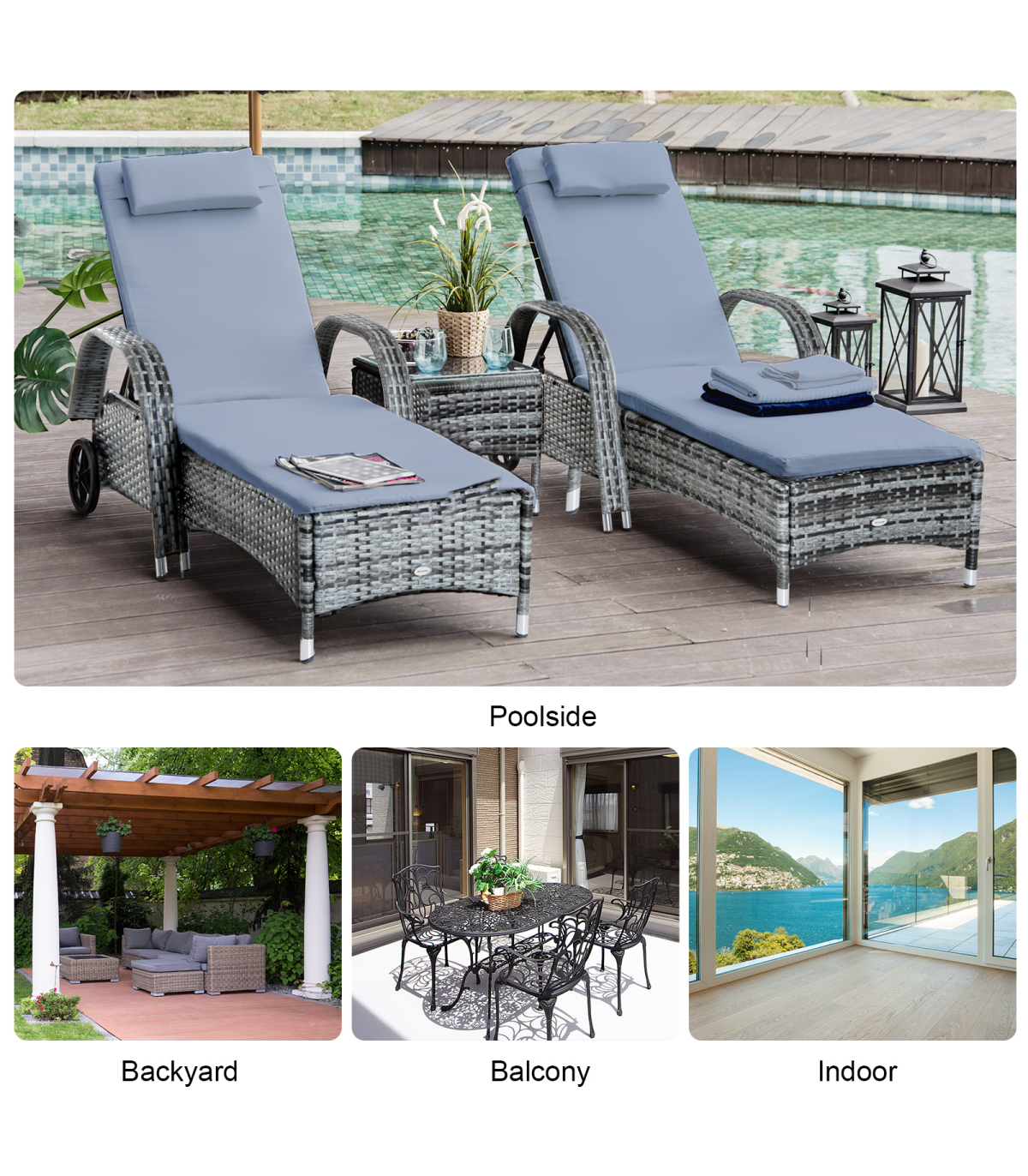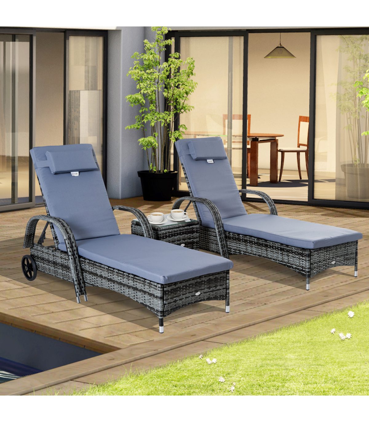 The rattan lounger set from Outsunny comes complete with 2 loungers, 1 side table and cushions. The seat has 5 adjustable positions to give maximum relaxation and comfort. The side table also has a glass top to keep your drinks at easy reach, and the set can be used indoors and outdoors.