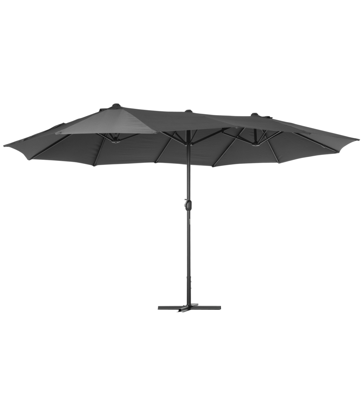 Enhance your outdoor space with this practical and stylish 4.6m Garden Patio Umbrella Canopy from Outsunny. The bright grey color and double canopy design provide both functionality and style. Made from durable metal, this umbrella is built to last. The 4.6M diameter ensures complete coverage throughout the day, while the 12 ribs connecting the canopy to the pole offer added support. The crank lift mechanism allows for easy opening and closing. Additionally, the UV, light water, and fade resistant canopy make this umbrella perfect for any weather condition. Please note that assembly is required and the cross base is included, but the counter weight is excluded.