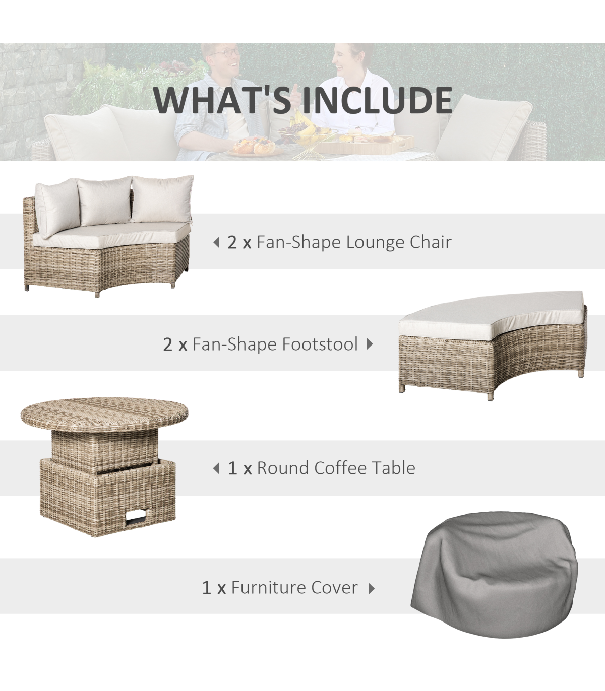- Set includes two fan-shaped sofas, two fan-shaped footstools, and a middle table