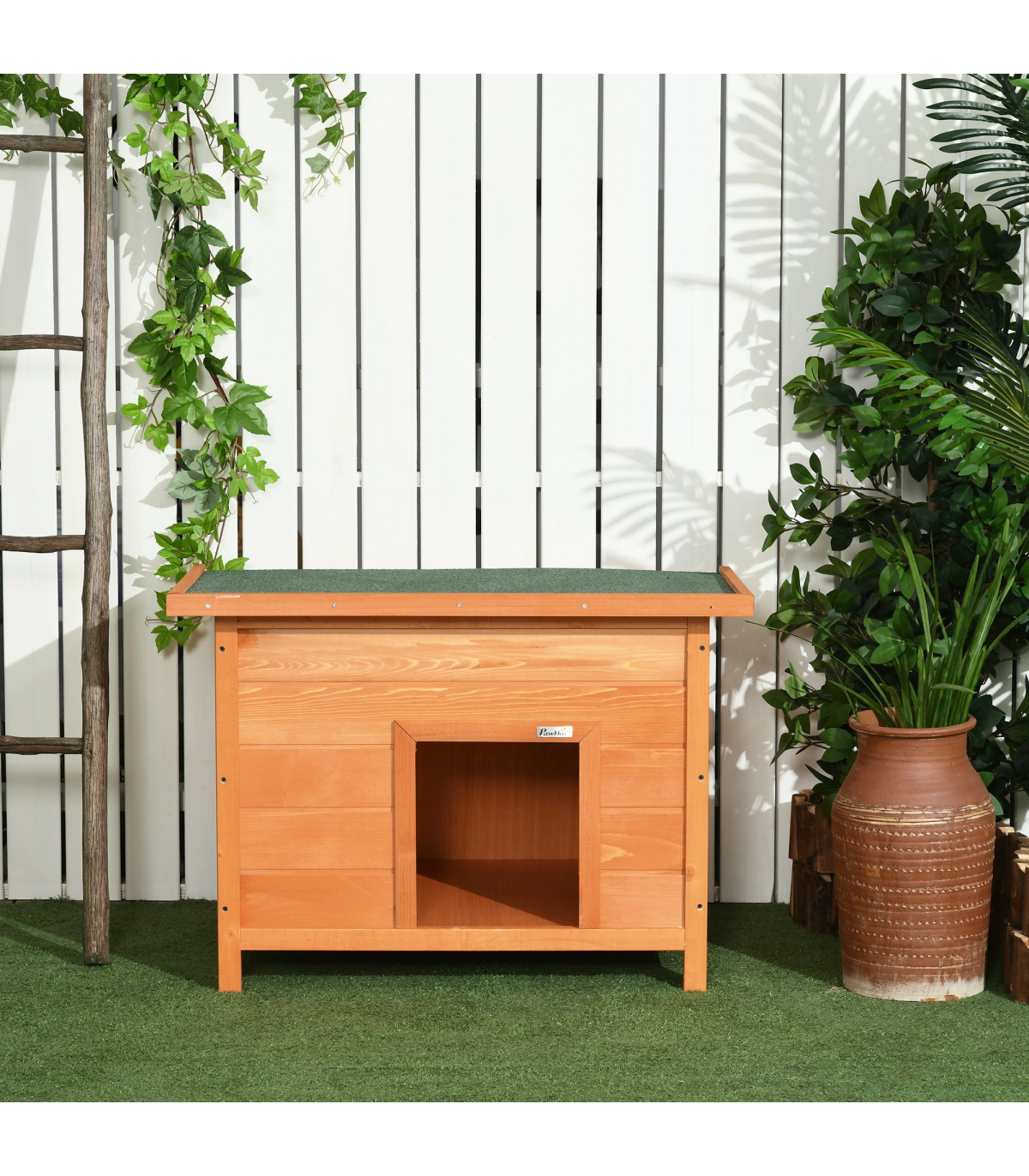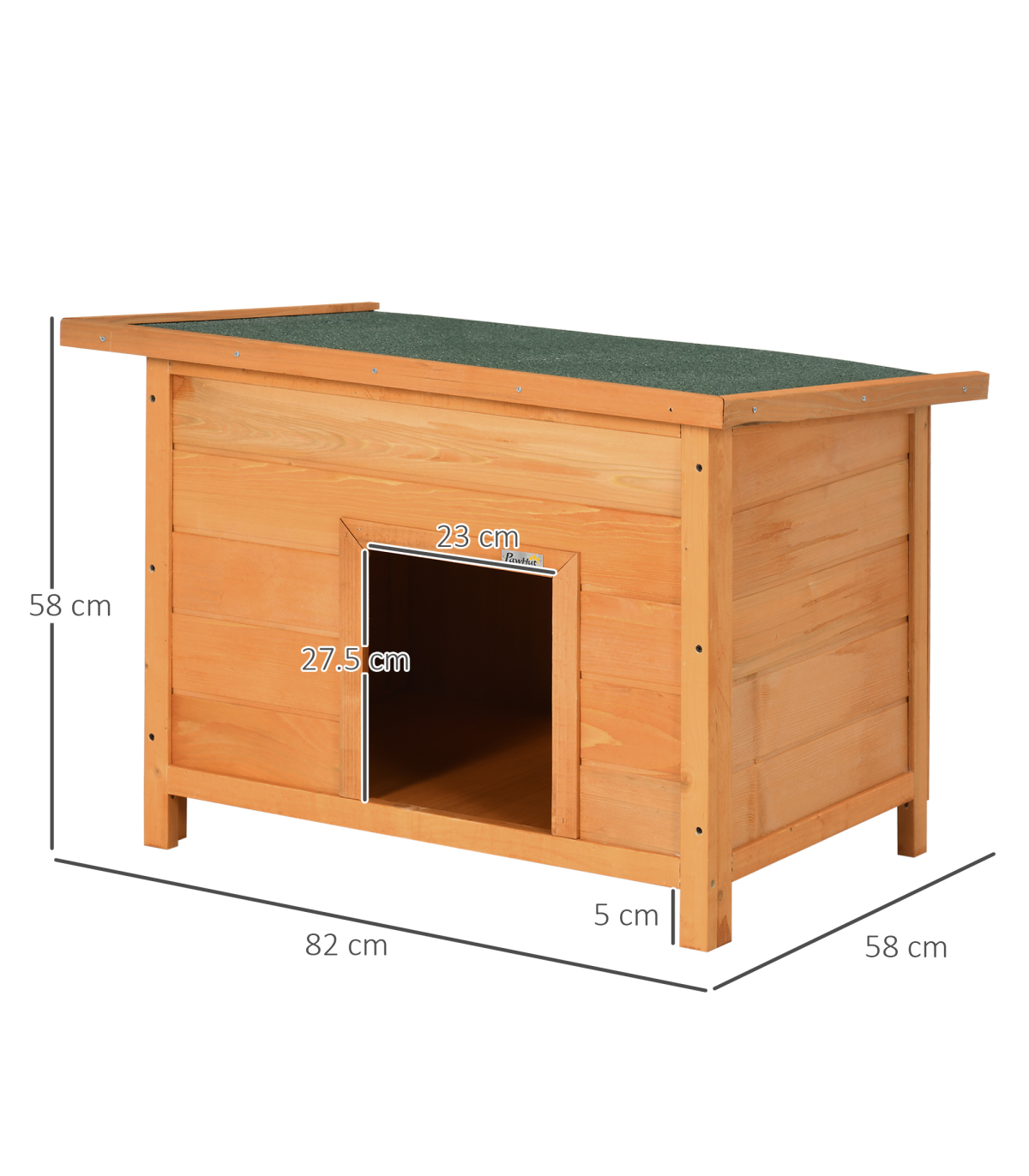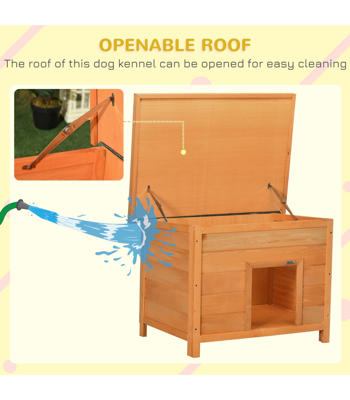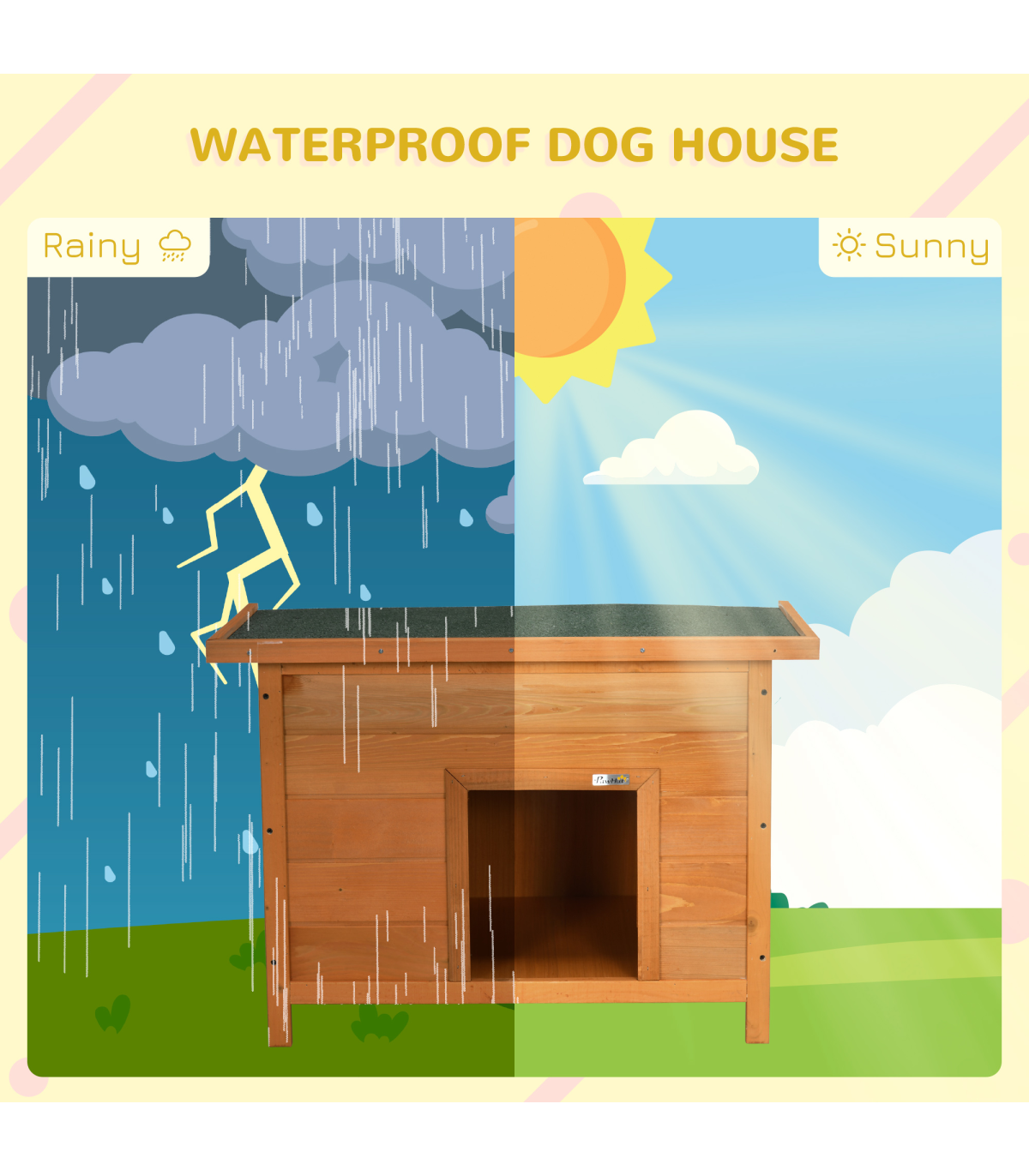 This PawHut Dog Kennel provides your dogs with a comfortable and cozy shelter they dream of. Built of the solid and weather-resistant fir wood, our wooden dog kennel is made for years of use with very little maintenance. The elevated floor can keep the floor warm and dry in the winter and cool in the summer. The cleaning work can be quite easy as you just need to open the roof and clean the dirt out. With the slant asphaltic roof, this puppy pen is in excellent drainage.