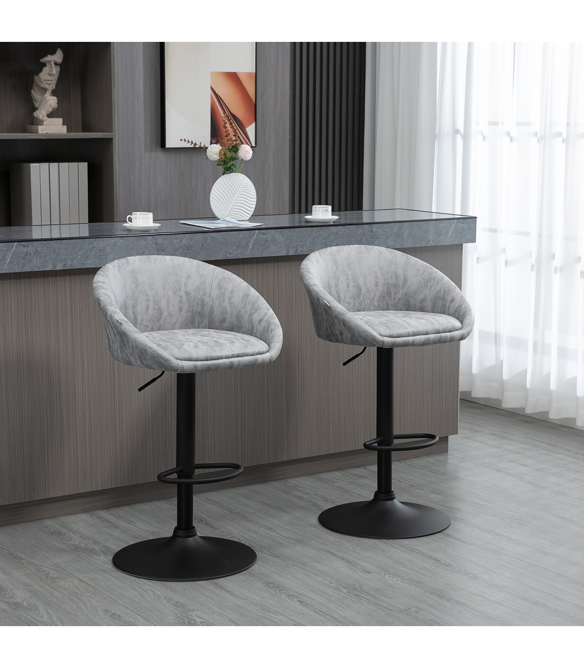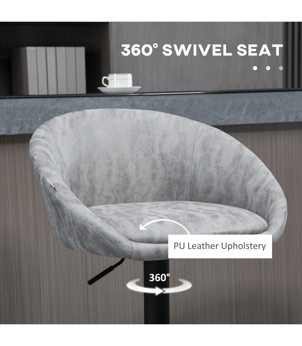 Enhance your home dining areas with this set of two trendy modern bar stools. Whether used together for a matching look or separately as accent chairs, these bar stools are sure to elevate your space. The adjustable seat height of 62-82cm allows you to find the perfect position for different countertops and breakfast bars. The padded seats, curved backs, and sloped armrests provide optimal support, while the soft PU upholstery adds a touch of luxury.