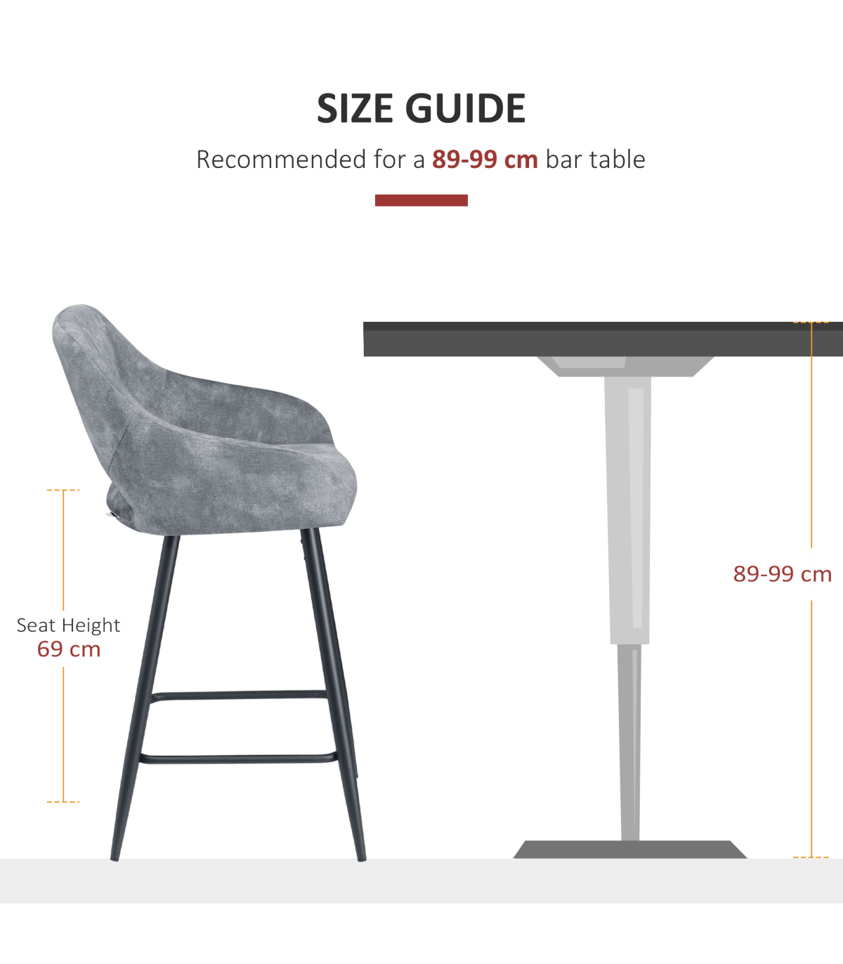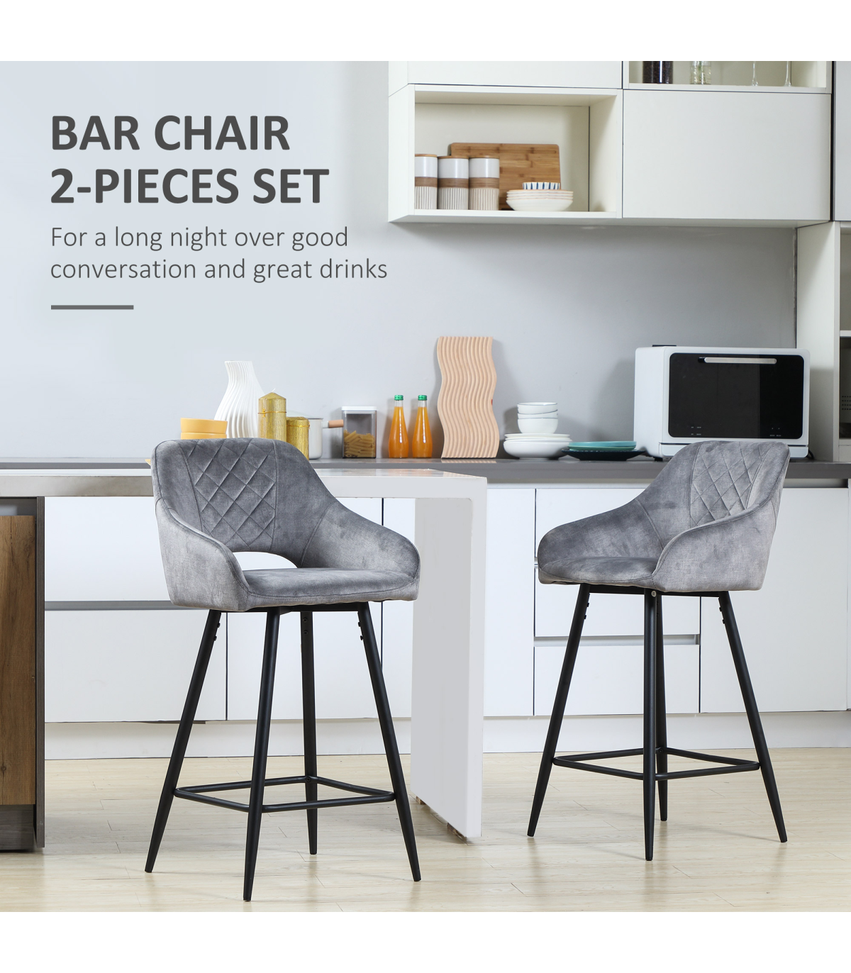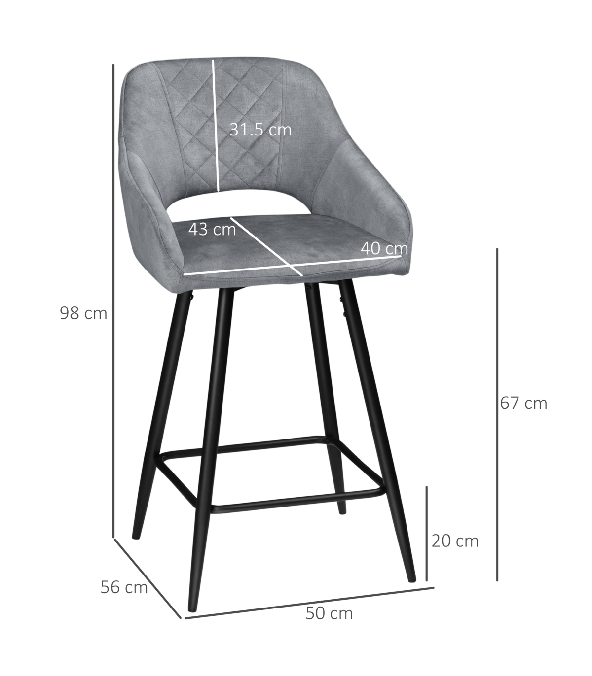 Elevate your dining or kitchen area with this exquisite set of 2 grey velvet-touch bar stools from HOMCOM. Designed to blend seamlessly into any decor, these stools feature a luxurious velvet-feel fabric that is both beautiful and comfortable. The tub-shaped seats are complemented by high backs and armrests, providing ample space and support for a relaxing seating experience. Each stool is equipped with a sturdy metal base, ensuring stability and durability, while the integrated footrest offers additional comfort. Whether you're enjoying a quick breakfast or entertaining guests, these bar stools will add a touch of elegance and sophistication to your space. Specifications: