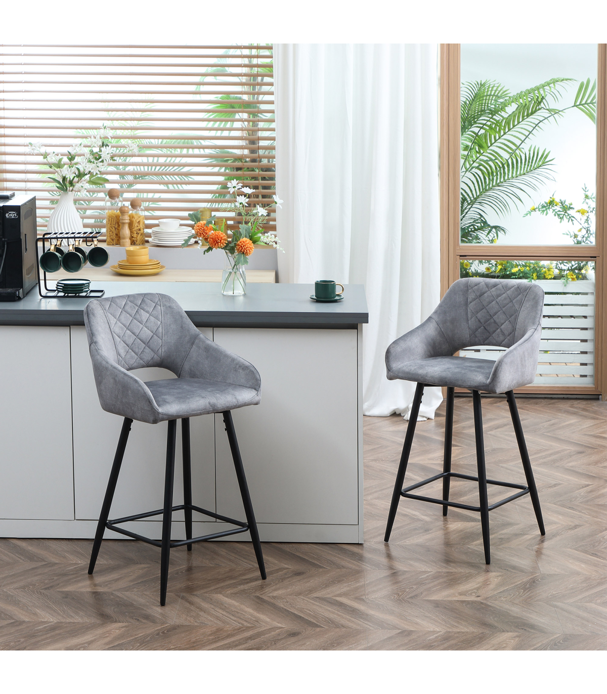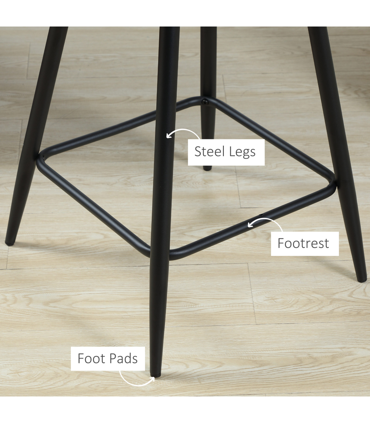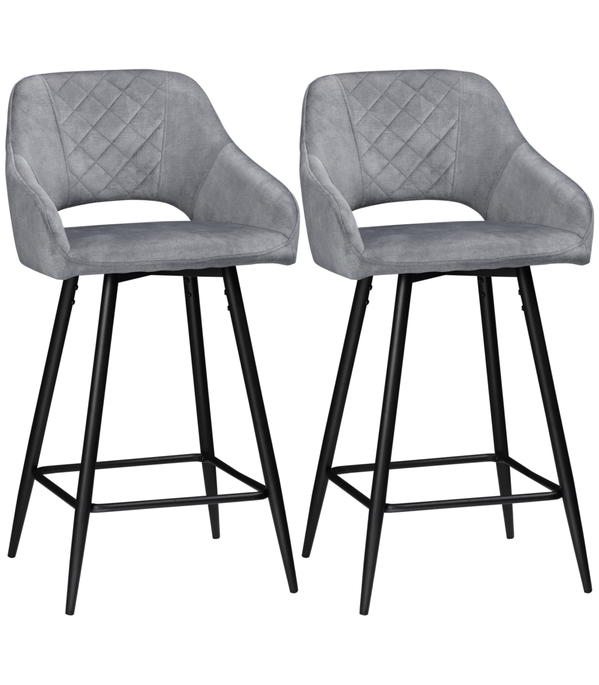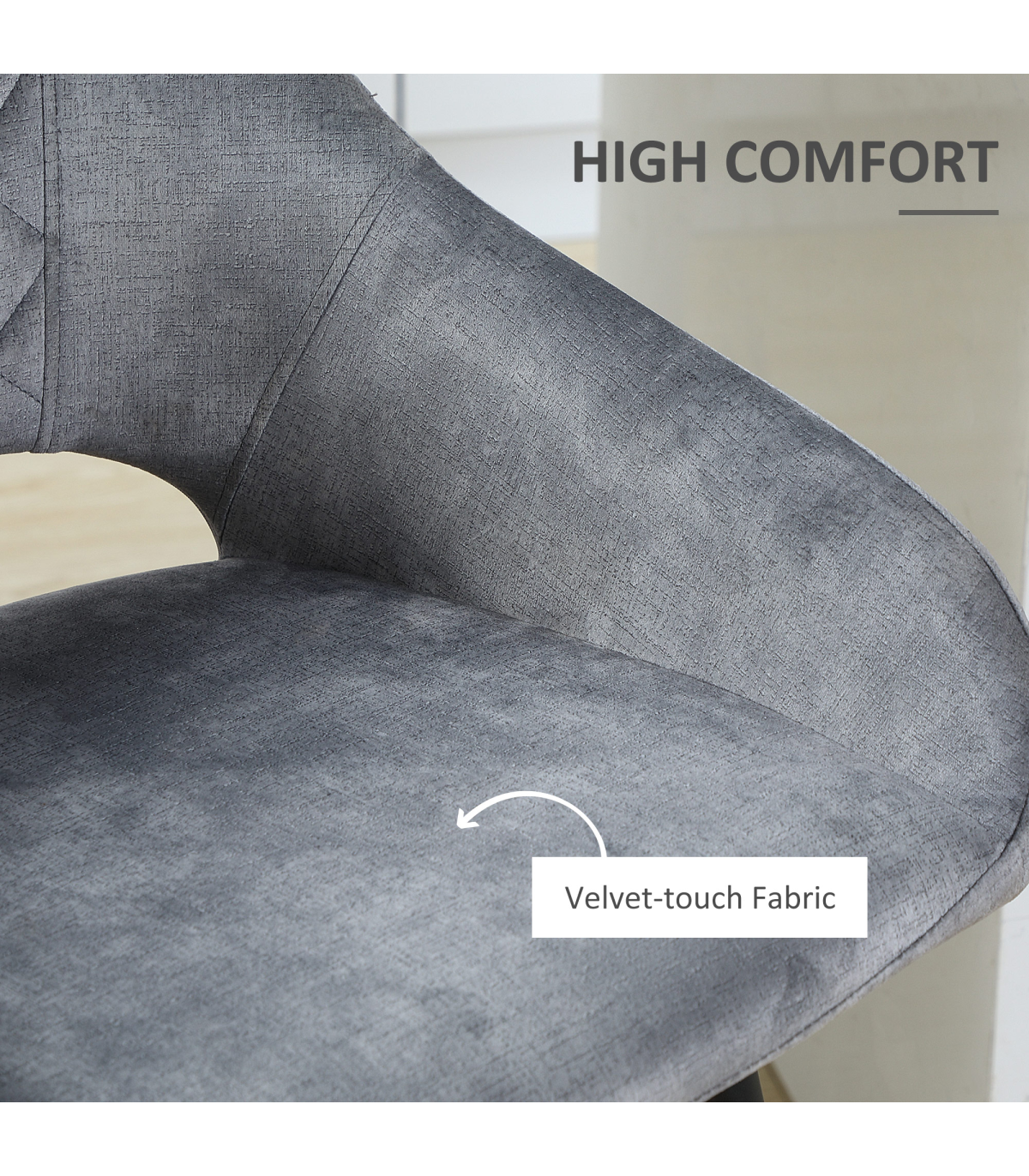 Elevate your dining or kitchen area with this exquisite set of 2 grey velvet-touch bar stools from HOMCOM. Designed to blend seamlessly into any decor, these stools feature a luxurious velvet-feel fabric that is both beautiful and comfortable. The tub-shaped seats are complemented by high backs and armrests, providing ample space and support for a relaxing seating experience. Each stool is equipped with a sturdy metal base, ensuring stability and durability, while the integrated footrest offers additional comfort. Whether you're enjoying a quick breakfast or entertaining guests, these bar stools will add a touch of elegance and sophistication to your space. Specifications: