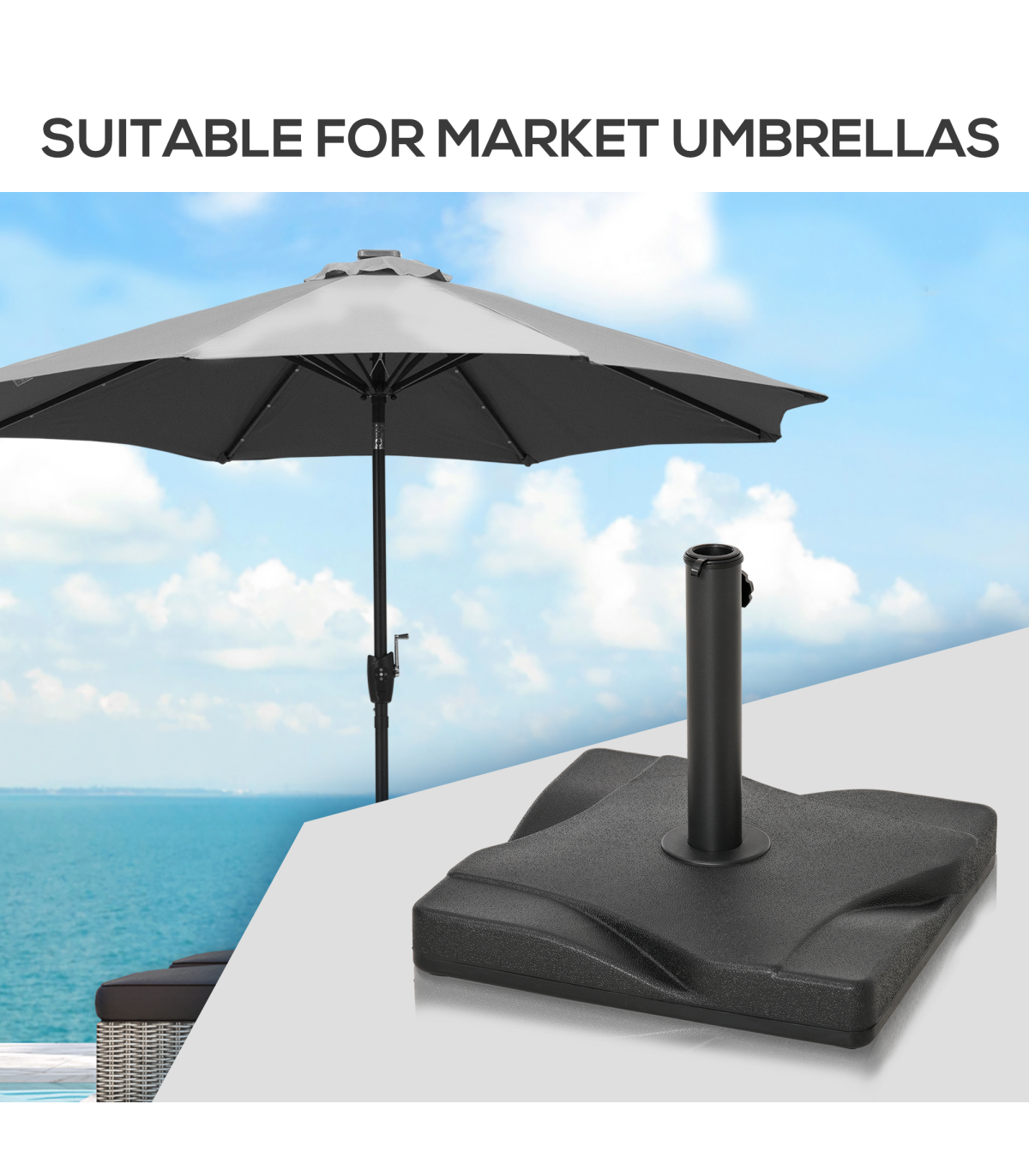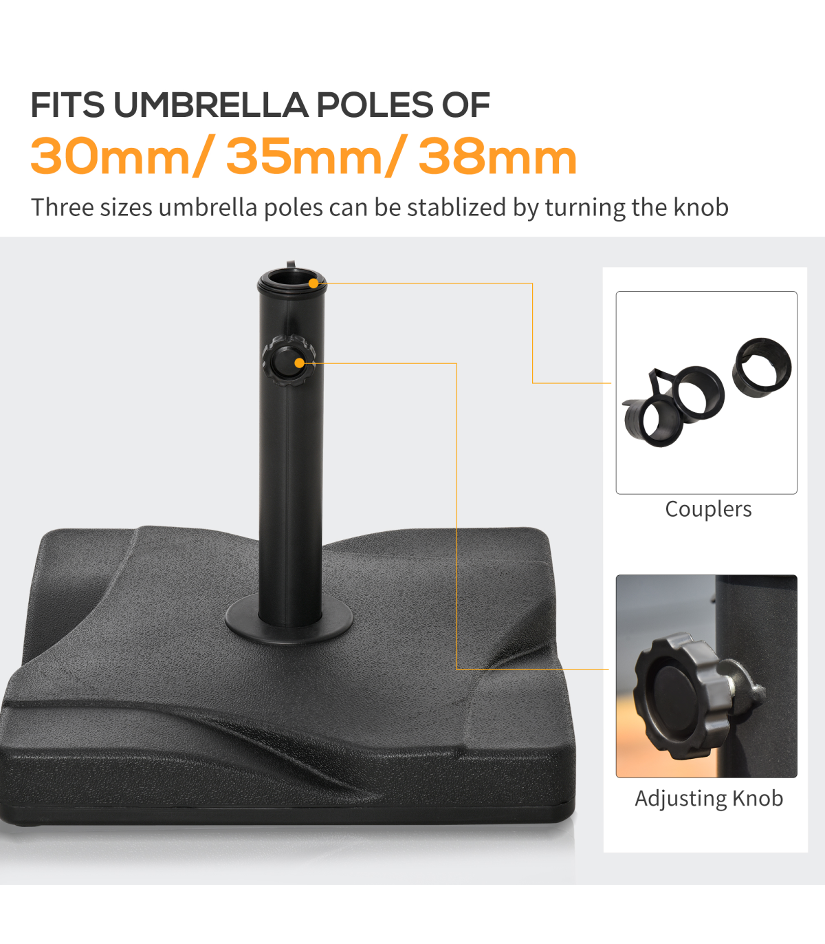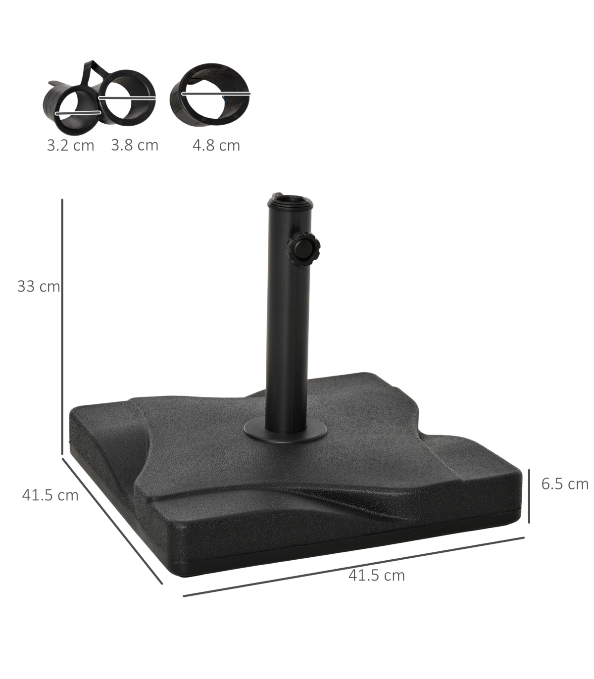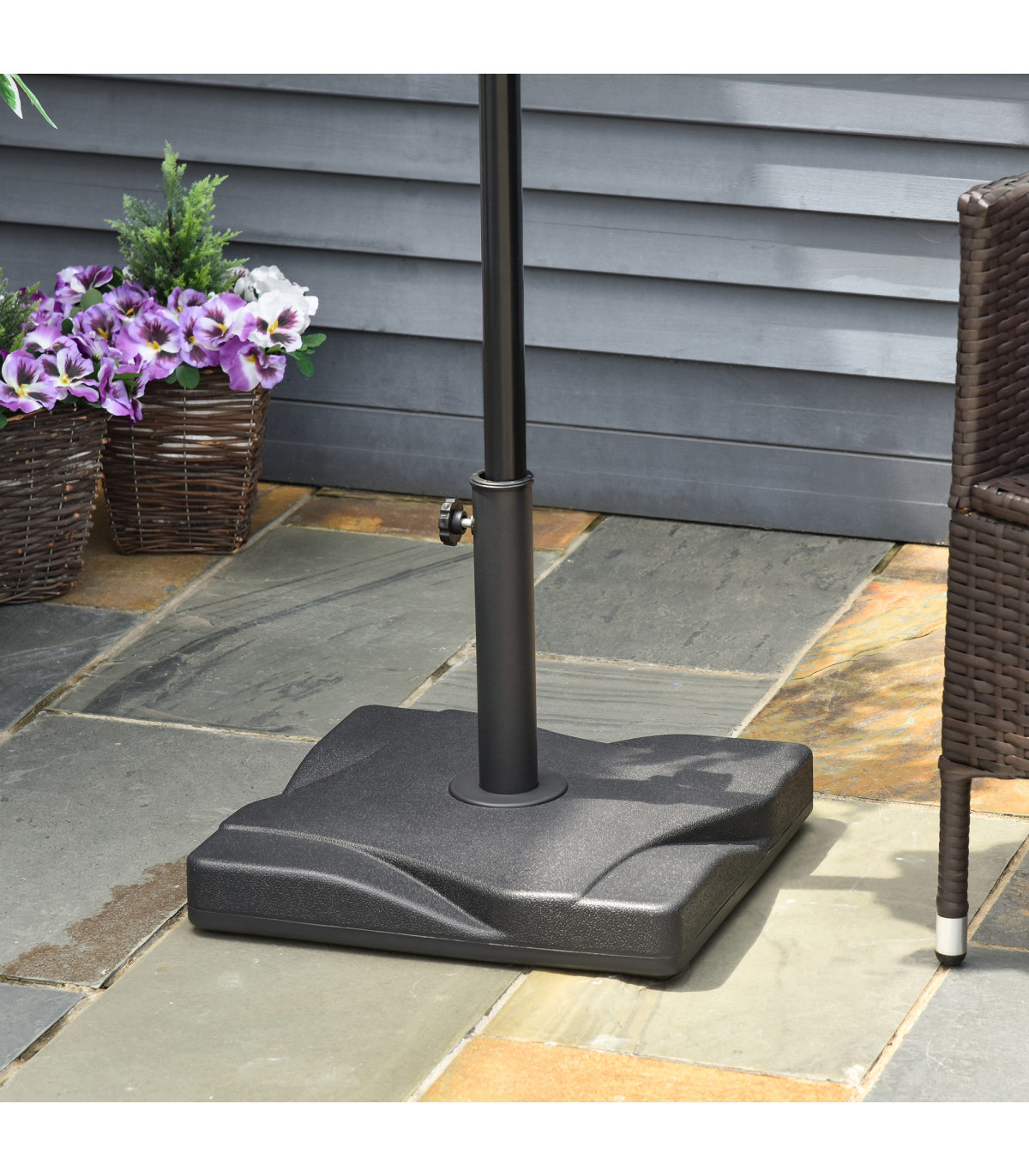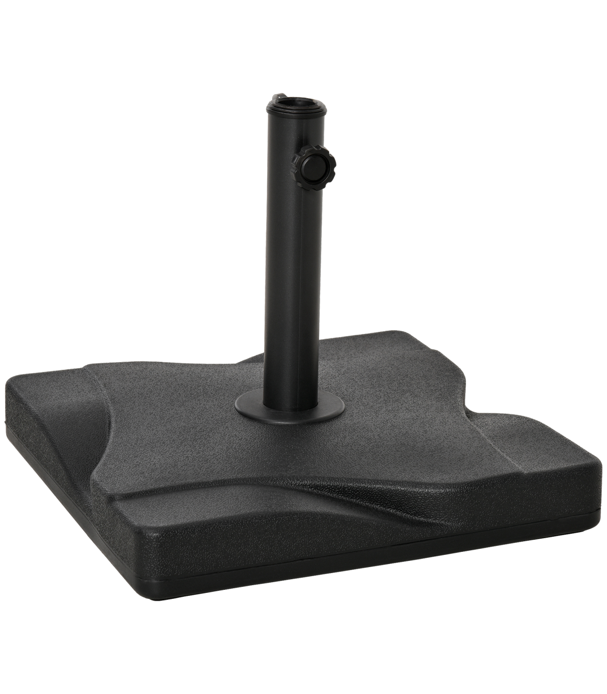 Keep your parasol umbrella securely in place with this Cement Outdoor Garden Square Parasol Base in Black from Outsunny. The base is constructed with a durable blend of thick plastic shell and cement filling, weighing 20kg for stability. It features a shallow square design on the top, adding a touch of style to your outdoor space. The screw fastening on the pole holder ensures that poles with diameters of 30mm, 35mm, and 38mm are securely held in place. This base is perfect for keeping your Outsunny umbrella stable and providing shade from the sun's glare. Easy to assemble, this base is a practical and stylish addition to your garden or patio furniture.