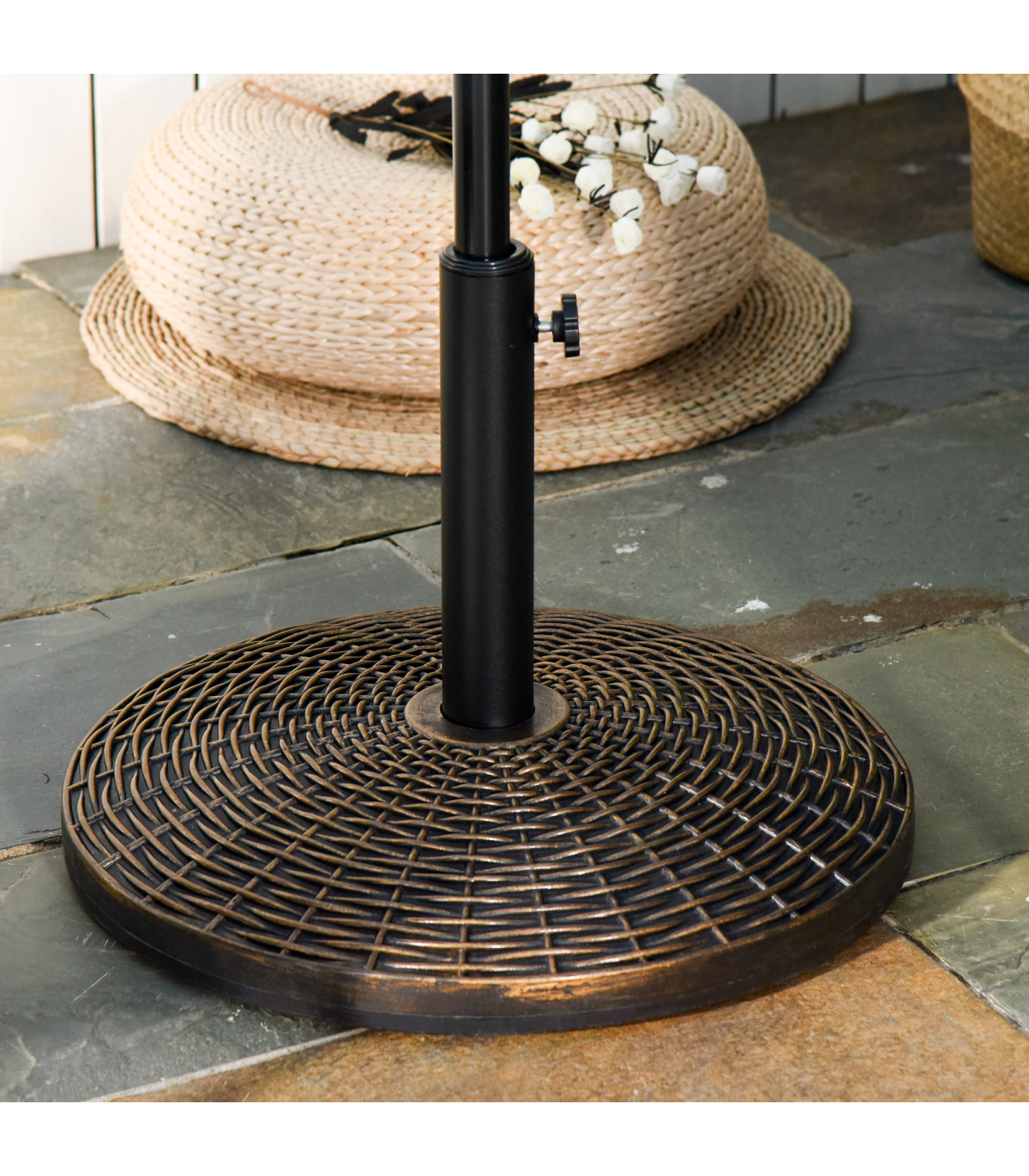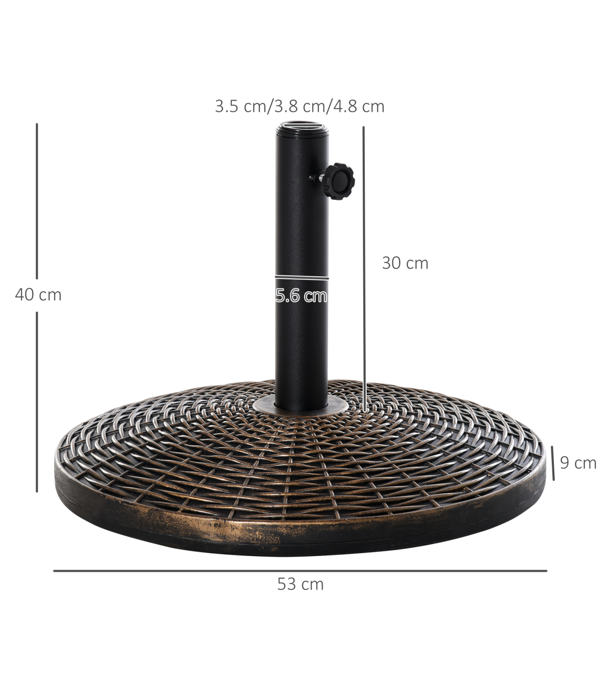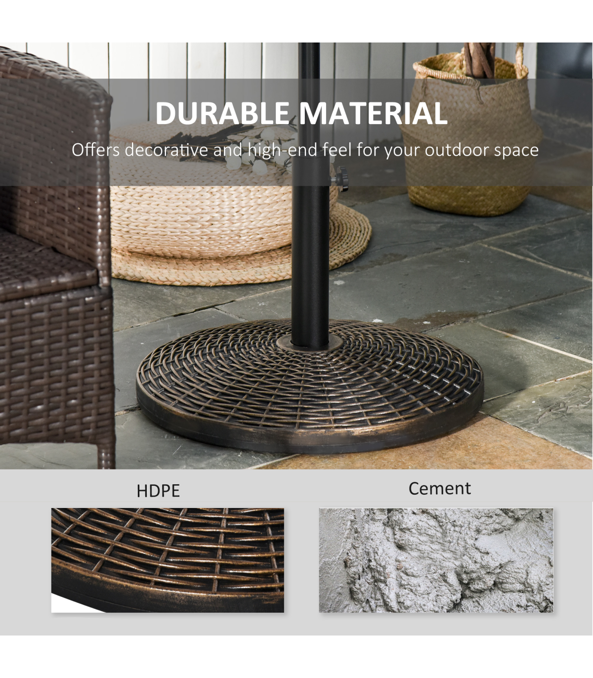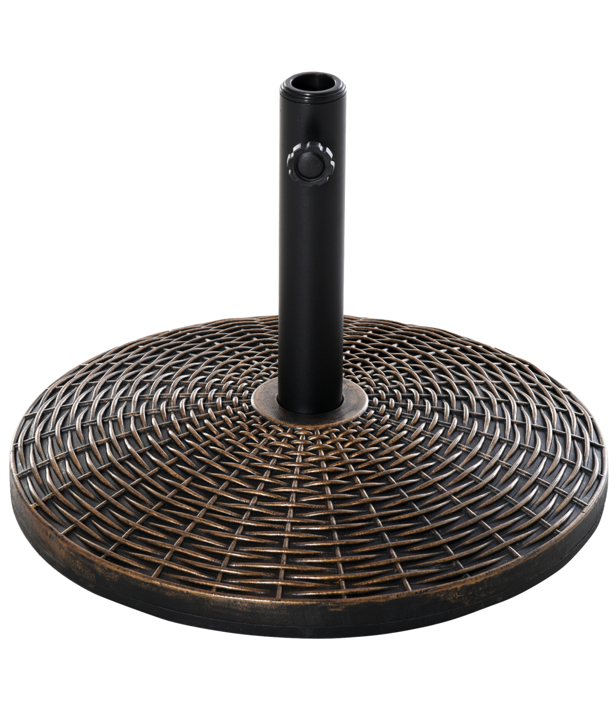 Ensure your parasol is kept firmly in place in all weather conditions with this umbrella base from Outsunny. Made from a combination of HDPE, cement and metal and crafted into a bronze effect rattan finish, it weighs 25kg, meaning it can withstand windy conditions. It is finished with a tightening screw and fits poles up to 48mm in diameter, allowing it to hold the pole securely in place. Strong, stylish and durable, it has been built to let you enjoy the sun with plenty of shade for years to come.