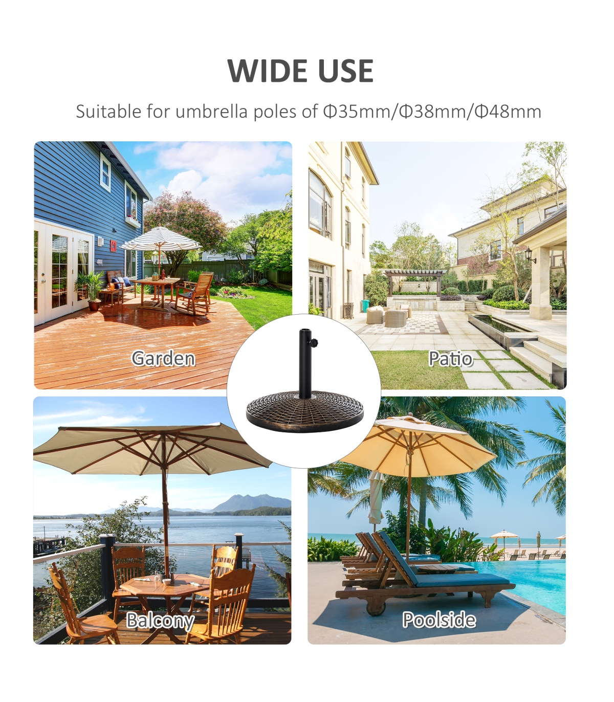- Fits umbrella pole of 35mm/38mm/48mm in diameter, easy to adjust with tightening knob