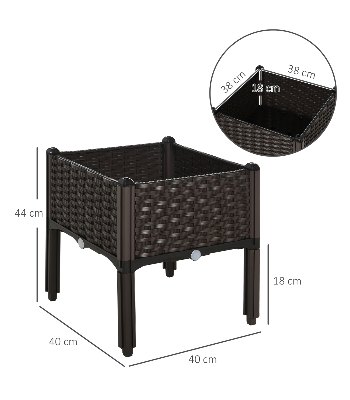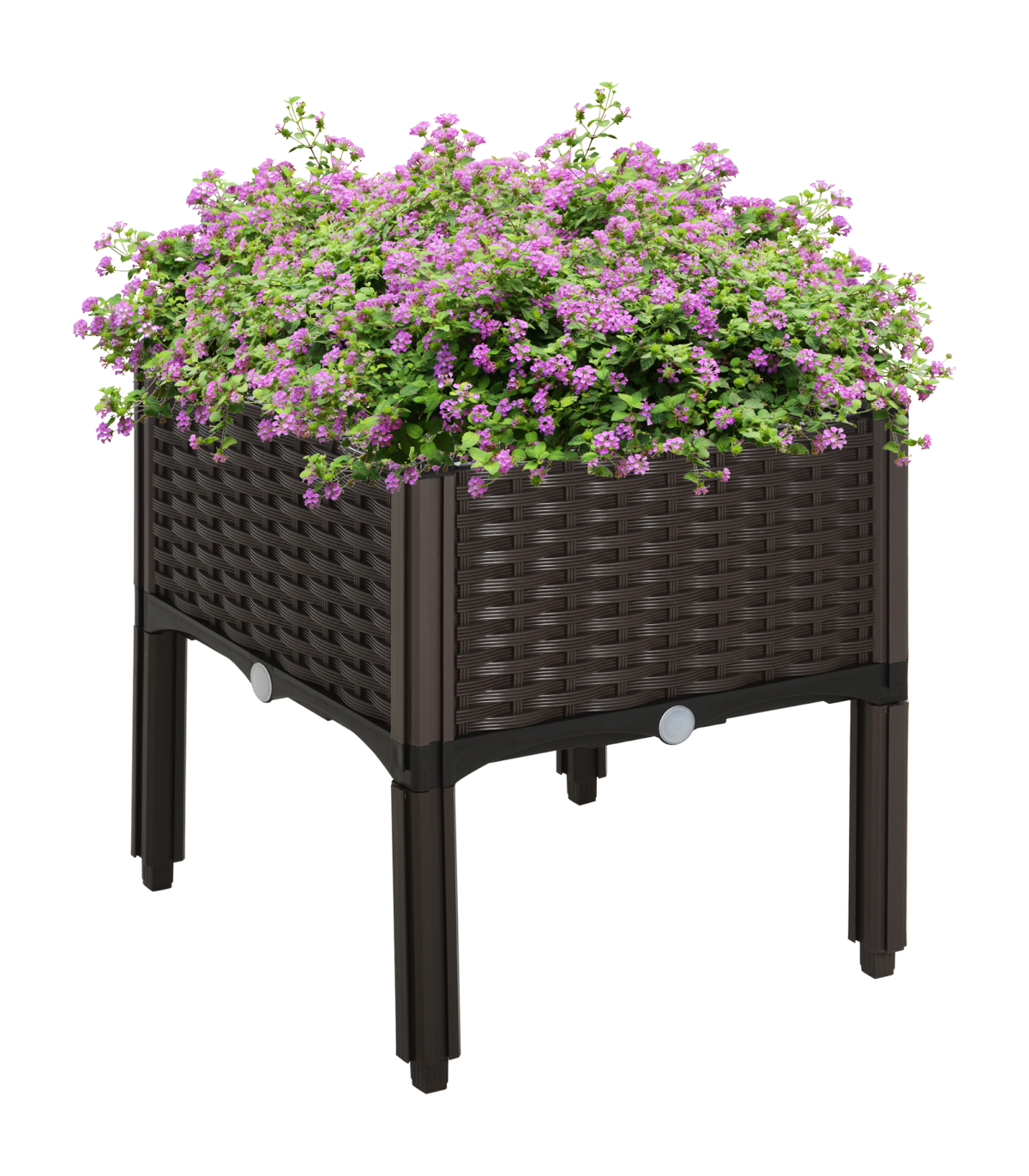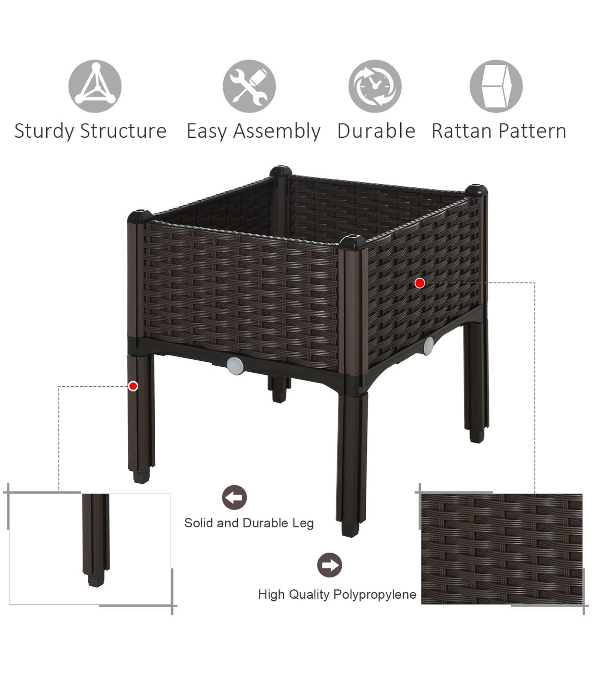 Give your flowers and plants a beautiful place to grow and flourish all year round with this raised bed from Outsunny. Made from thick and rigid plastic, it can withstand heavy weather in all seasons. The frame features a large and spacious square design, providing plenty of room to display a multitude of plants. The rattan-effect finish allows the planter box to blend in seamlessly with your other garden furniture. Raised in height to prevent strain on your back while planting and to protect plants from animals and insects. Includes a self-watering disk to nourish plants without over-watering. Stylish and smart design.