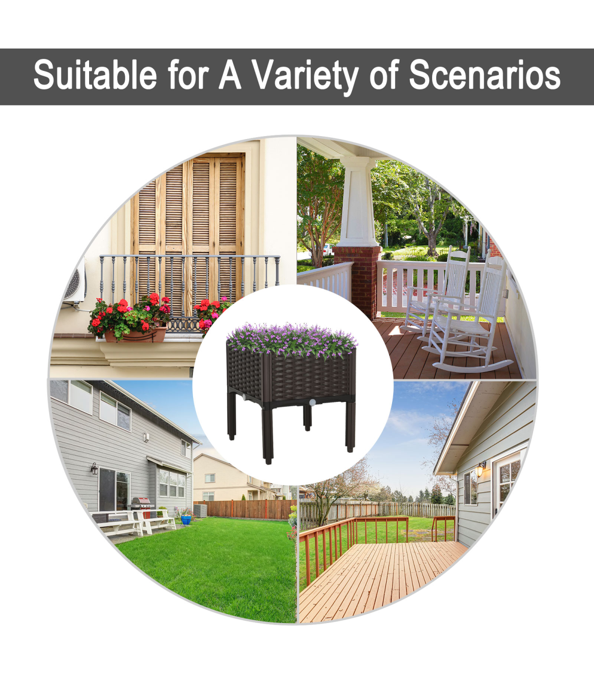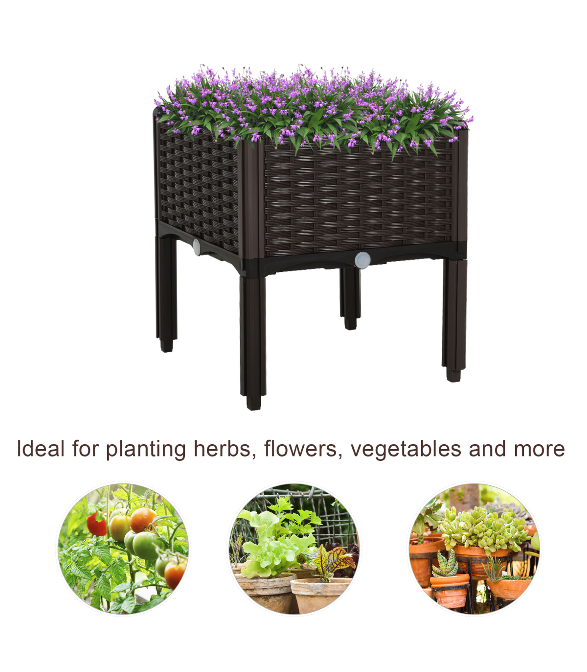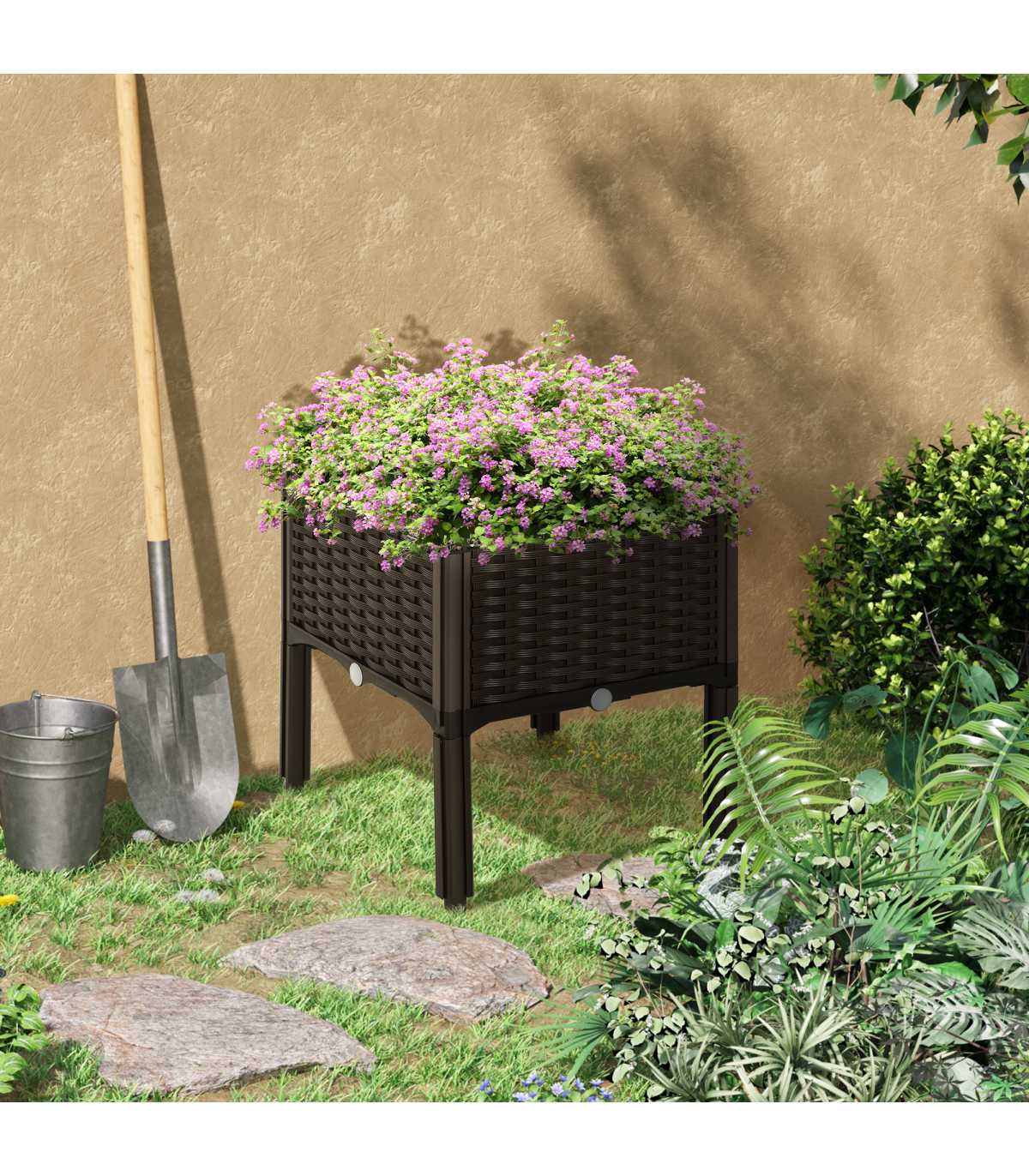 Give your flowers and plants a beautiful place to grow and flourish all year round with this raised bed from Outsunny. Made from thick and rigid plastic, it can withstand heavy weather in all seasons. The frame features a large and spacious square design, providing plenty of room to display a multitude of plants. The rattan-effect finish allows the planter box to blend in seamlessly with your other garden furniture. Raised in height to prevent strain on your back while planting and to protect plants from animals and insects. Includes a self-watering disk to nourish plants without over-watering. Stylish and smart design.