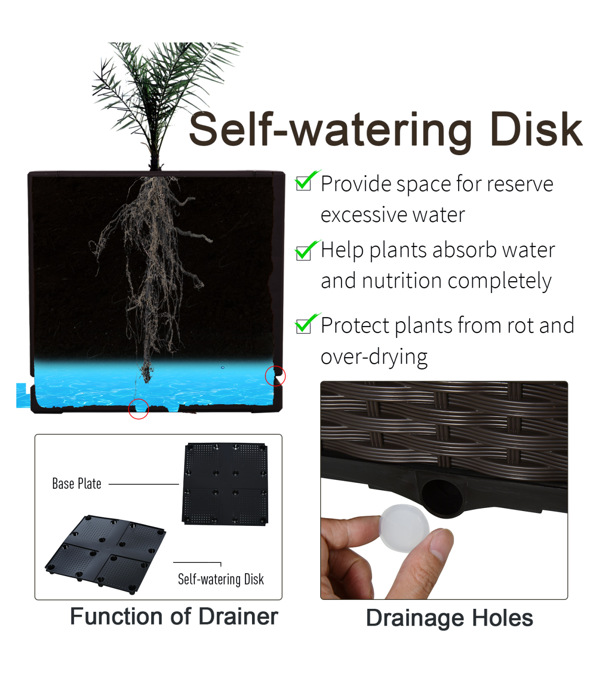 - Intelligent water disc reserves and feeds plants without drowning them, with drainage holes for excess