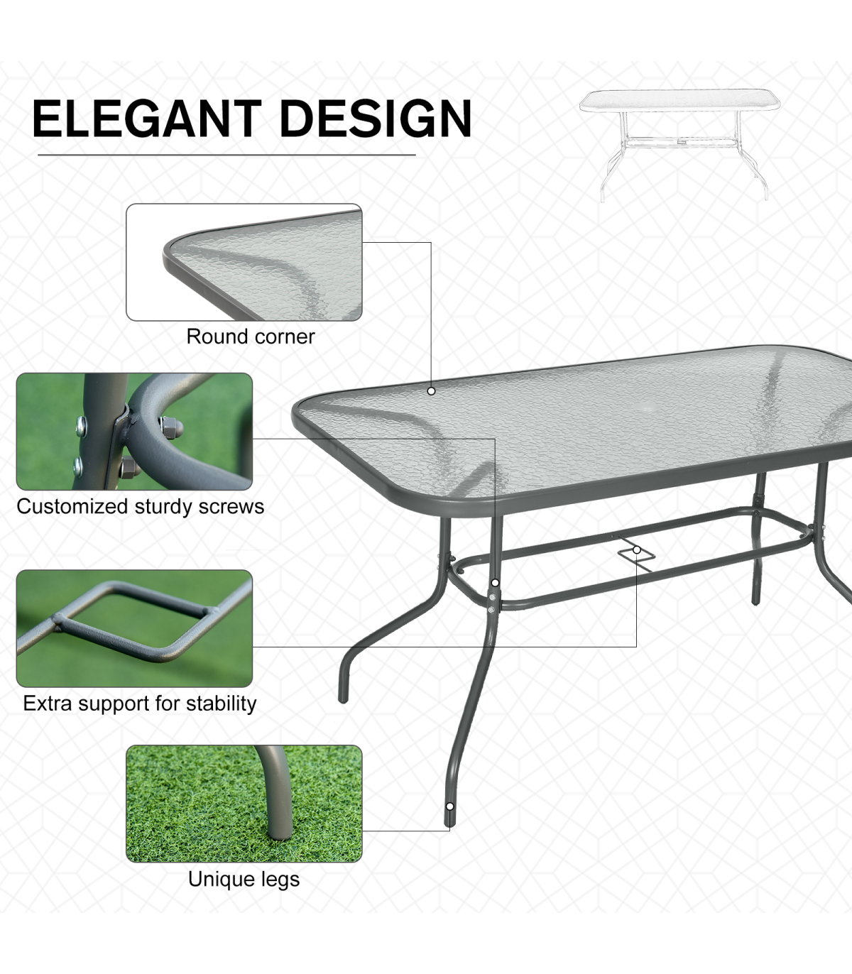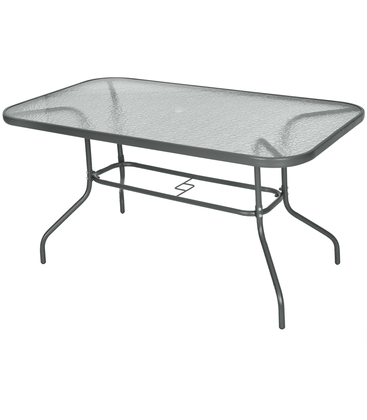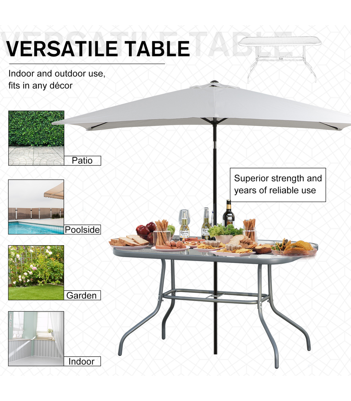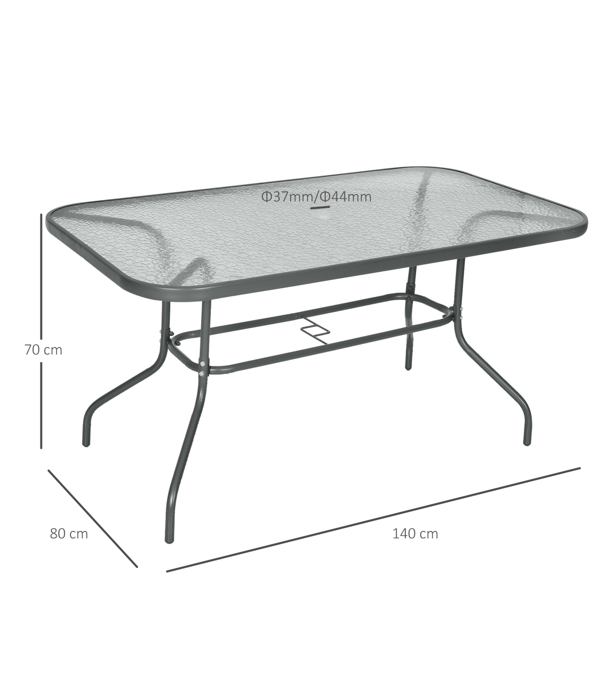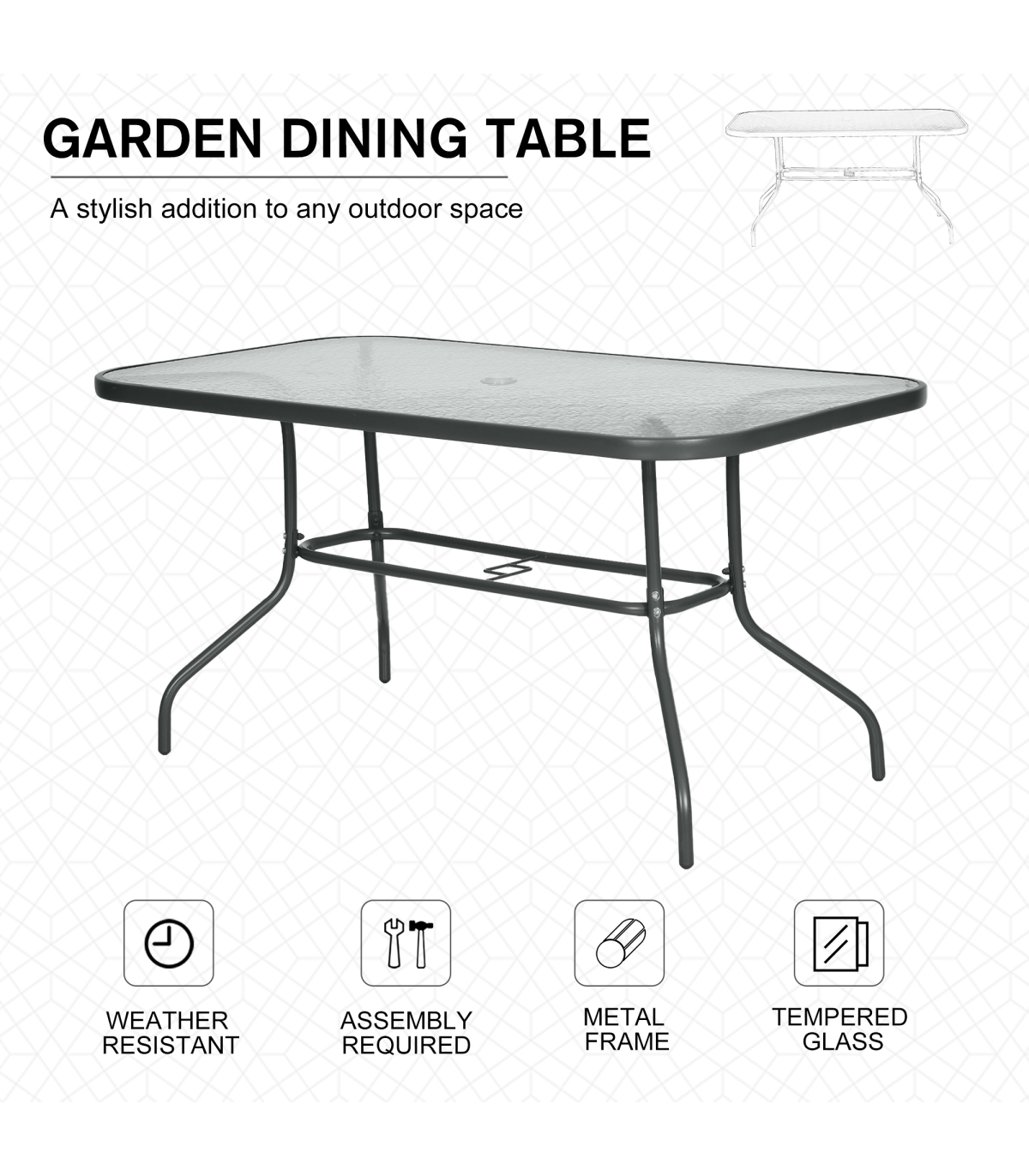 Effortlessly complement your outdoor set-up with this large table from Outsunny. A versatile design, which blends itself in with a large variety of garden dining sets, it uses thick metal for the smoothly curved frame for a stable structure, with four evenly spaced legs to provide balance when in use. Aquatex glass covers the whole of the top, with a hole in the middle to place a sun umbrella for protective shade. A modern way to charm your guests when they visit.