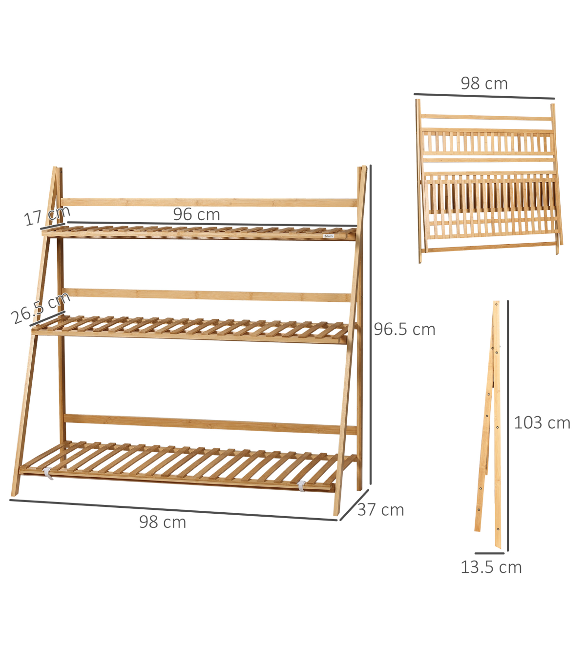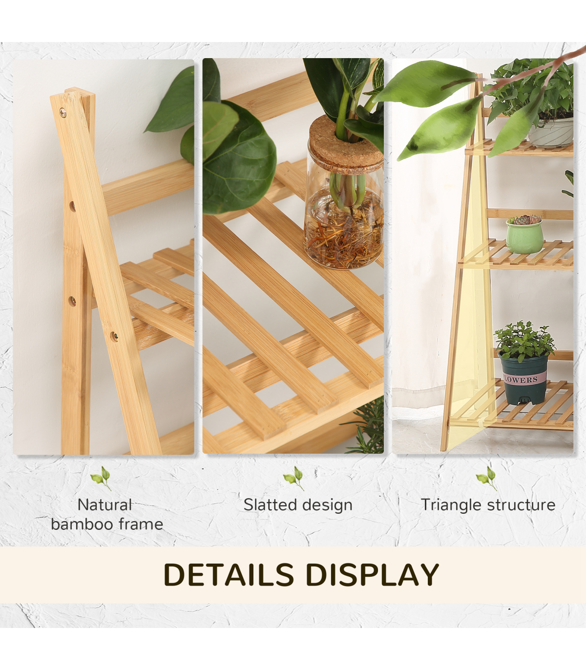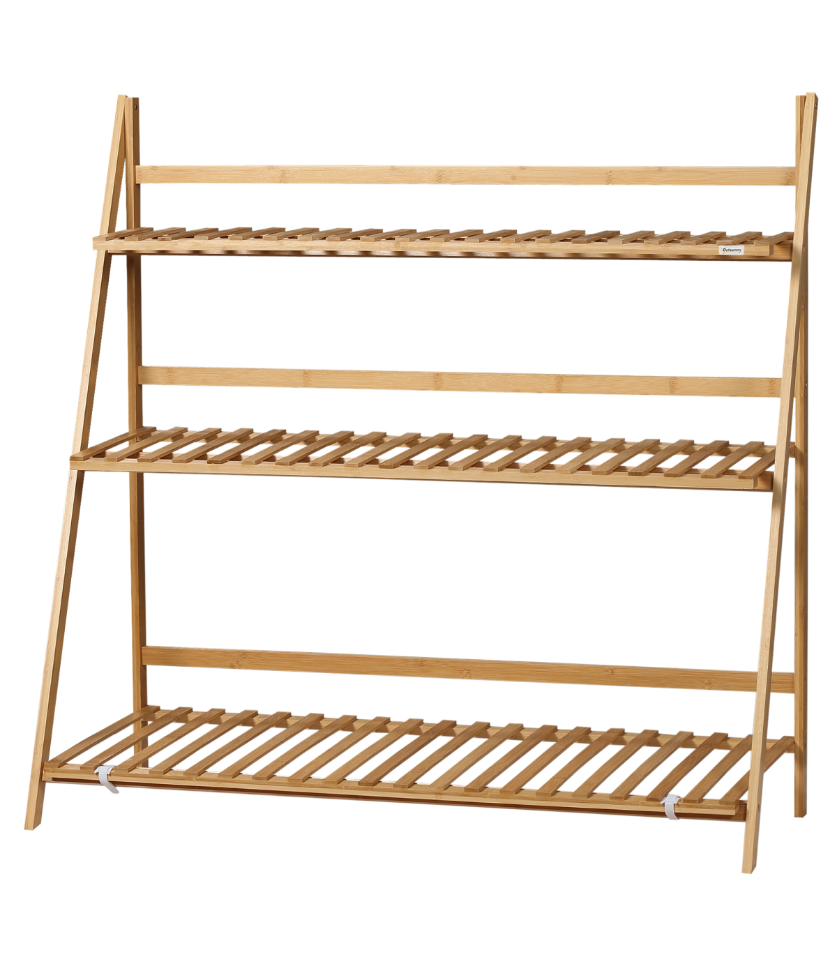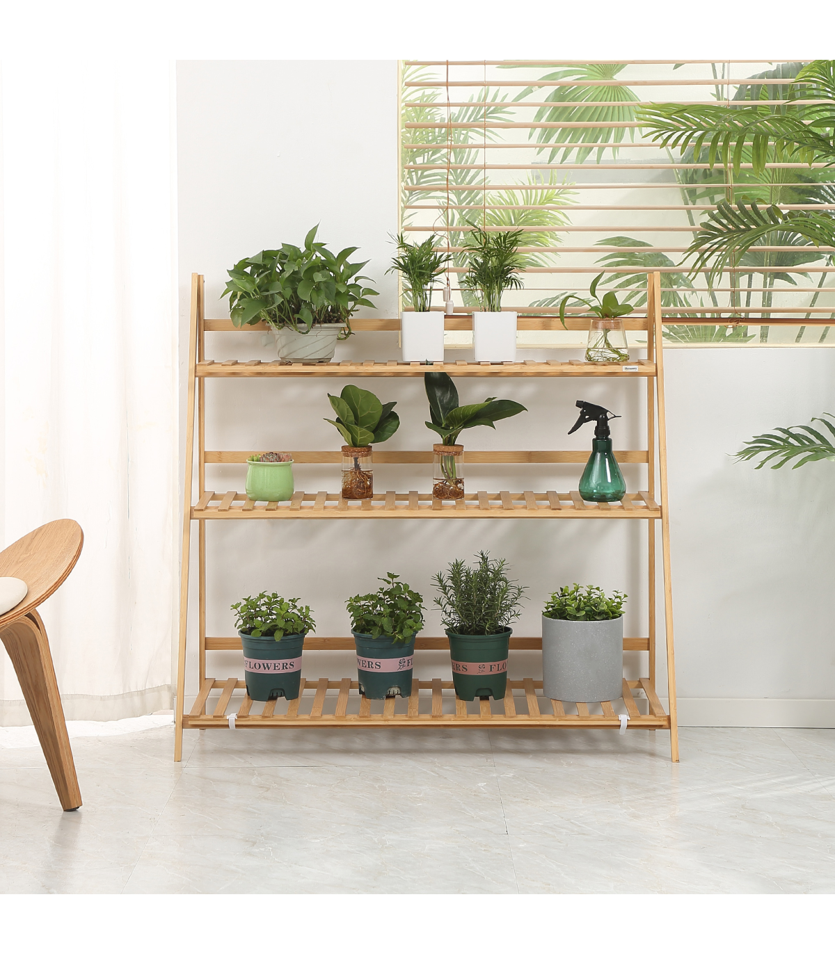 - Bamboo structure: A naturally strong structure, this flower stand will support plant pots easily. Each shelf on this plant shelf is slatted to prevent water build up.
