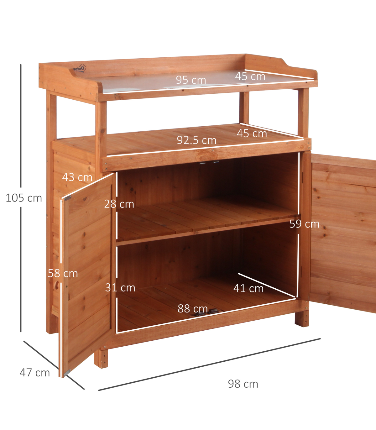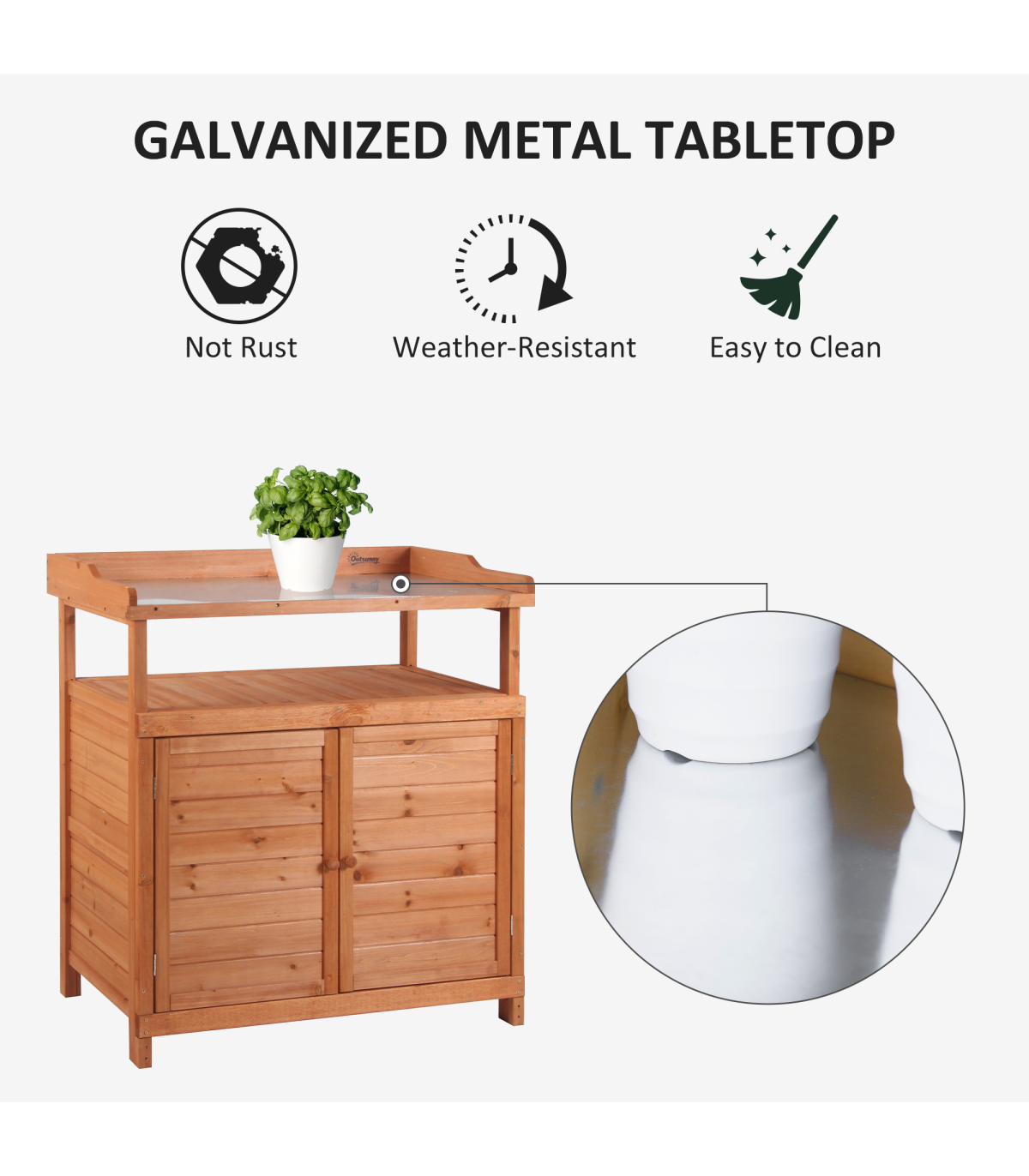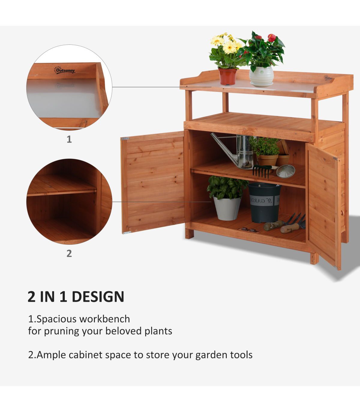This potting bench from Outsunny has a simple appearance yet flexible functionality to bring an awesome addition to your garden or backyard. The outdoor tool shed has a workstation table, ideal for storing various tools and accessories and as a garden workbench. The metal tabletop is very easy to clean, you could feel free to do the work at it. The outdoor storage cabinet is made of fir wood which is durable and sturdy, offers long-term reliable use.