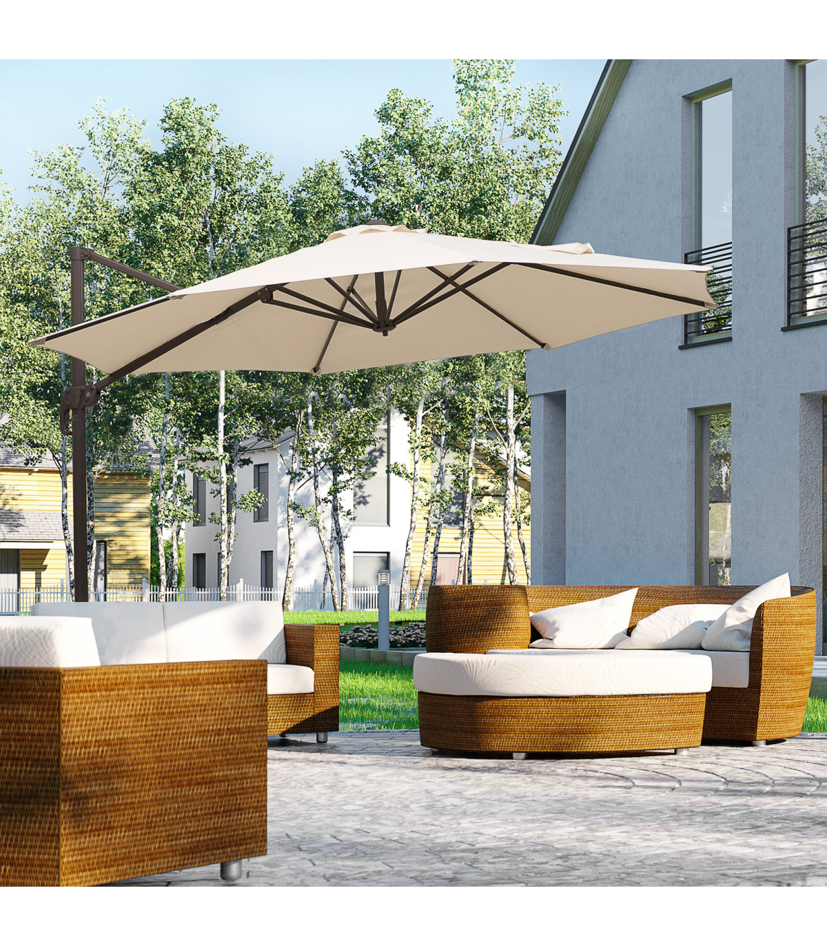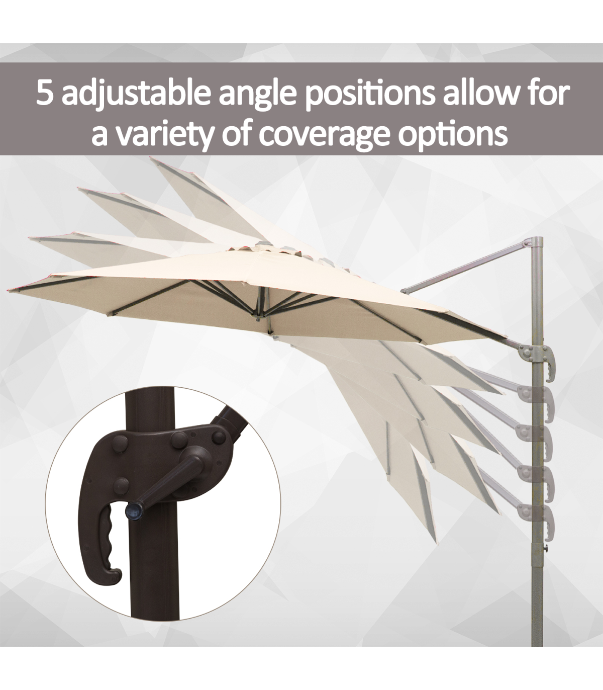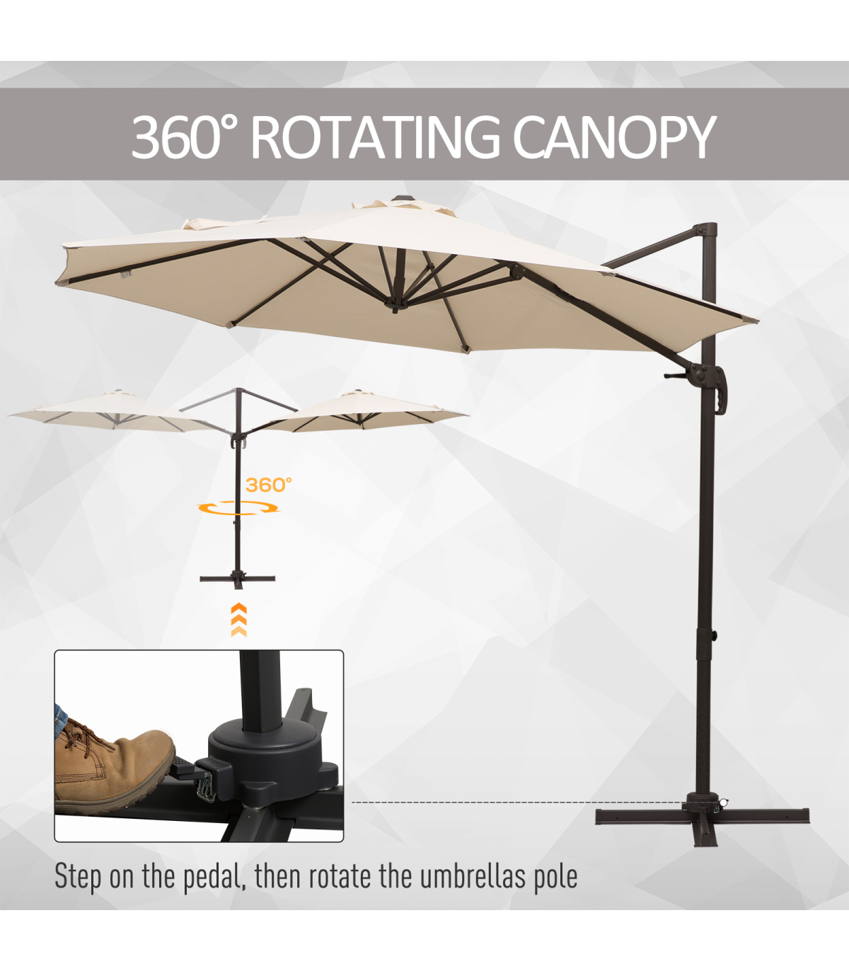 - The cantilever patio parasol rotates 360 degrees and can be tilted to various angles to suit you