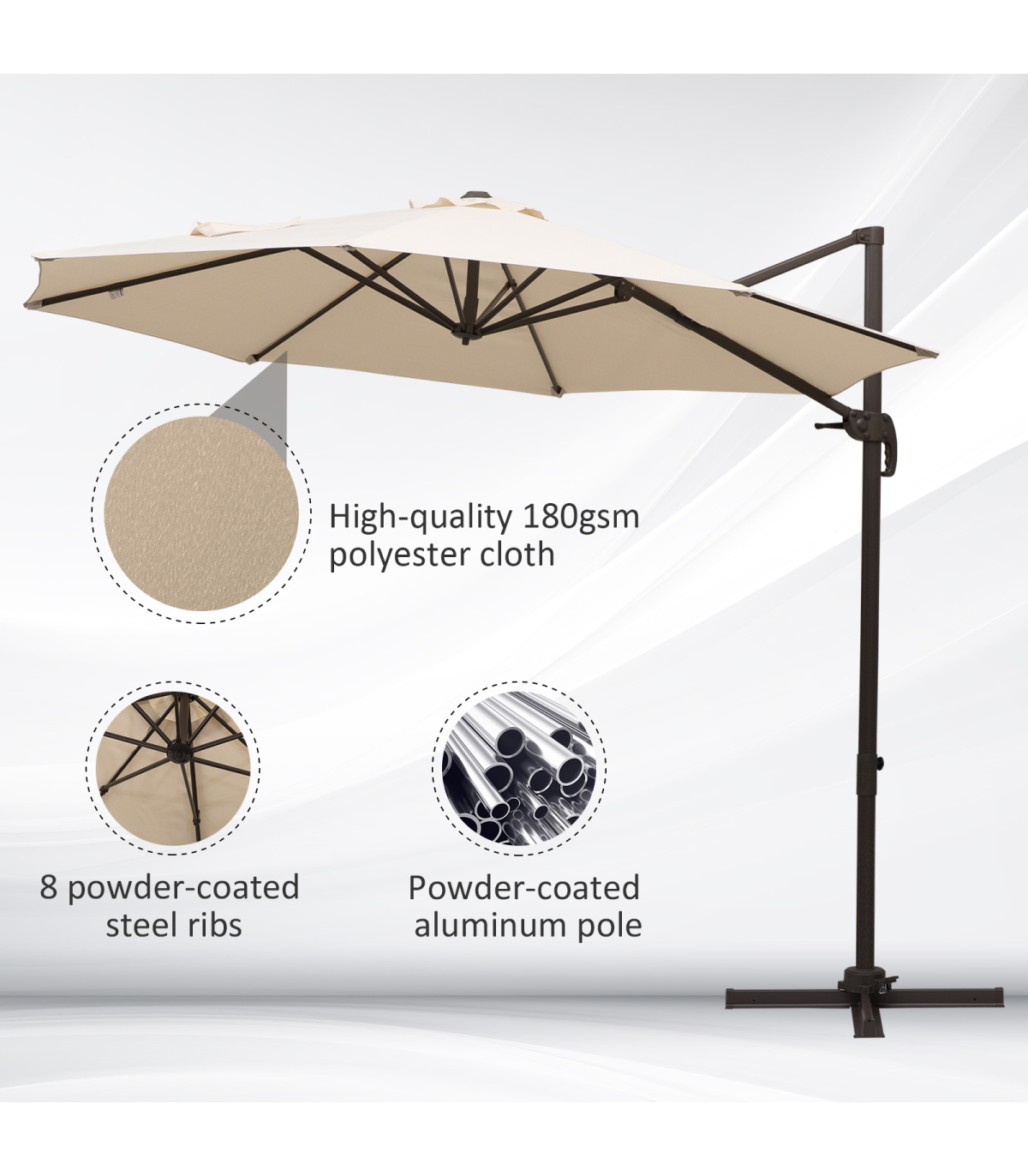 - Aluminium pole for strength, with eight connecting ribs to parasol for extra stability