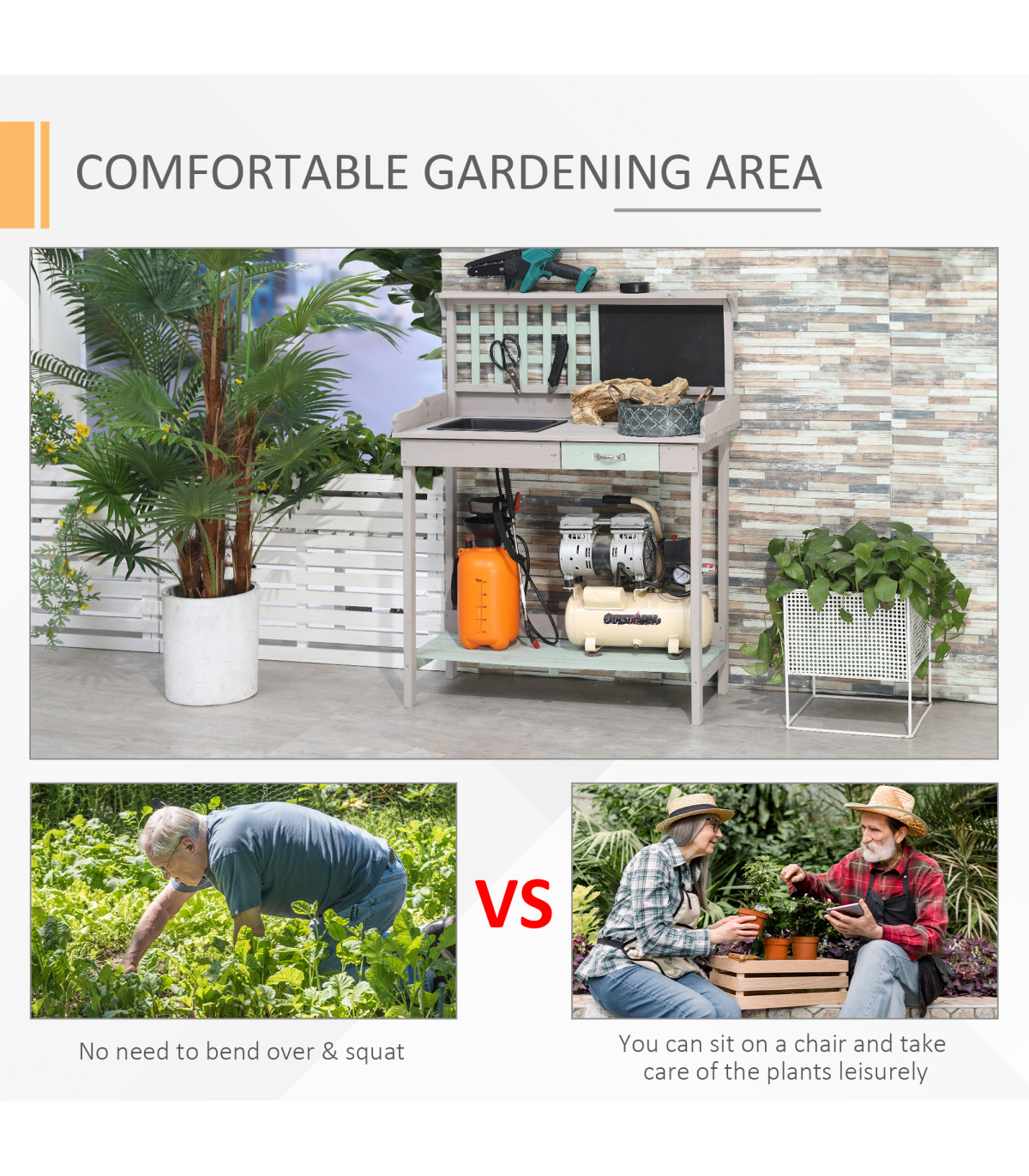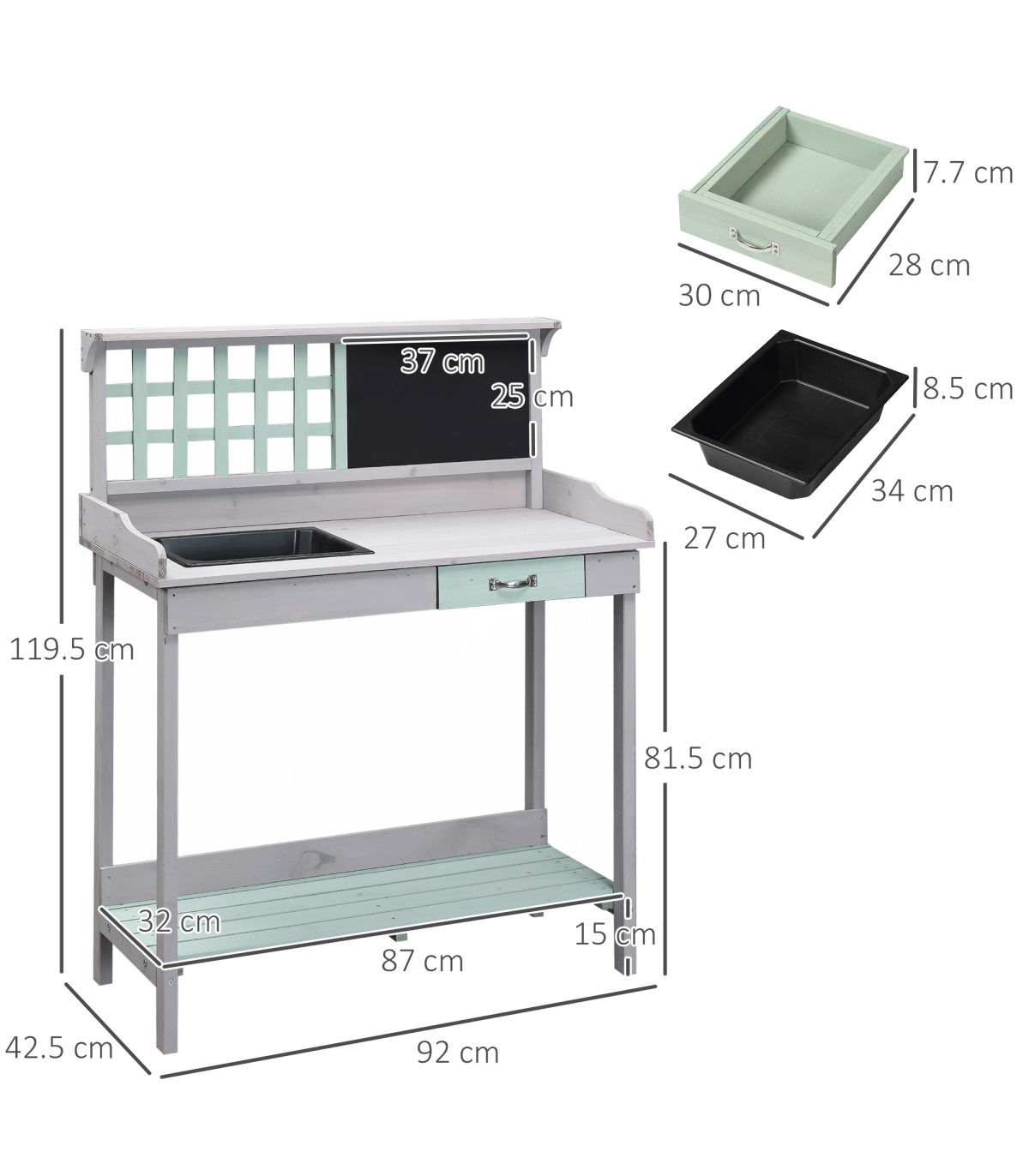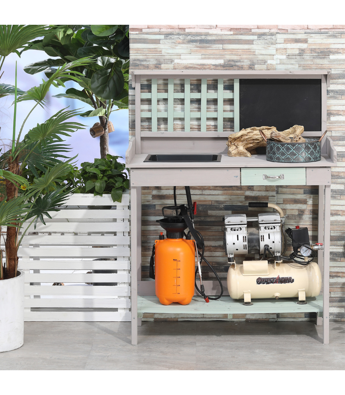 This potting table is made for all the gardening enthusiasts out there. Made from natural, solid fir wood for durability for years to come, it has been crafted into a design that will make gardening easier and more efficient, giving you more time to focus on looking after and nurturing your garden. On the top lies a large and spacious work space which features a sink to pot the plants and keep the work top tidy, alongside a blackboard to help you keep track of things instantly and a small drawer for storage. On the bottom is a shelf which is slatted to stop any water build up. You�ll have your gardening done quicker than ever!