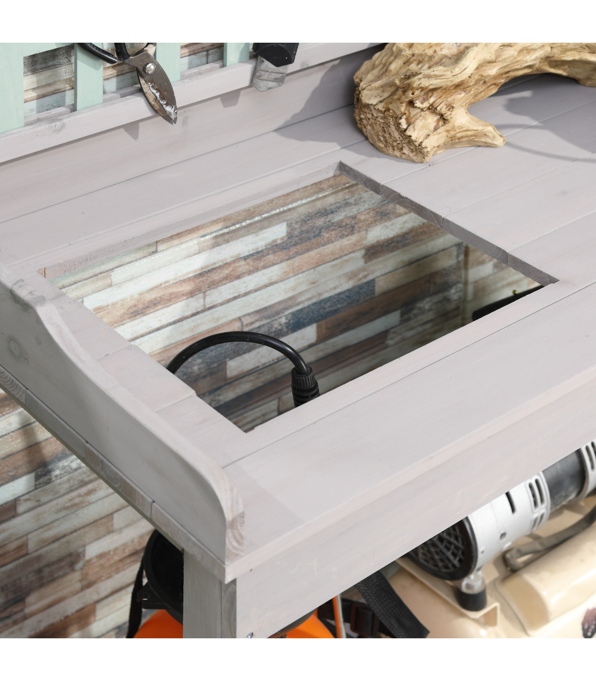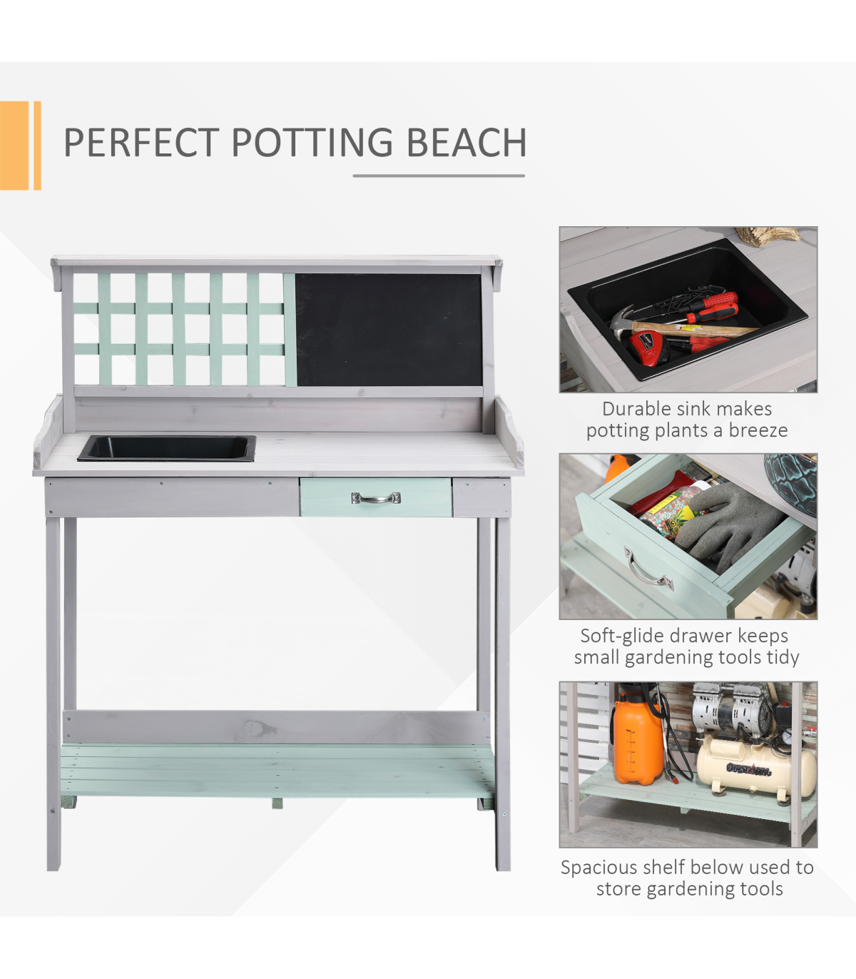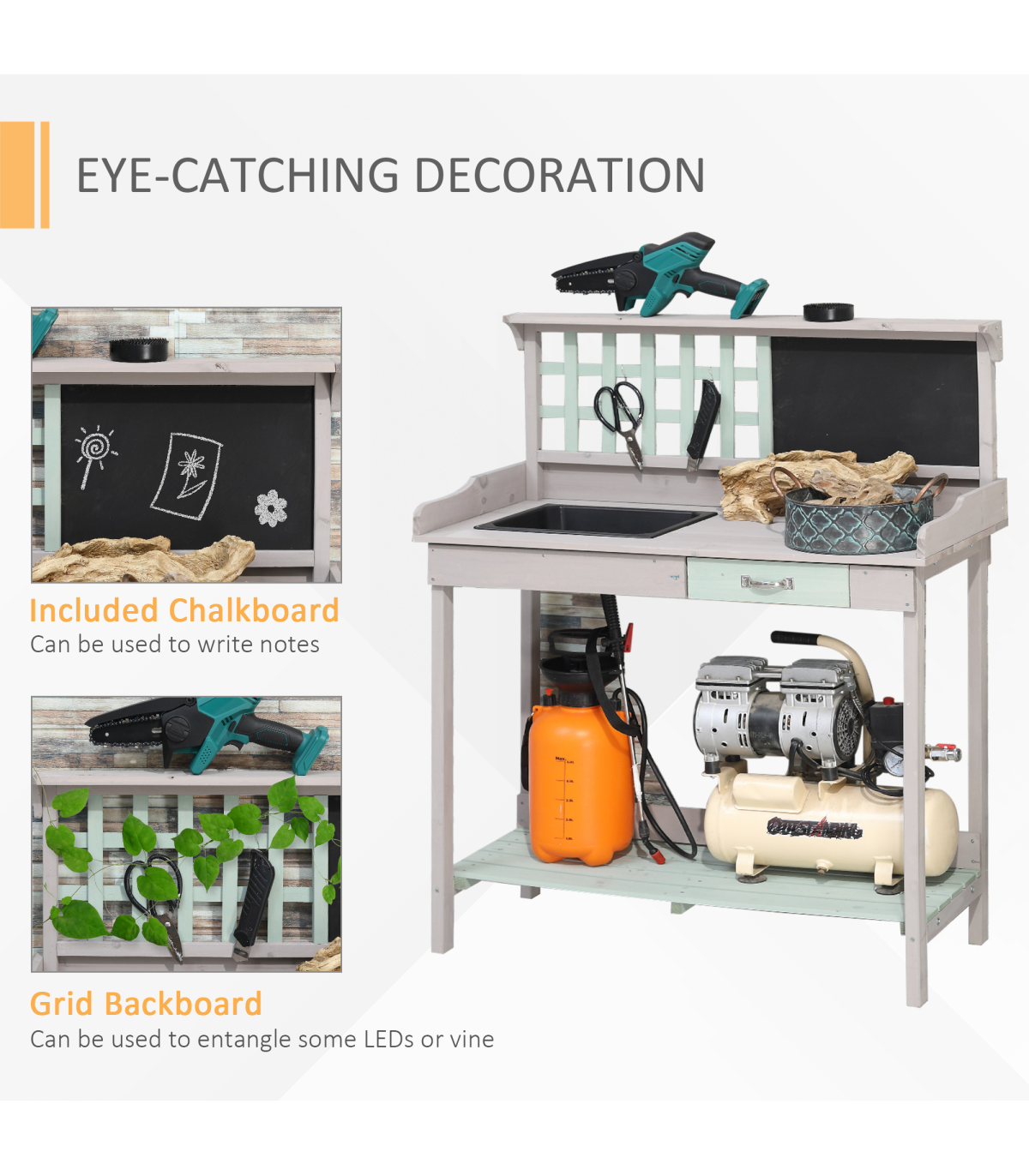 - Spacious work surface with a potting sink and blackboard