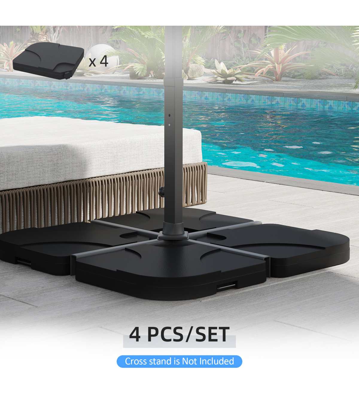 This Outsunny umbrella base weights are a great accessory to have to keep your parasol, umbrella steady. It comes in 4 piece configuration to be placed on the cross feet of your umbrella. Made from a high density polyethylene material, it can withstand most weather elements. Each of the pieces can be filled with water or sand to make them heavy and more secure, it also has handles on them if you do require for them to be moved. This is a great essential to have as part of your umbrella to keep it safe and secure.