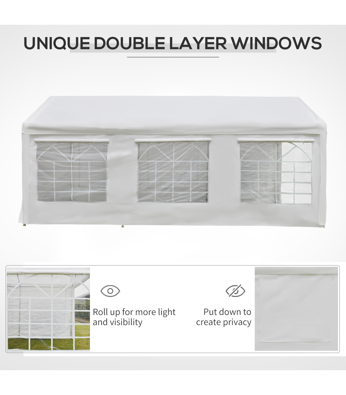 - Two sidewall each with 3 PVC windows with shutter shade cloth