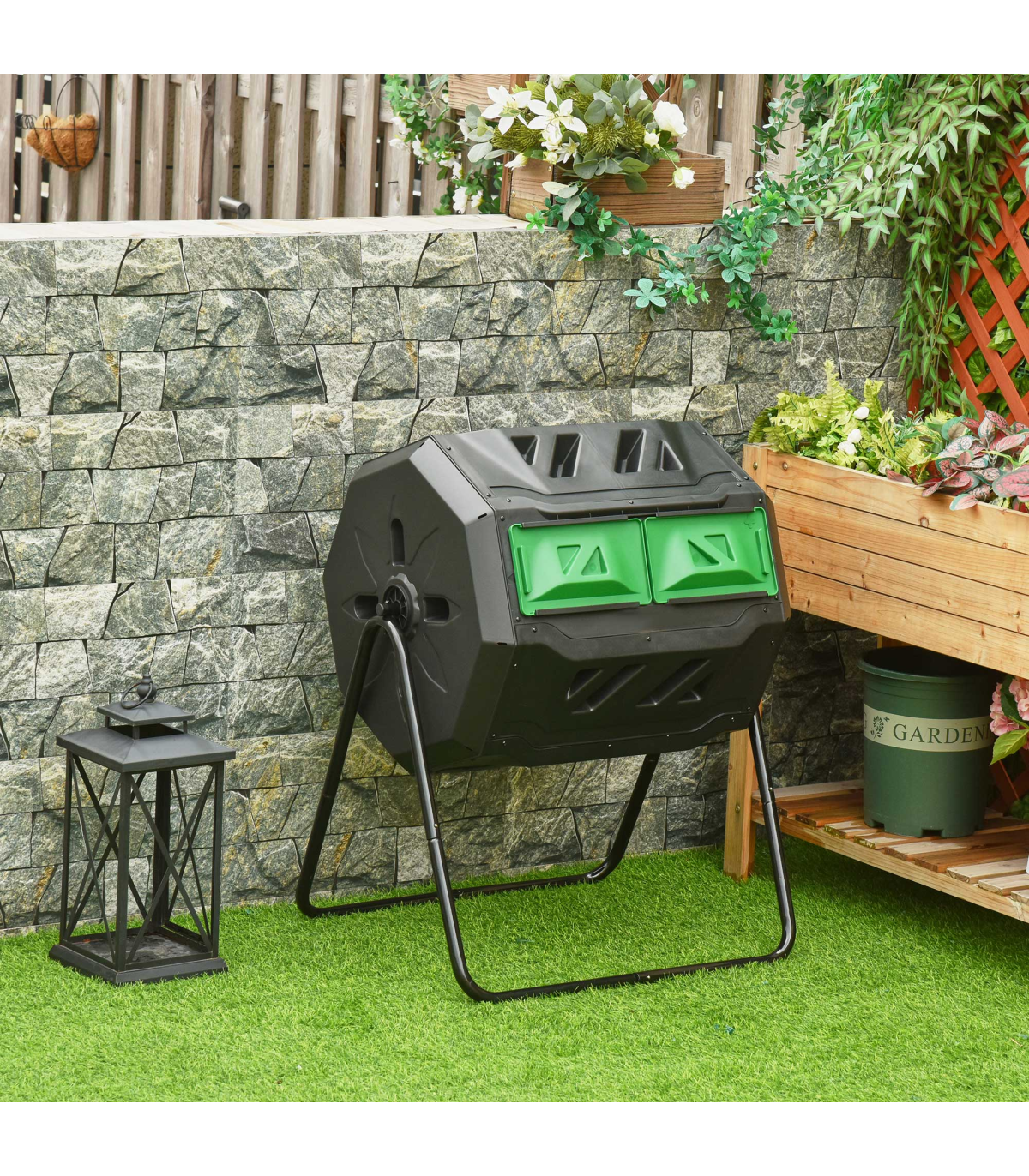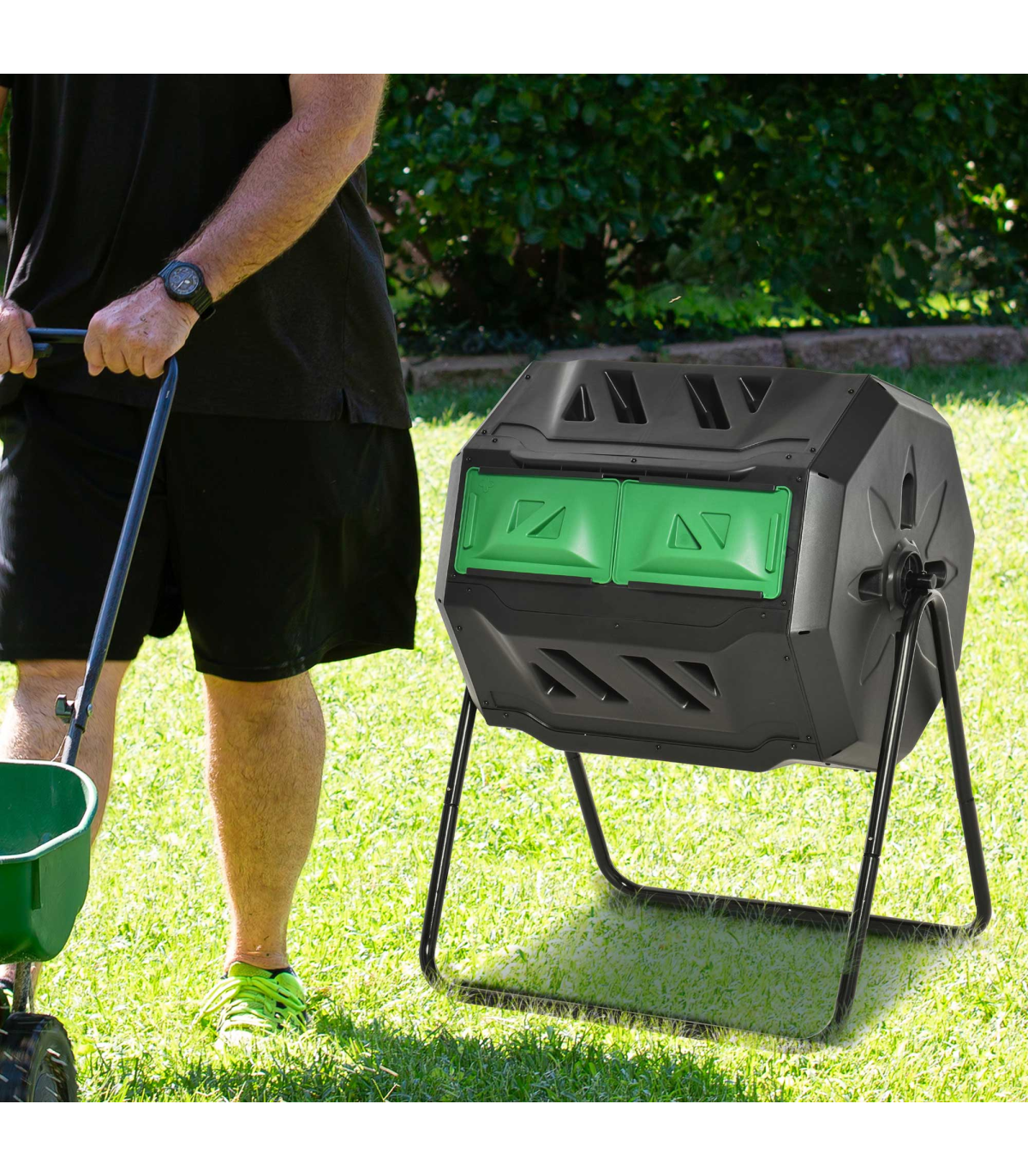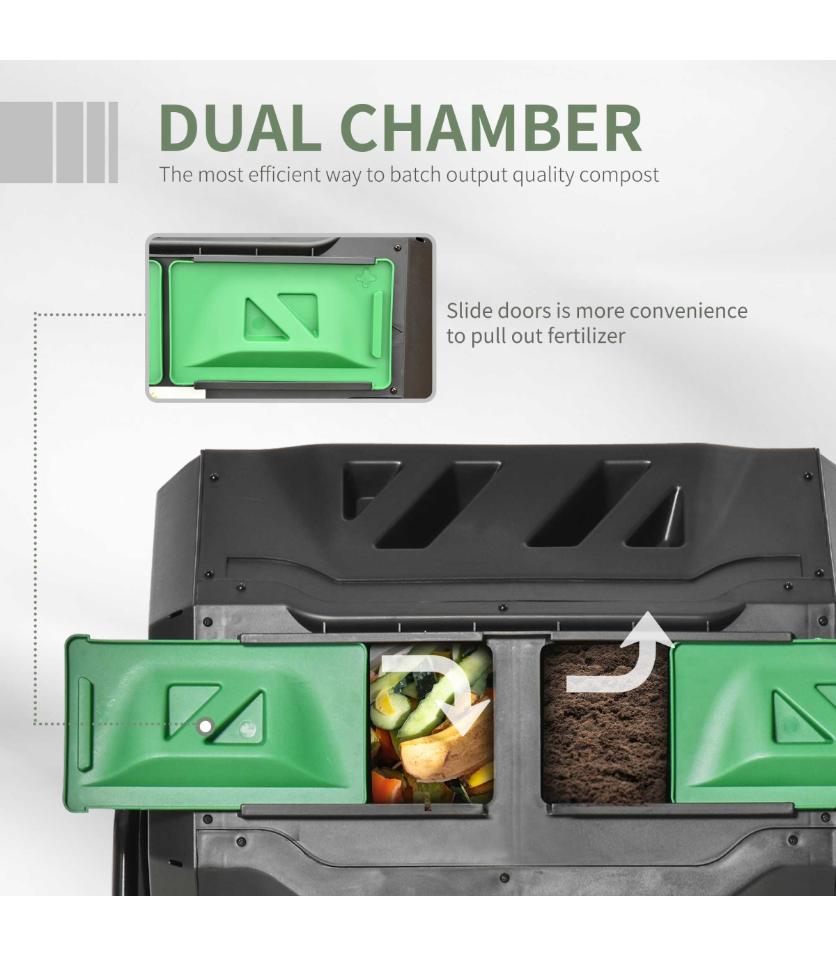 Description: "Closed the sliding door and roll this Outsunny compost bin. Let garden refuse and kitchen scraps fill up the twin chamber. Manure is produced on one side, while new ingredients can be added to the other side. The constant exchange of materials on both sides creates a cycle, providing a sufficient and organic mixture for your backyard garden. Give your plants the nutrient-dense fertilizer they crave and watch your garden bloom like never before.