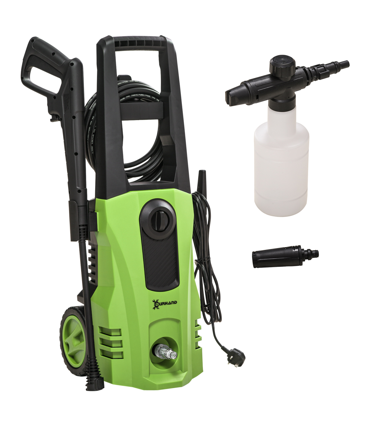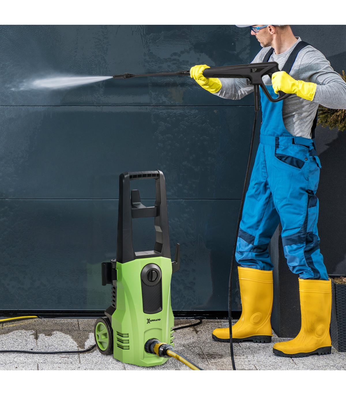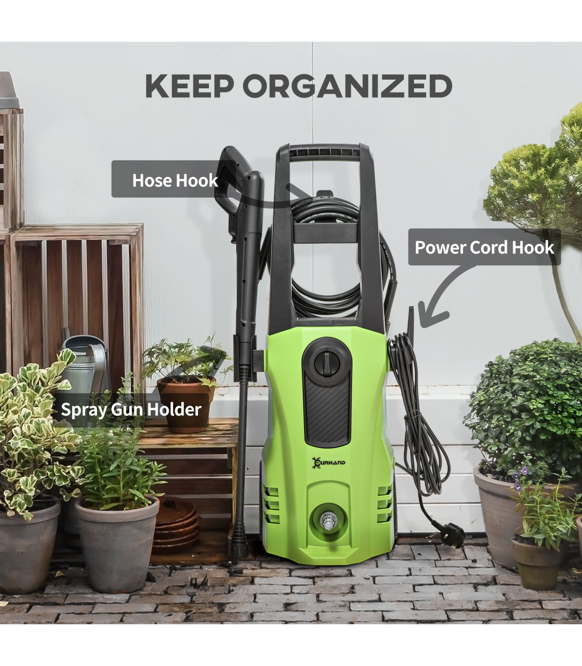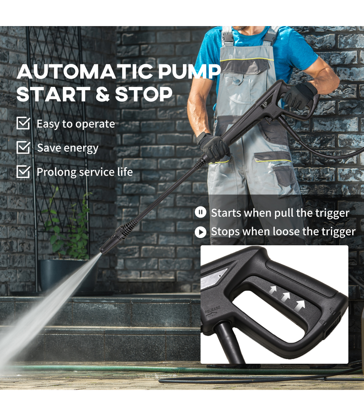 when the trigger is not engaged, the pump automatically shuts off to save energy and extend pump life.Complete washer kits: Comes with a spray gun, a wand, a hose, an inlet adaptor, a snow foam bottle, a nozzle, and a nozzle cleaner. The gun, hose, and power cord have their own place to keep organized and won't be in a mess.All for your convenience: Comes with two wheels for easy rolling around your garden and the handle with proper height is designed for you to pull it comfortably. The handle and the spray gun holder are detachable for a more compact size, space-saving to store it in your garage, cabinet, or basement.