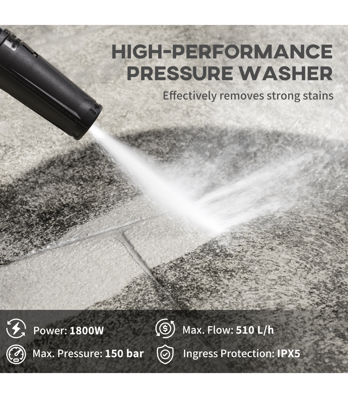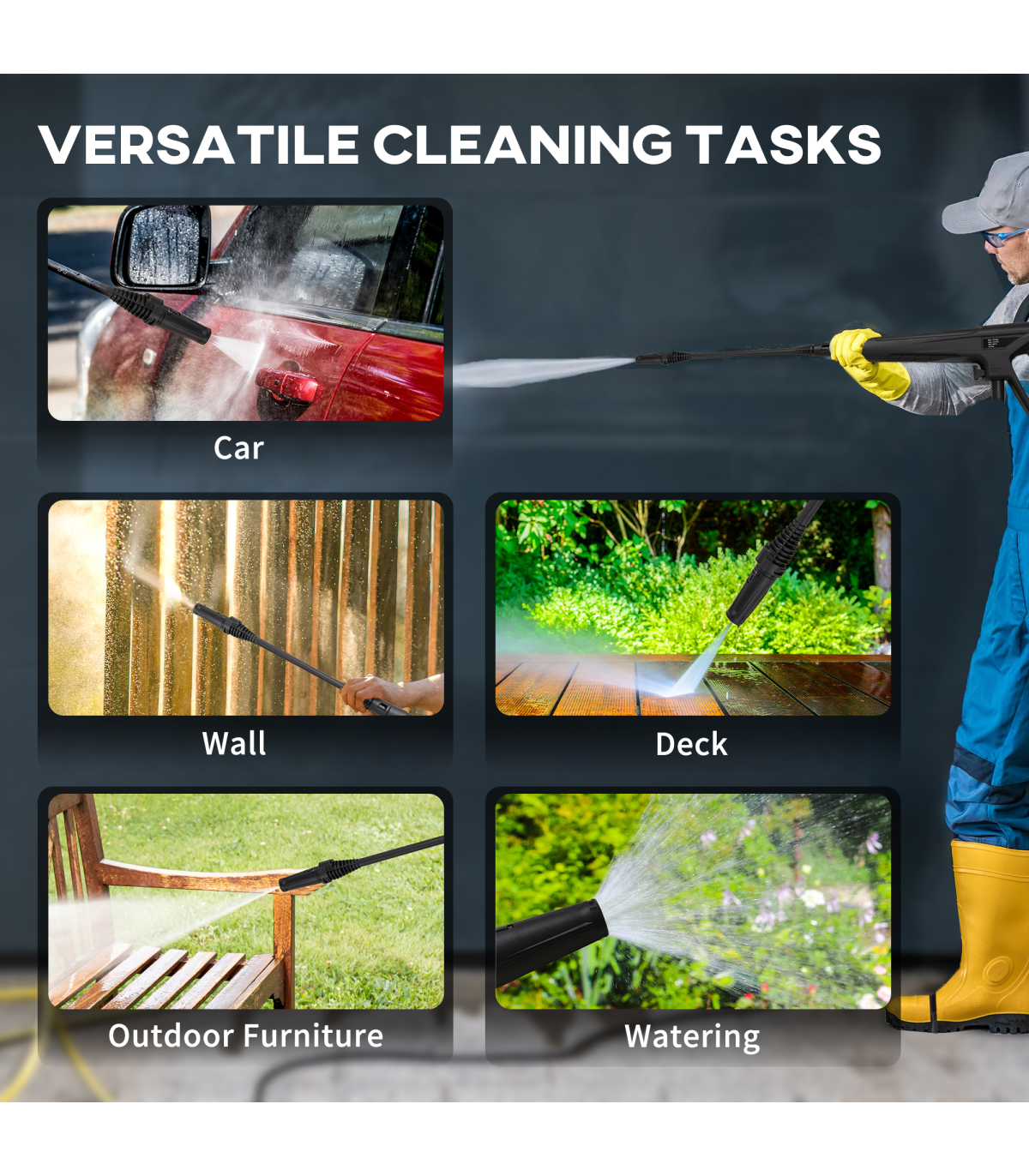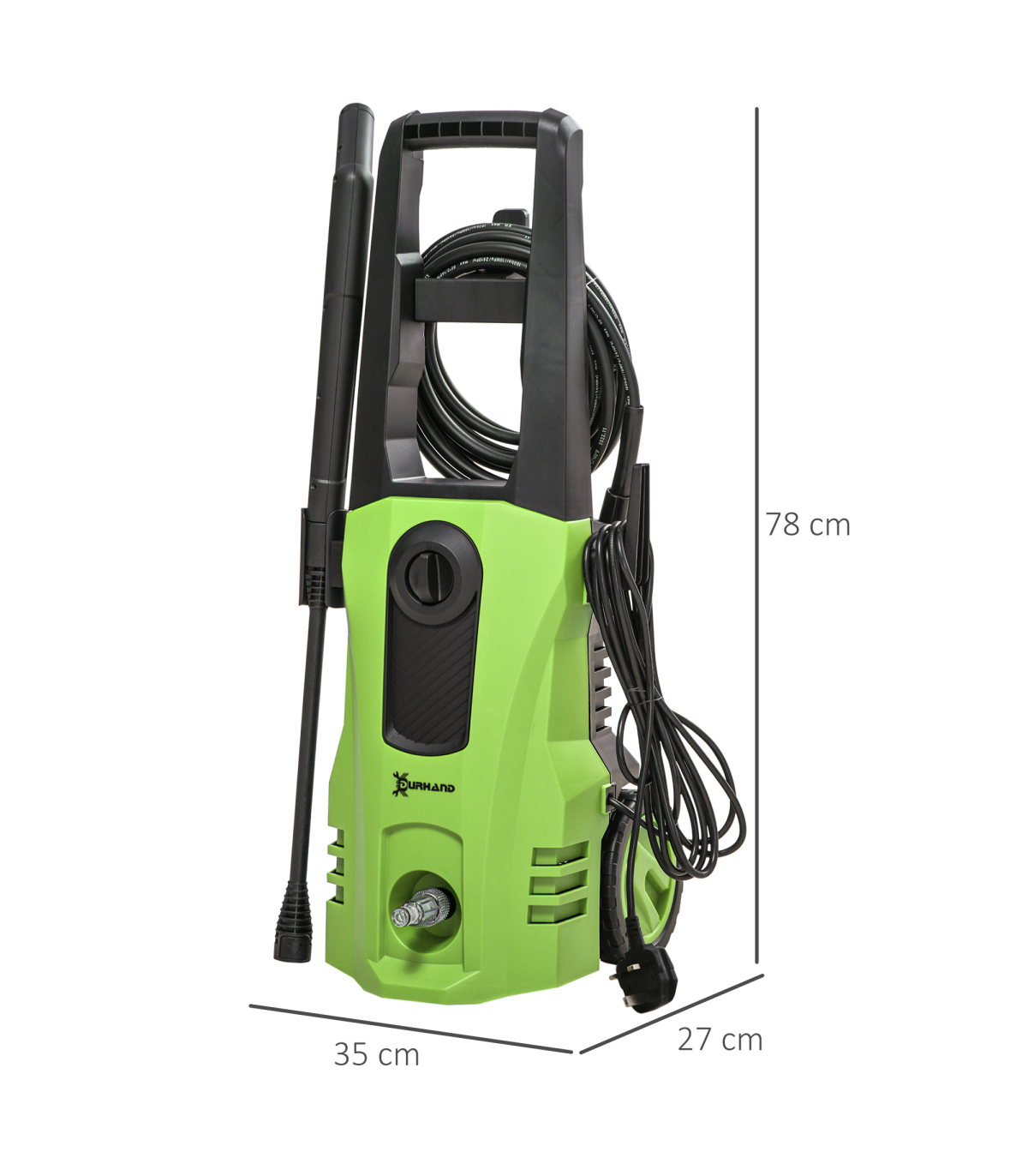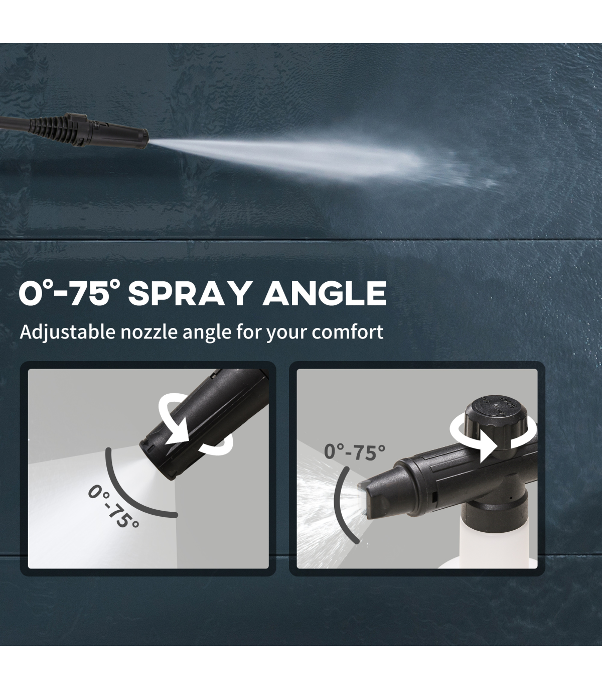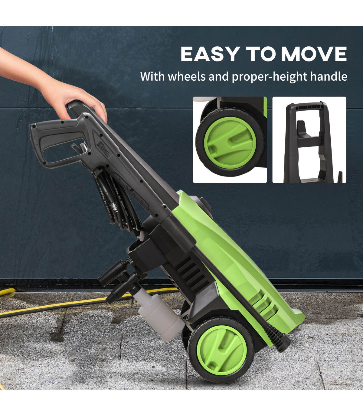 when the trigger is not engaged, the pump automatically shuts off to save energy and extend pump life.Complete washer kits: Comes with a spray gun, a wand, a hose, an inlet adaptor, a snow foam bottle, a nozzle, and a nozzle cleaner. The gun, hose, and power cord have their own place to keep organized and won't be in a mess.All for your convenience: Comes with two wheels for easy rolling around your garden and the handle with proper height is designed for you to pull it comfortably. The handle and the spray gun holder are detachable for a more compact size, space-saving to store it in your garage, cabinet, or basement.