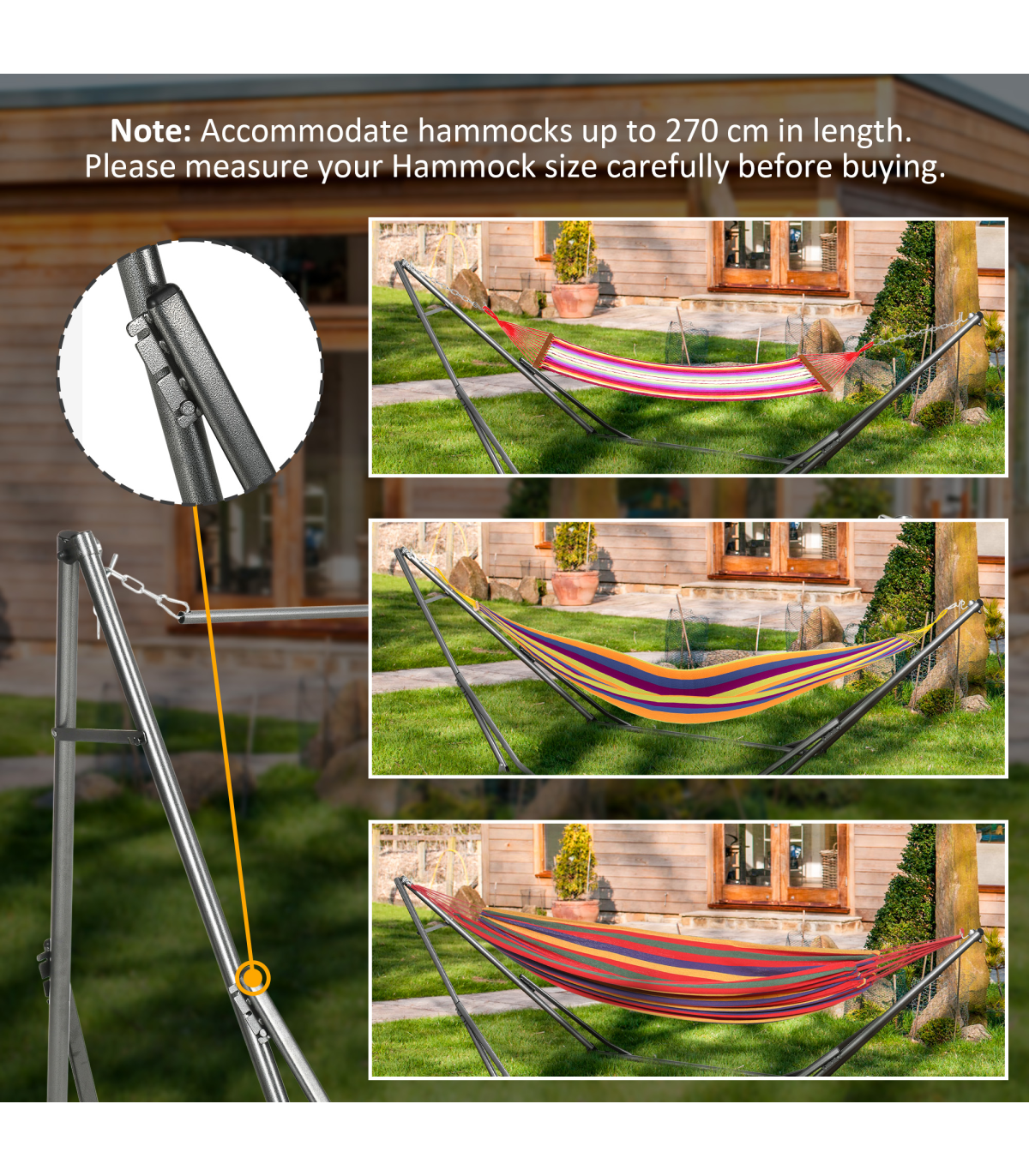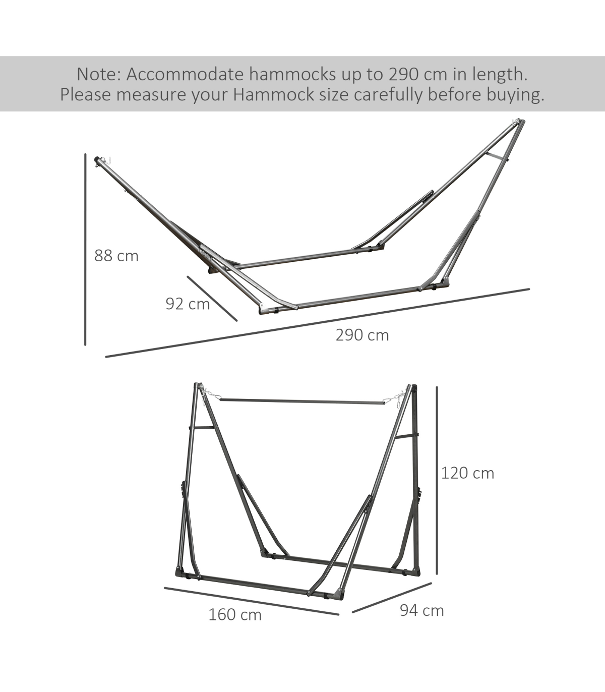 Modern aesthetic: This hammock stand only is applicable for hammocks within 290cm in length. It features a uniquely modern shape with a stylish design, perfect for a balcony, garden, courtyard, porch, bedroom, living room, dorm and more.2 in 1 hammock stand: The portable hammock stand featuring a uniquely modern shape that can be twisted easily from a hammock net stand to clothes drying rack will stand out from the crowd and provides the perfect aesthetic to your outdoor living space.Foldable design: This hammock frame only makes storage and transportation a breeze when not used. Make it your go-to accessory for relaxing on your patio, under your favourite tree or unwinding at the beach.Steady construction: With an elaborate curved arc design, the hammock frame made of durable steel frame with a powder-coated finish makes this product extra sturdy and secure for up to 120kg of supported weight.Dimensions: 290L x 92W x 88Hcm, foldable dimension: 125L x 15W x 14Hcm, weight capacity: 120kg. Assembly require.