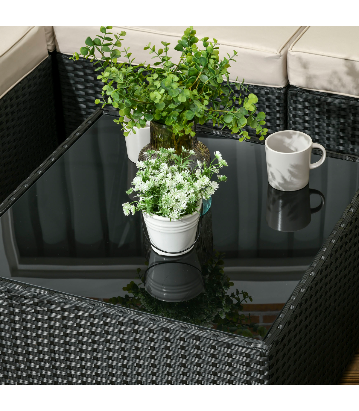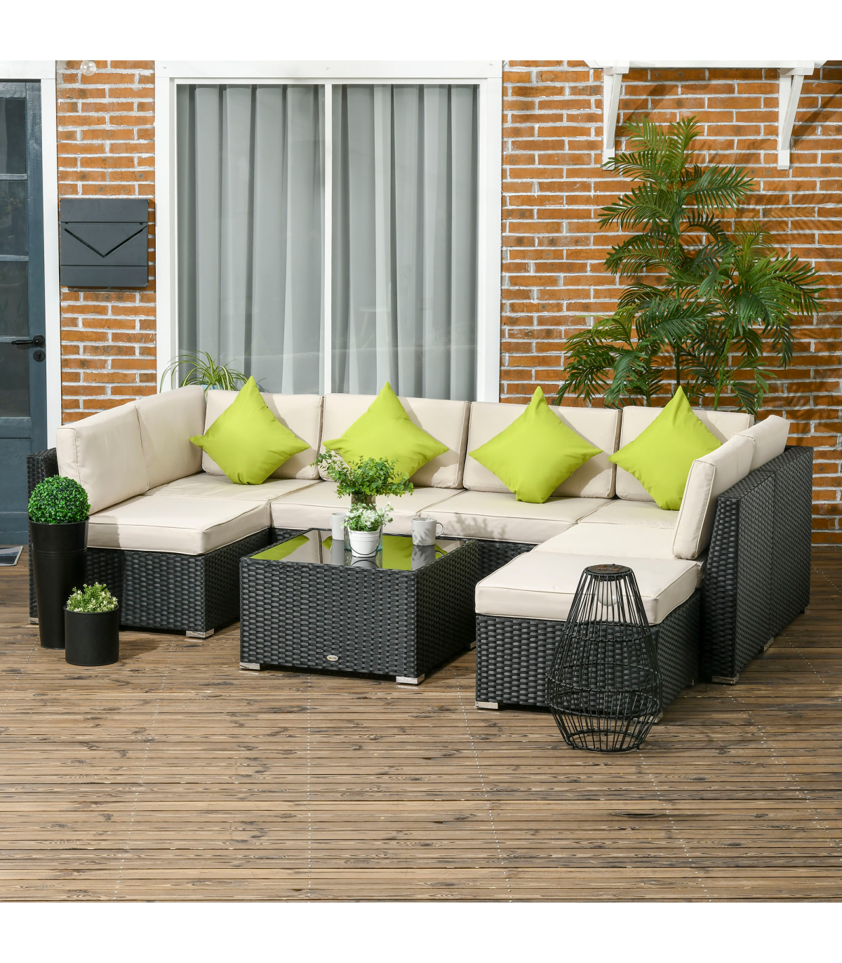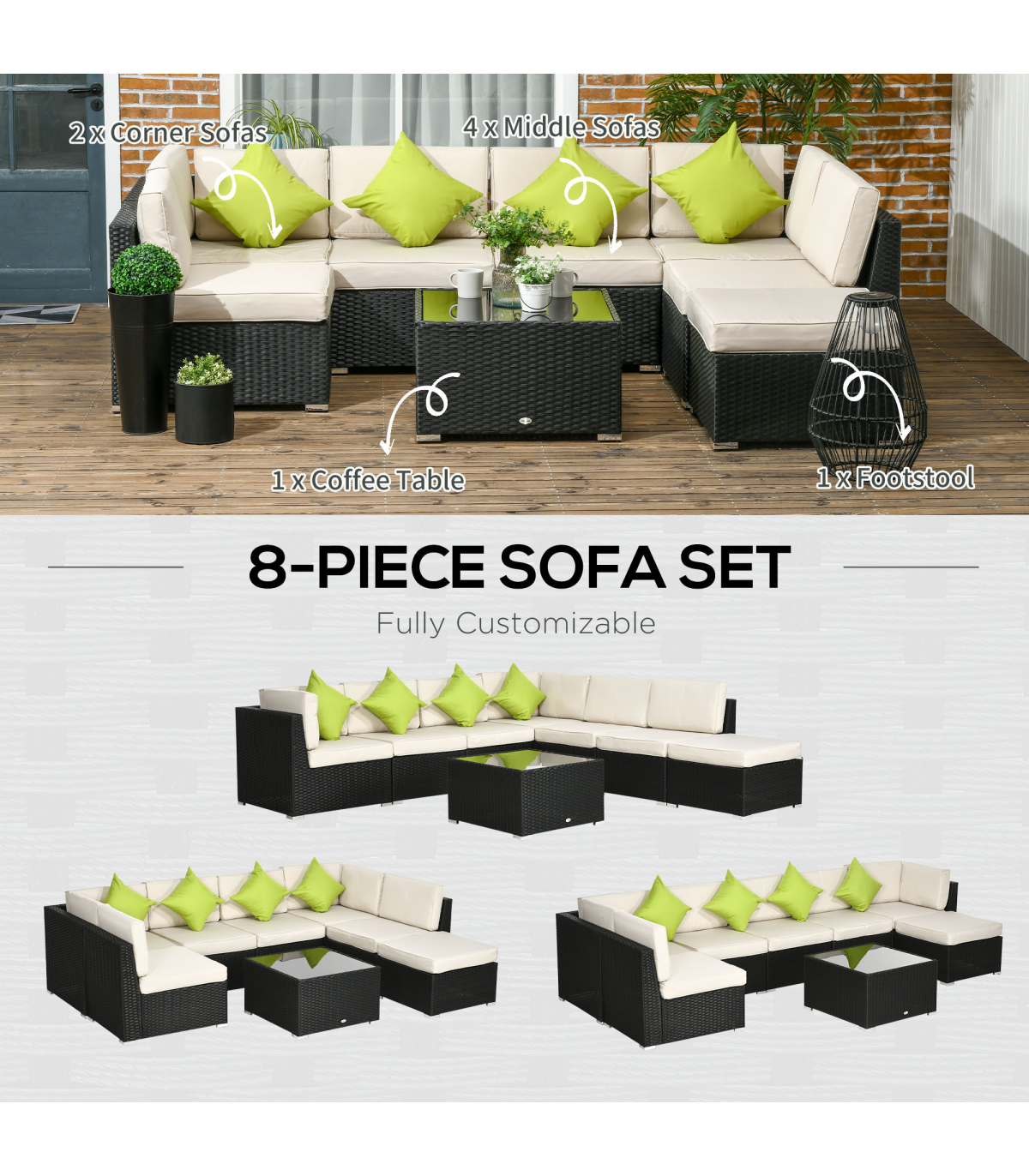 Stylish eight-piece rattan furniture set: Comes with two corner seats, four middle seats, a footstool and a coffee table. Set up in a shape how you want.Steel, wrapped in rattan: Each piece of this garden sofa set has a strong and supportive frame, covered with plastic wicker for extra durability and a stylish look. Mild weather and UV resistant.Thick cushions: Relax in complete comfort as you relax on this corner garden furniture set. Four bright coloured throw cushions included.Square glass top coffee table: A handy place to keep things near. Matches the rest of this rattan garden furniture set.Dimensions: Corner seat: 65H x 73W x 73Dcm. Middle seat: 65H x 60W x 73Dcm. Footstool: 32H x 60L x 60Wcm. Table: 39H x 66L x 66Wcm. Assembly required.