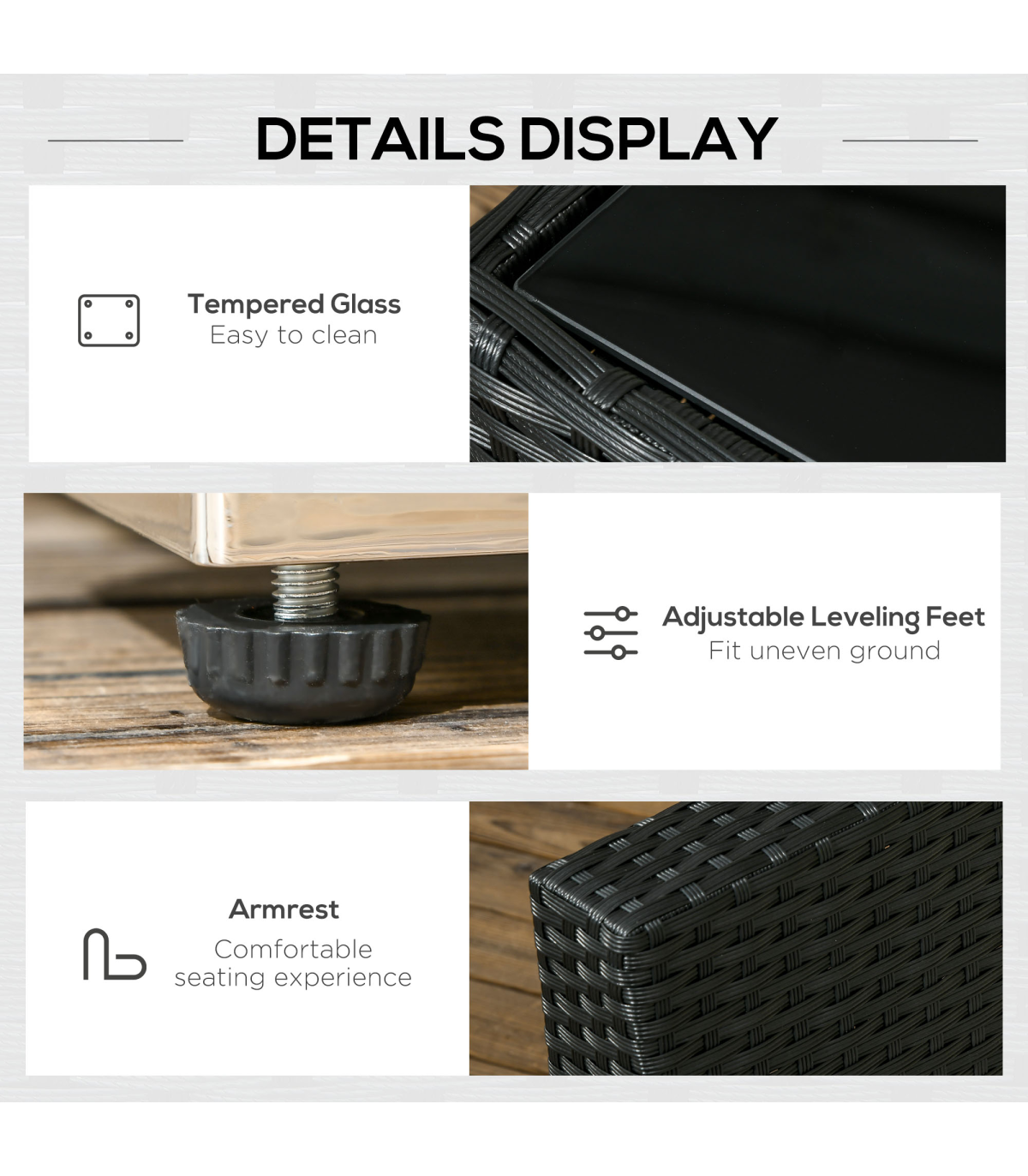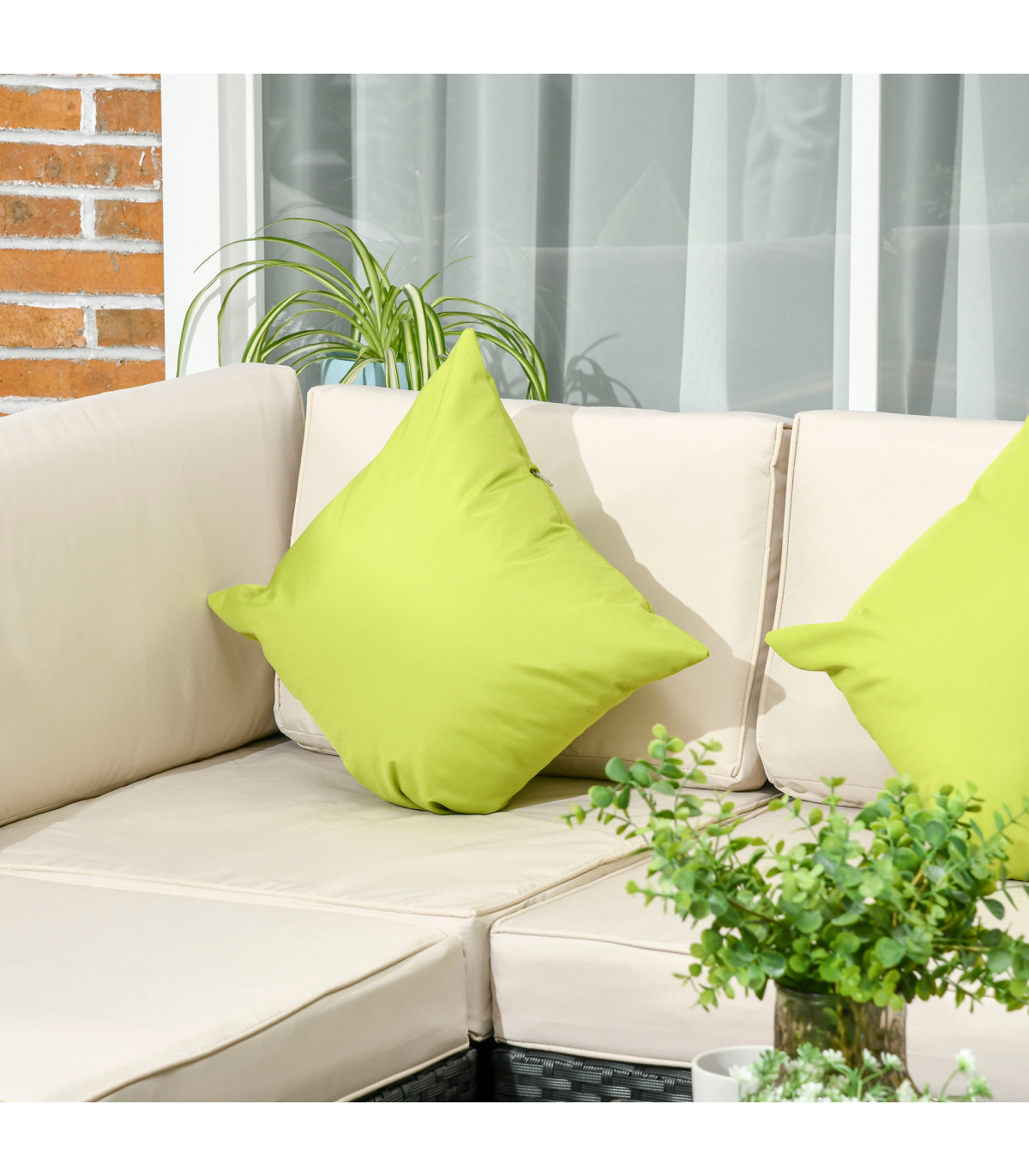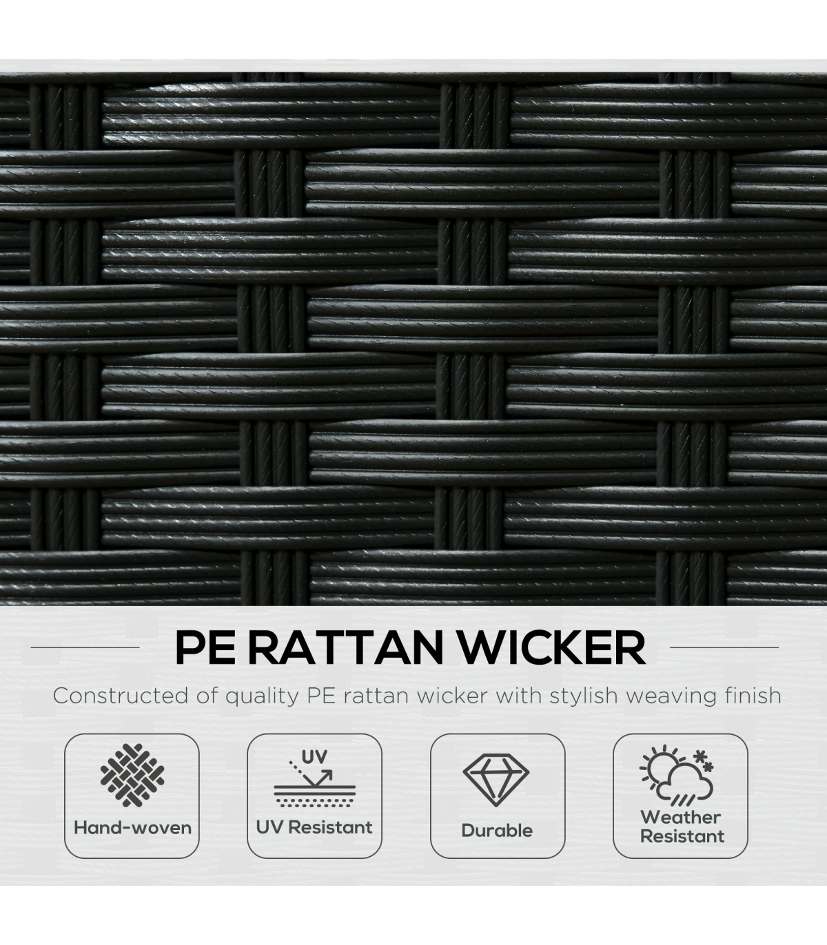 Stylish eight-piece rattan furniture set: Comes with two corner seats, four middle seats, a footstool and a coffee table. Set up in a shape how you want.Steel, wrapped in rattan: Each piece of this garden sofa set has a strong and supportive frame, covered with plastic wicker for extra durability and a stylish look. Mild weather and UV resistant.Thick cushions: Relax in complete comfort as you relax on this corner garden furniture set. Four bright coloured throw cushions included.Square glass top coffee table: A handy place to keep things near. Matches the rest of this rattan garden furniture set.Dimensions: Corner seat: 65H x 73W x 73Dcm. Middle seat: 65H x 60W x 73Dcm. Footstool: 32H x 60L x 60Wcm. Table: 39H x 66L x 66Wcm. Assembly required.