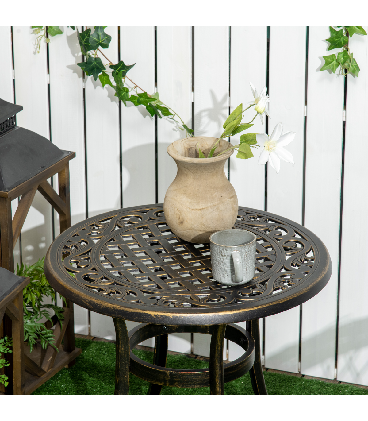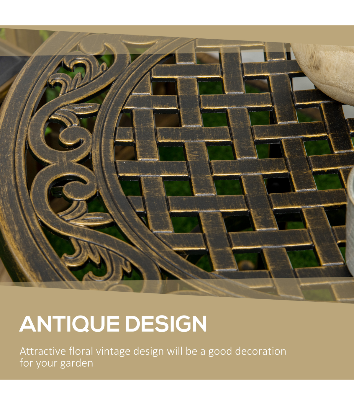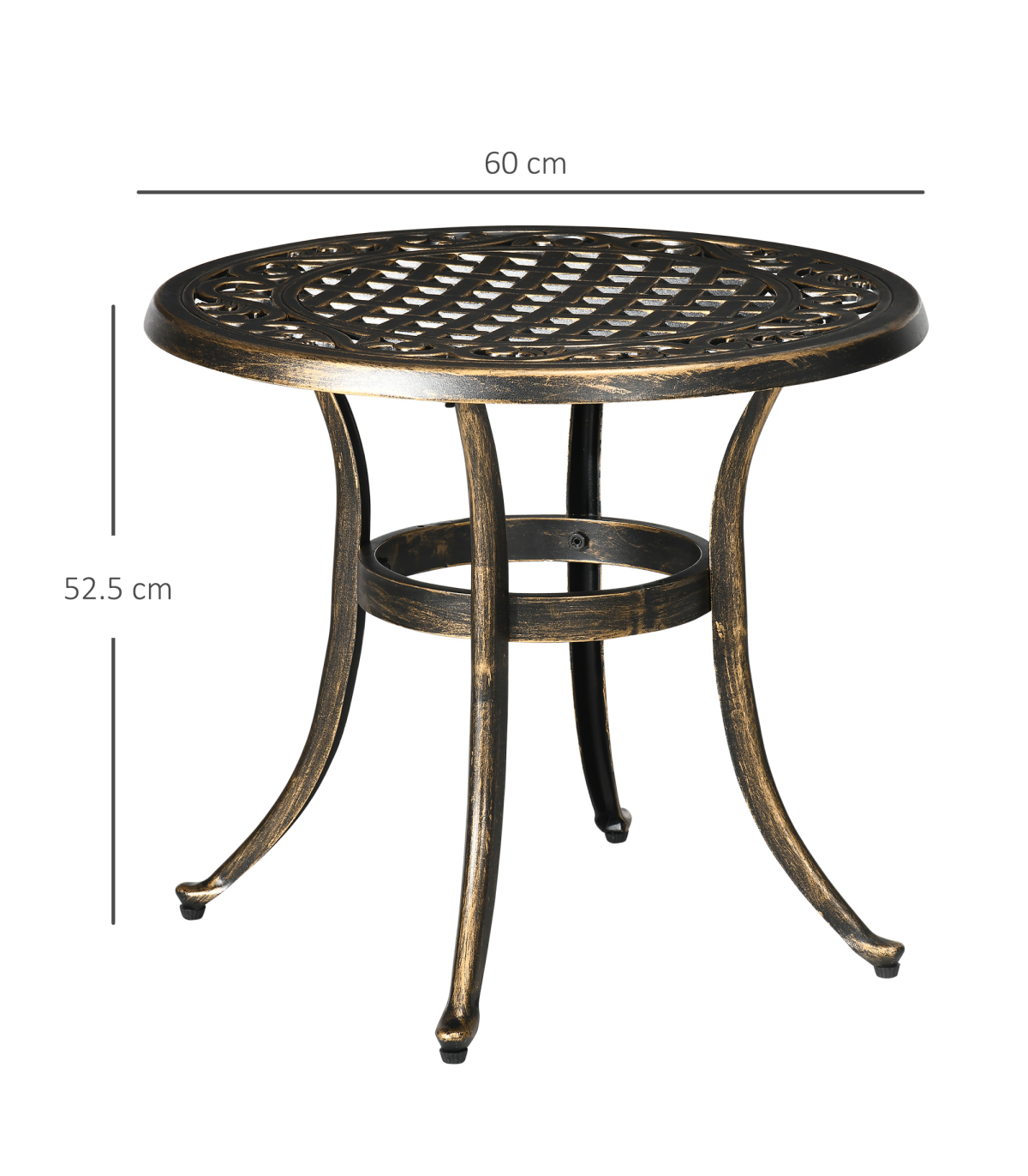 Bring a touch of chic glam into your garden this season: look to this Outsunny outdoor side table. Cast aluminium for a strong and durable structure. Bronze coloured finish is beautiful, with a pretty cut-out design on the top. Comes with four outward-curved legs for stability.