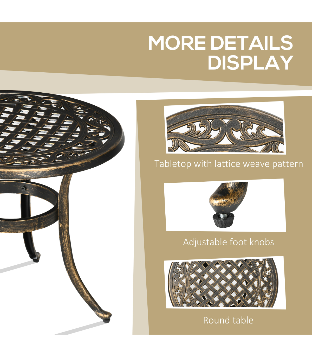 Bronze-coloured finish: A vintage touch, this side table brings beauty to its surroundings. Easy to mix with different metal and wood furniture pieces.Cast aluminium frame: Very strong and tough structure, this outdoor side table is resistant to rusting, so it's suitable for outdoor use.Four curved legs: This end table stands steady and balanced.Adjustable feet: Keeps this patio side table balanced, even on uneven ground.Dimensions: 52.5H x ?60cm. Maximum load 60kg. Assembly required.