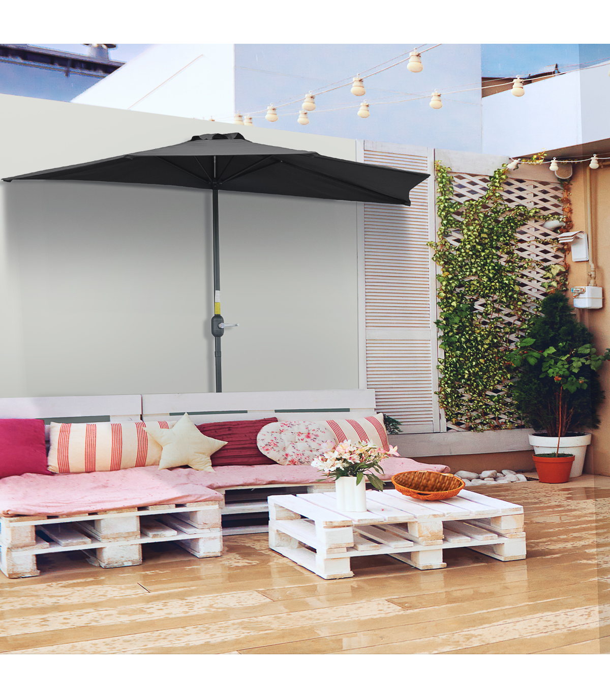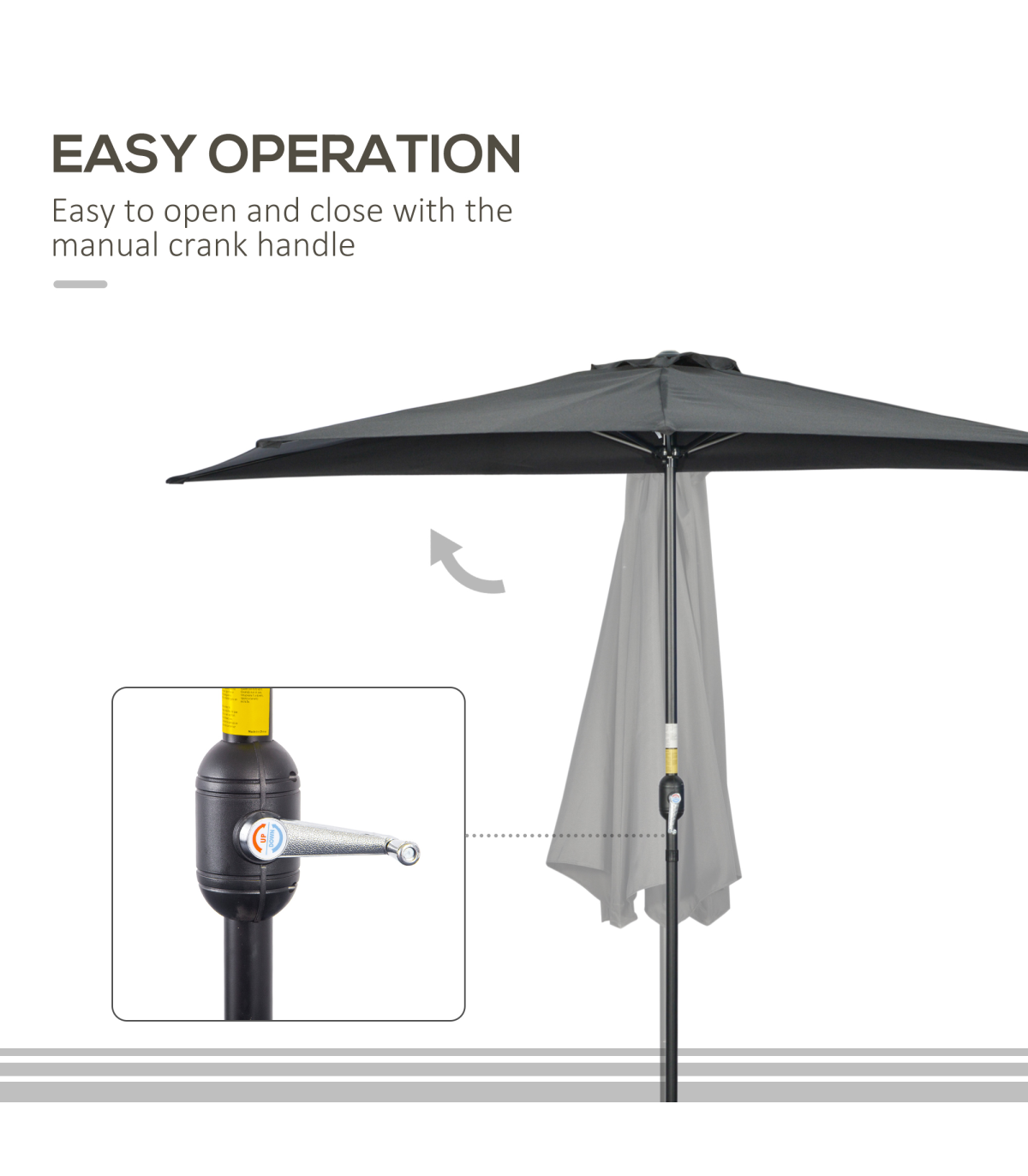 DURABLE & STURDY: This half umbrella' sturdy metal frame with 5 rib frames to supports a UV resistant half round parasol polyester canopy for reliability.CRANK MECHANISM: Open and close the half garden parasol in seconds with the easy-to-turn handle located on the side of garden parasol pole.TOP VENT: The top vent design of this half parasol umbrella not only can provide air flow, but also can reduce the situation of being overturned by wind.STYLISH DESIGN: Attractive and stylish, suitable for using against the wall. The balcony parasol is ideal for balcony, patio and any other outdoor area.NO BASE INCLUDED. NOTE: The balcony umbrella should be used against the wall