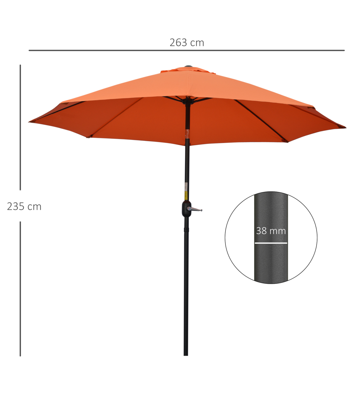 TILTING PARASOL: Fix to three different angles to shade against the sun and its rays, through different times of day. Handle to open and close parasols umbrellas easily.e2.63M CANOPY: Large patio umbrella offers plenty of shade from direct sunlight and light rain. Perfect for gardens, balconies, patios and other uncovered outdoor areas.ALUMINIUM POLE WITH CRANK HANDLE: Sturdy central core. Open and close the garden umbrellas easily with the easy-turn movement. Located on the side of the pole.SUITABLE BASES: All Outsunny standard bases are suitable - must be heavier than 25kg.DIMENSIONS: 2.63H x e2.35m. Pole: e38mm. ASSEMBLY REQUIRED - DO NOT LEAVE OPEN IN HEAVY WEATHER.