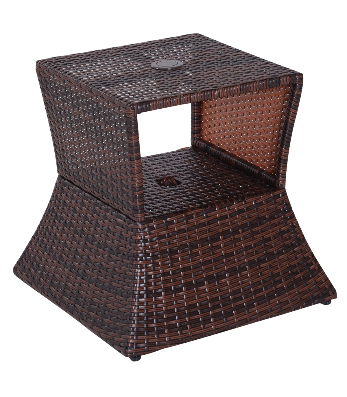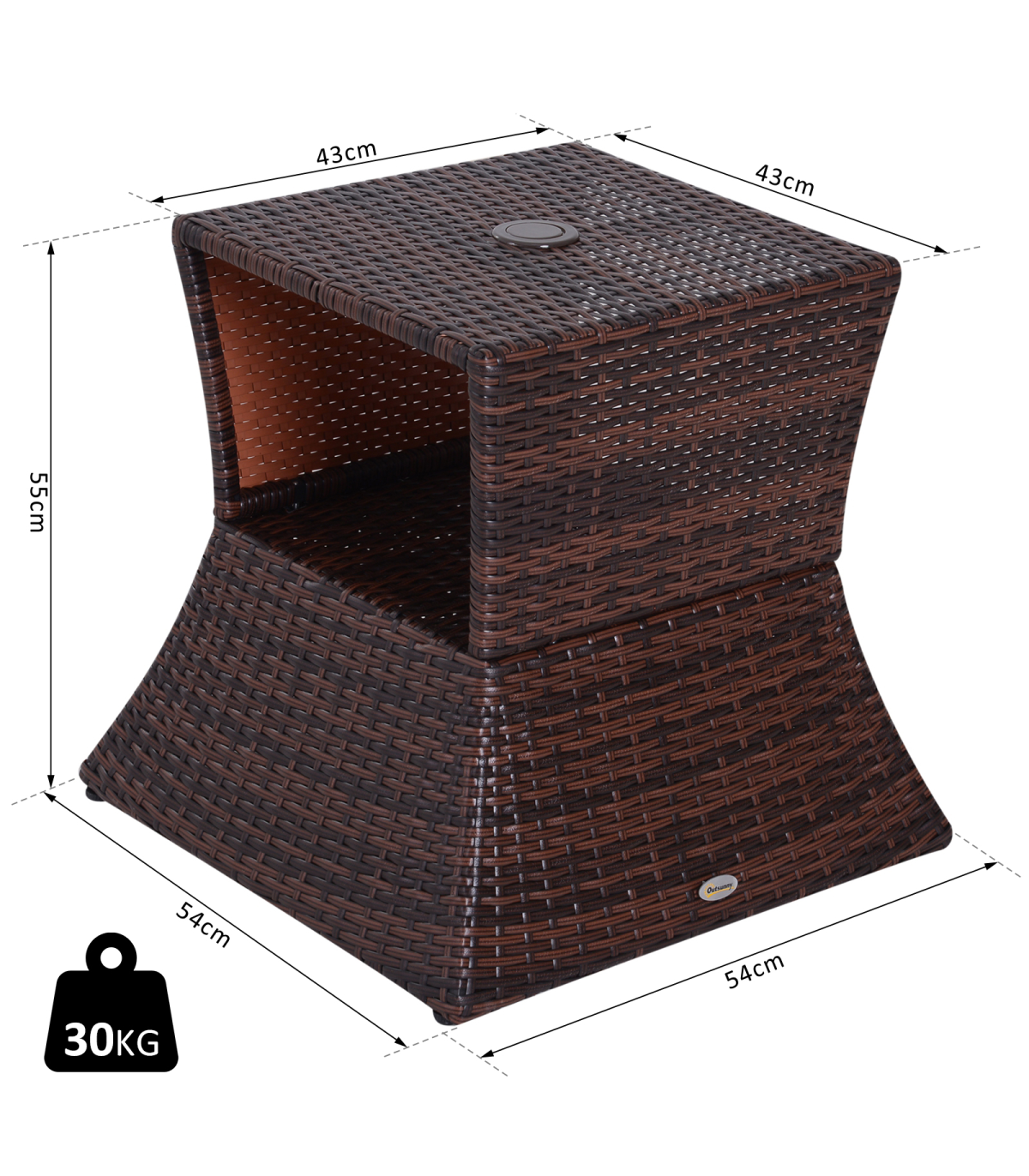 PE RATTAN WICKER: Weather-resistant for year-round use. Mixed grey colourway is stylish and will complement other rattan pieces.CENTRAL PARASOL HOLE: Holds a single sun umbrella so you can relax in the shade and ensure you are protected.METAL FRAME: A solid structure which ensures a tough main structure. STORAGE SHELF: Easy to keep everything you need right next to you.DIMENSIONS: 55H x 54L x 54Wcm. Table top: 43L x 43Wcm. Umbrella hole: 4cm (Suitable for 38mm umbrella diameter )MAXIMUM LOAD 30KG. ASSEMBLY REQUIRED.