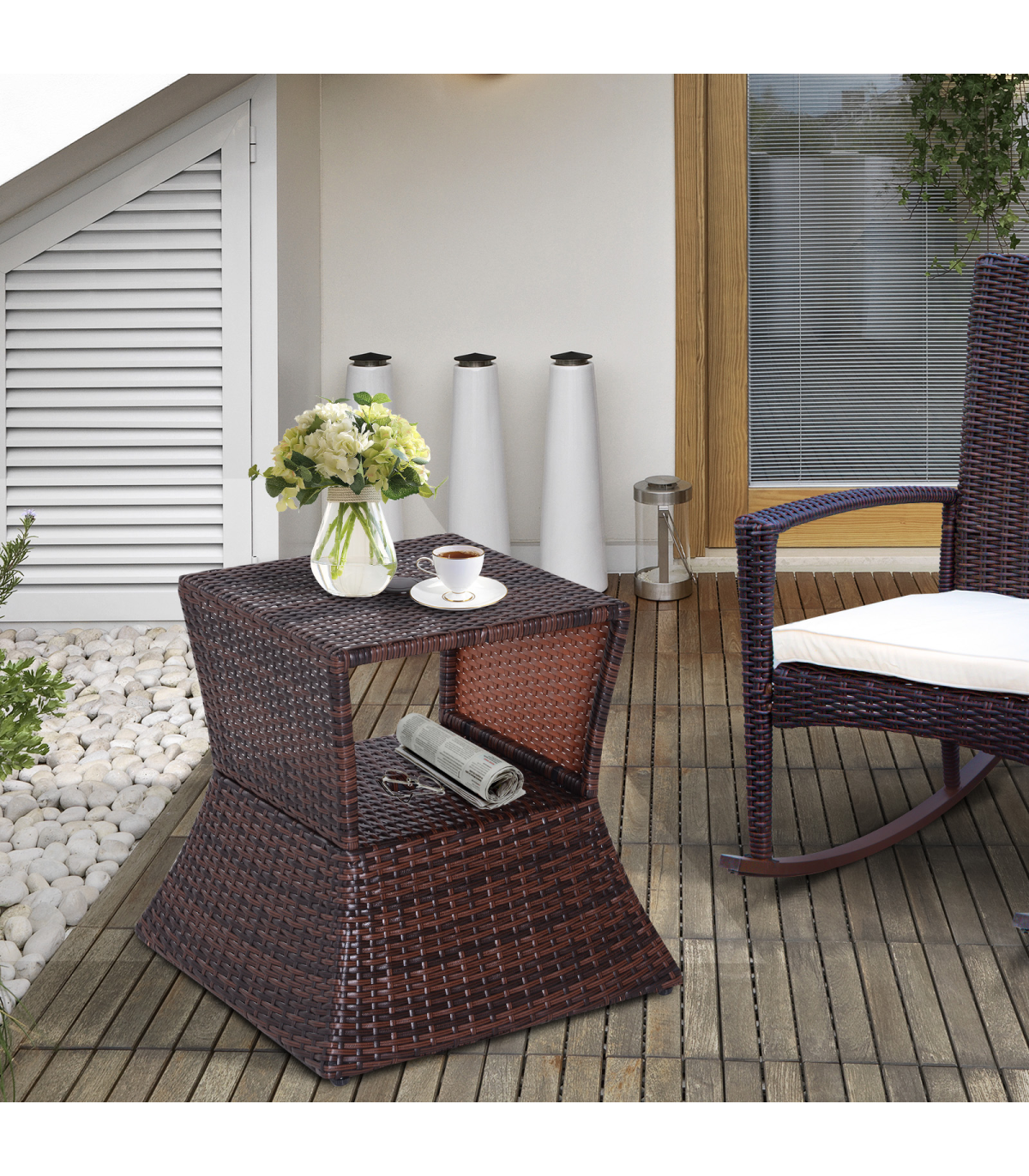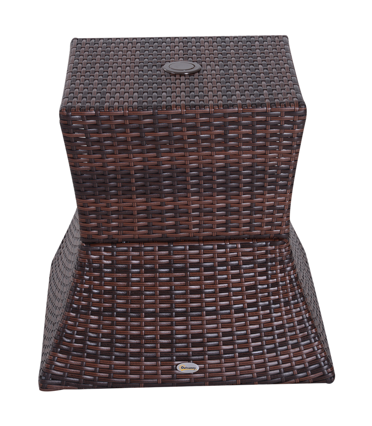 Bring a stylish feel to your coffee breaks with this rattan table from Outsunny. Made with weather-resistant PE wicker wrapped around a metal frame, this table has been built to withstand the weather, along with daily wear and tear to ensure it looks great for years to come. Easy to clean, it features a central hole to place a parasol umbrella, along with an open shelf in the middle to store your necessities when needed. It?s a great addition to your garden, patio, conservatory or balcony.