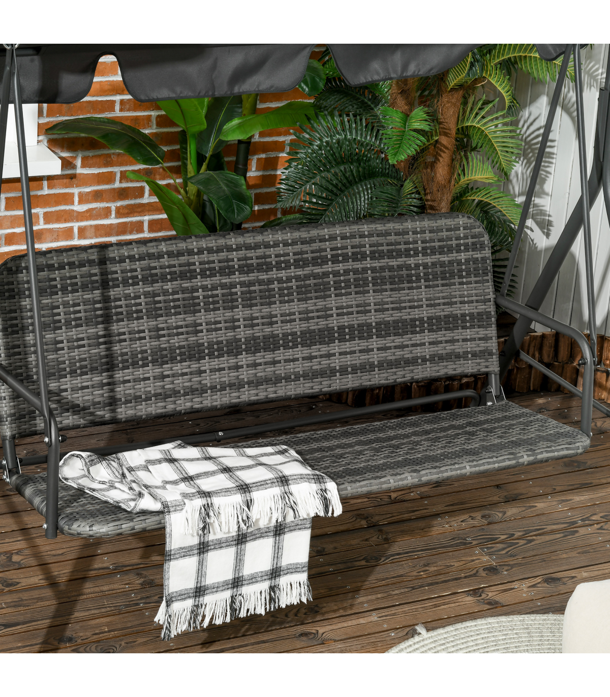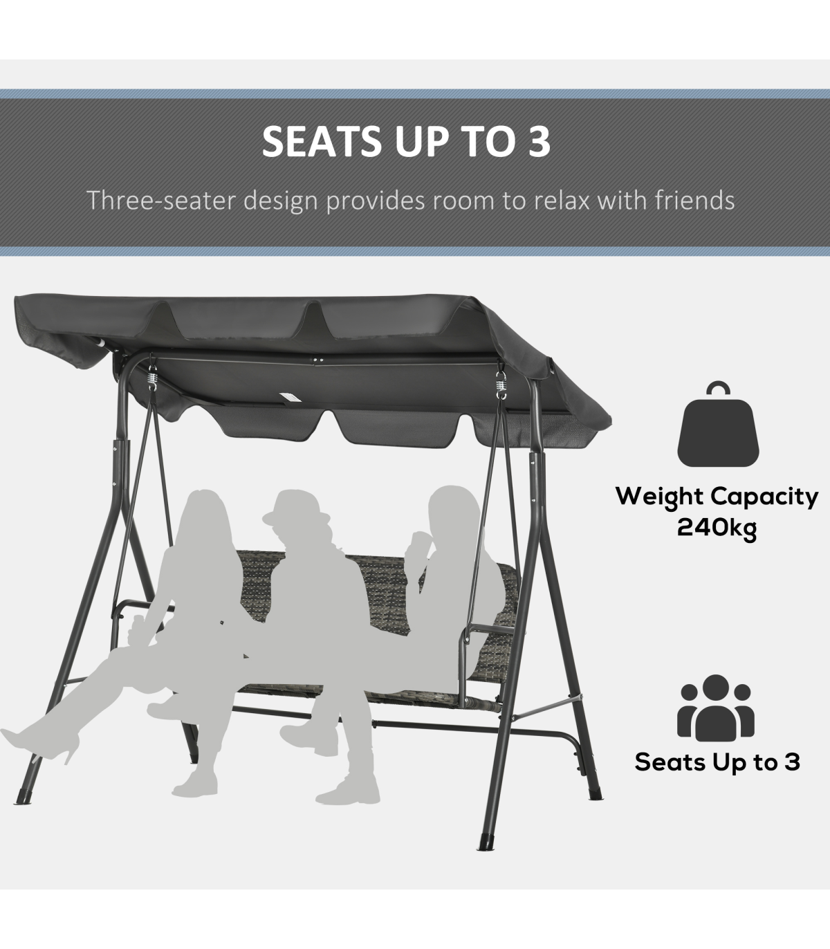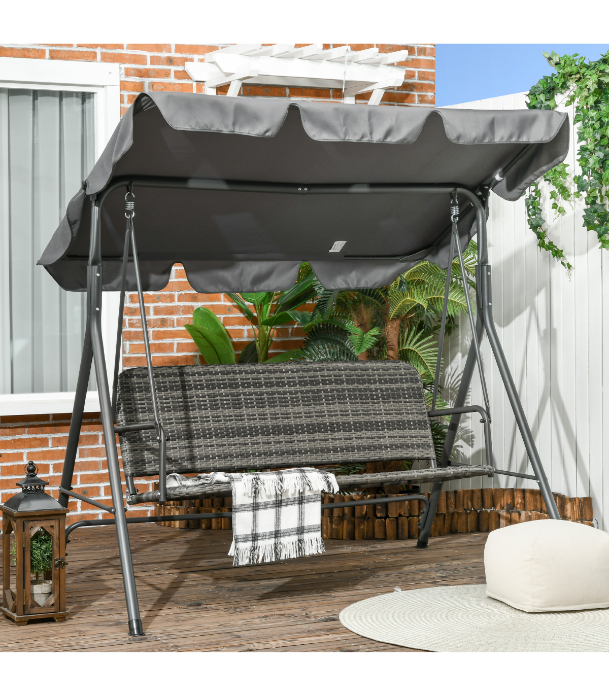 Enjoy outdoors with this Outsunny three-person swing seat. The adjustable canopy keeps your protected. The steel frame ensures a strong, supportive core. The rattan seat makes it a perfect pairing with your other on-trend garden furniture.