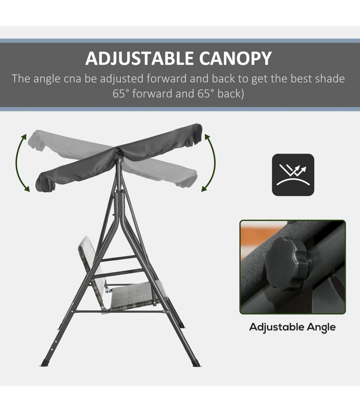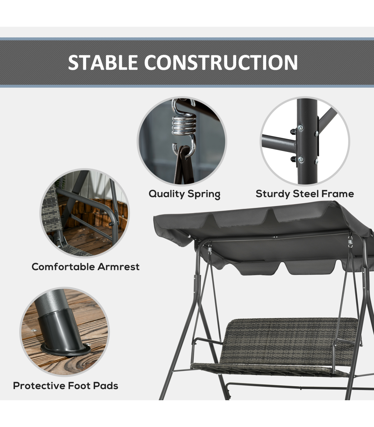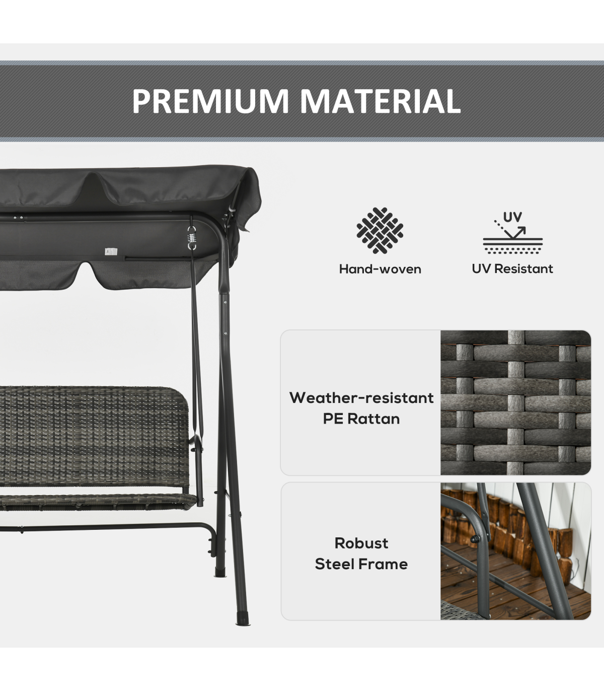 Enjoy outdoors with this Outsunny three-person swing seat. The adjustable canopy keeps your protected. The steel frame ensures a strong, supportive core. The rattan seat makes it a perfect pairing with your other on-trend garden furniture.