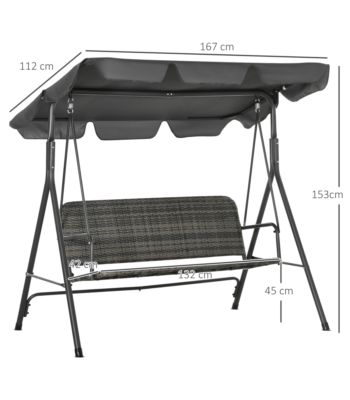 Three-person rattan swing seat: Enough room to relax by yourself or with company.65e adjustable canopy: Relax, protected from direct sunlight on the garden swing seat.Metal frame: Powder coated for extra strength, a strong core for this hanging garden chair.Rattan swing seat: A great addition to your garden furniture, rattan swing chair matches other pieces effortlessly.Dimensions: 167W x 112D x 153Hcm. Canopy: 167W x 112Dcm, Maximum load 240kg. Assembly required.