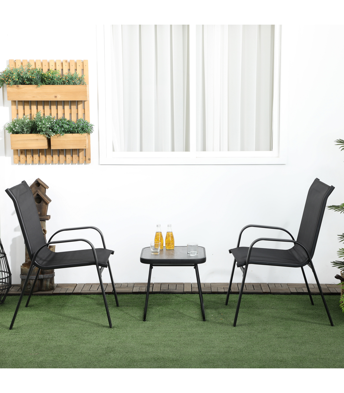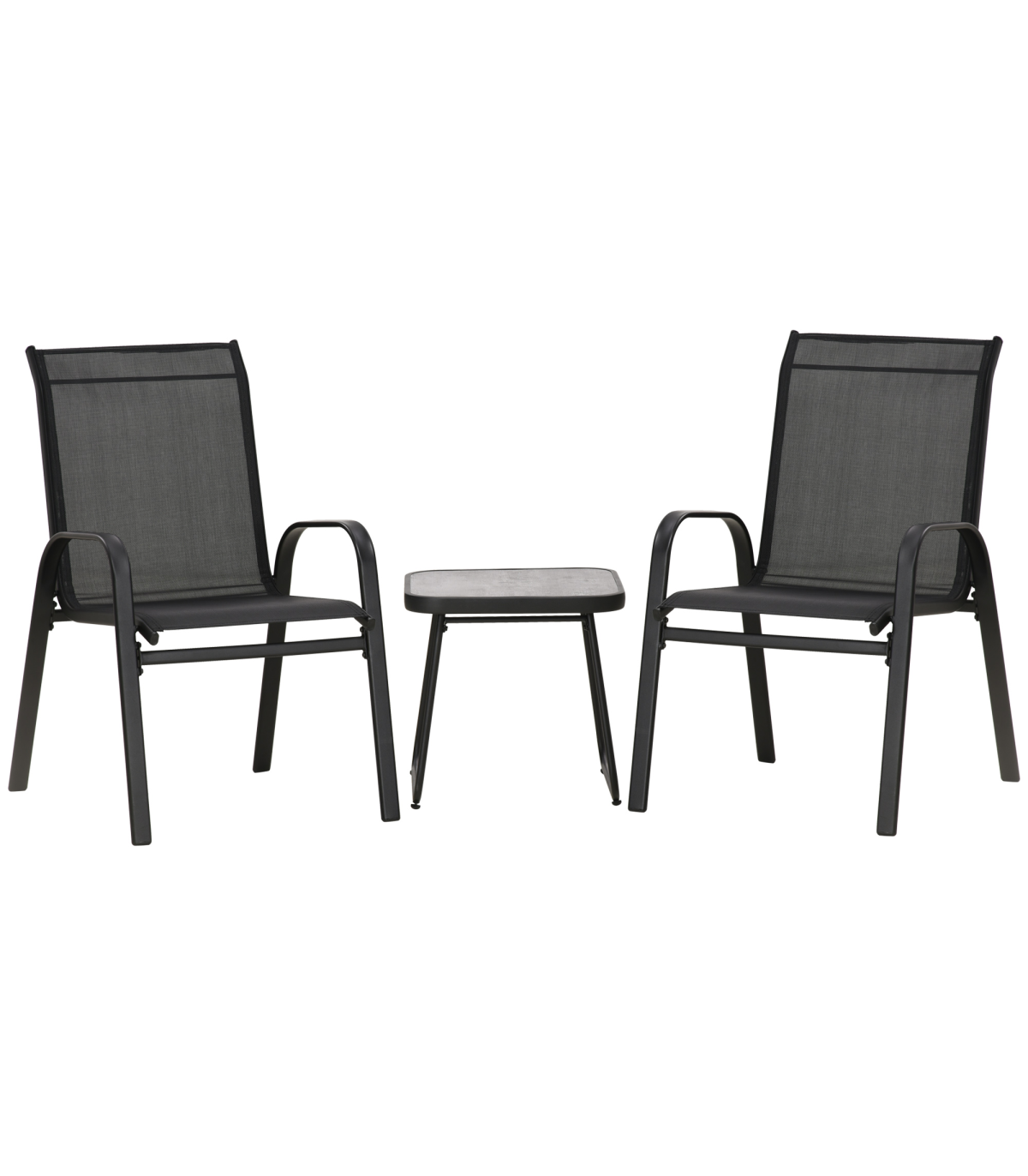 This Outsunny three-piece set is great for relaxing with company outdoors. Comes with two chairs and table. Each piece has a steel frame: strong and supportive. A great addition for all outdoor spaces.