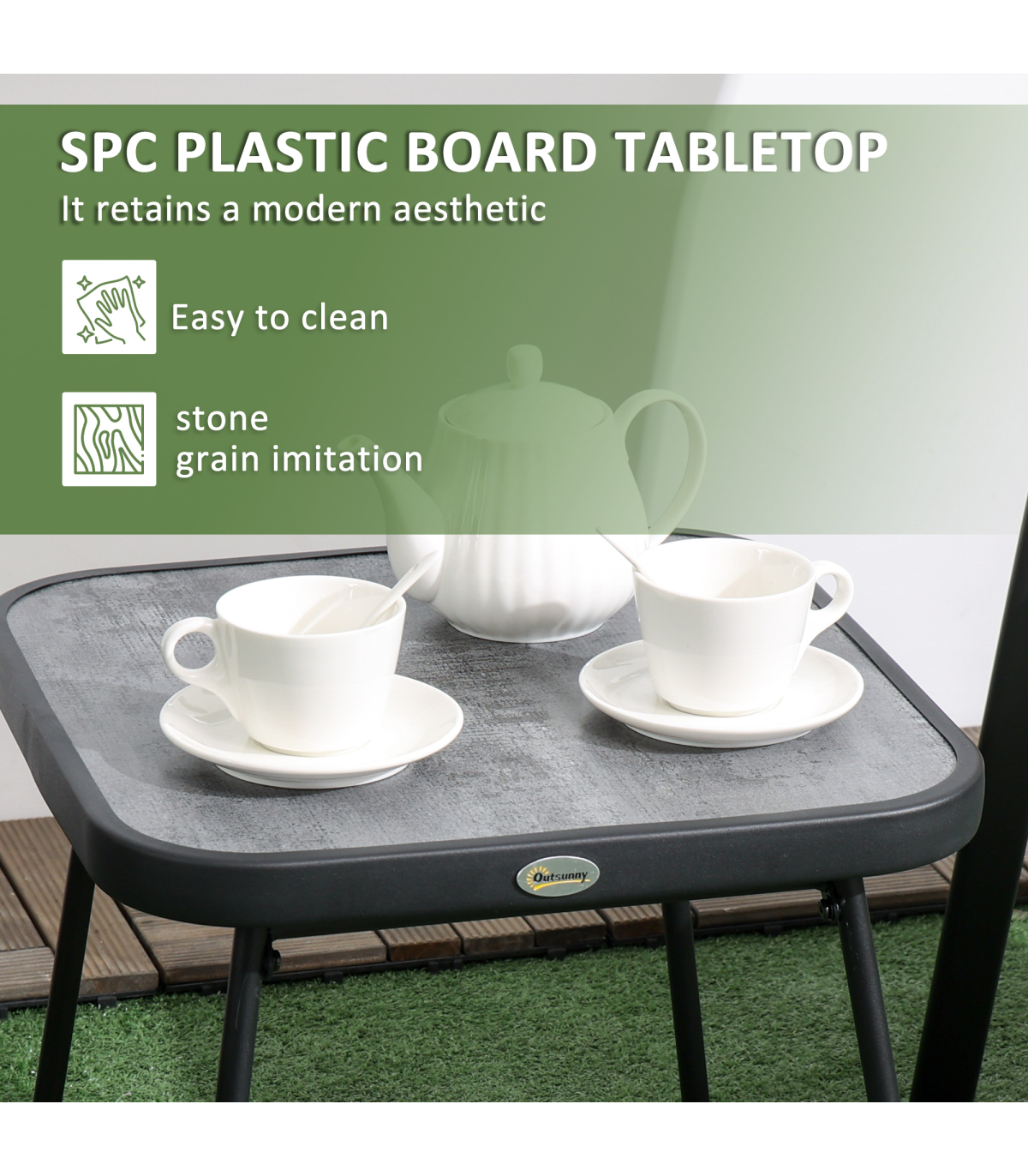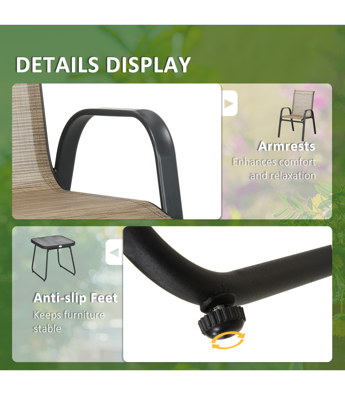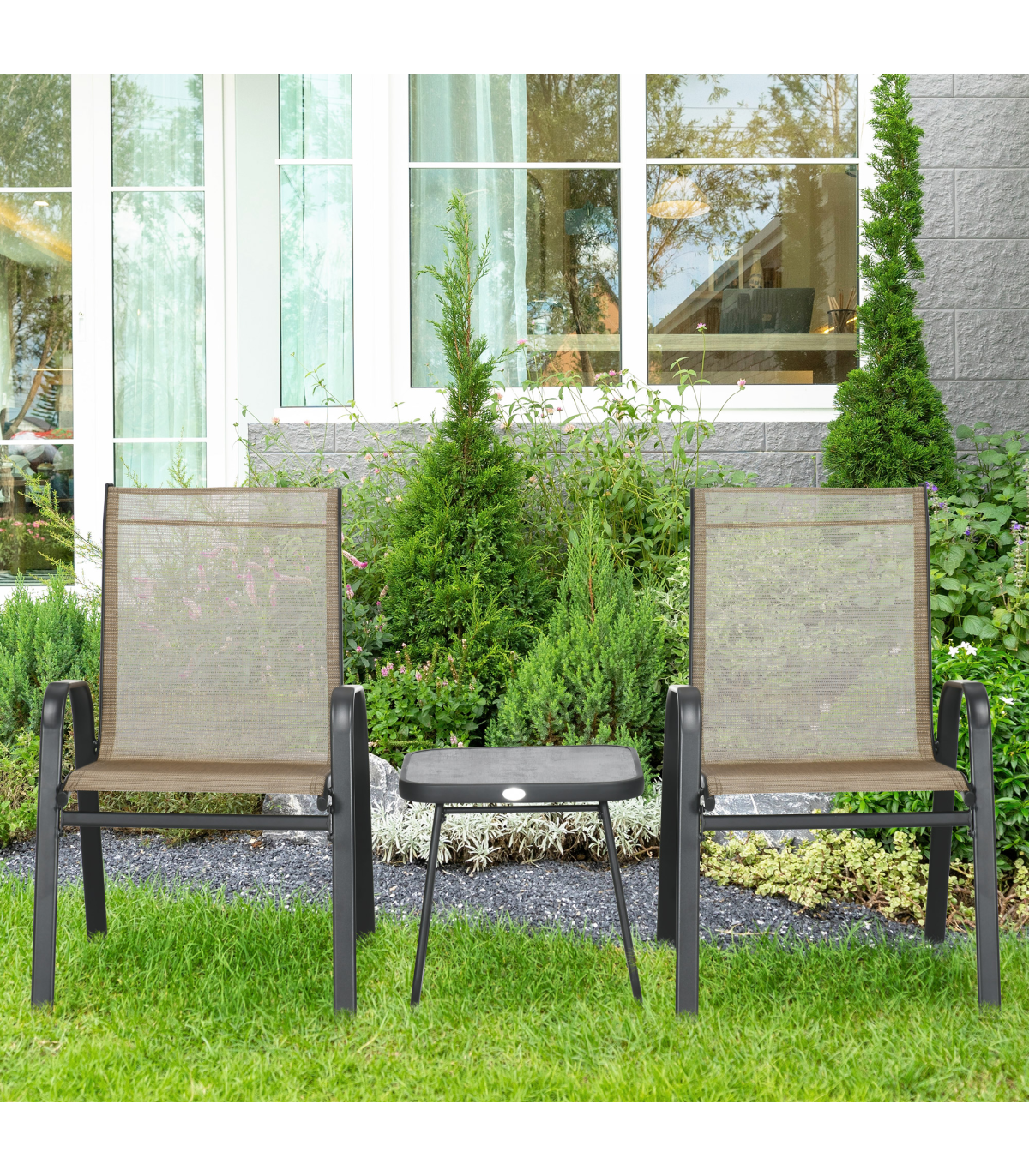 This Outsunny three-piece set is great for relaxing with company outdoors. Comes with two chairs and table. Each piece has a steel frame: strong and supportive. A great addition for all outdoor spaces.