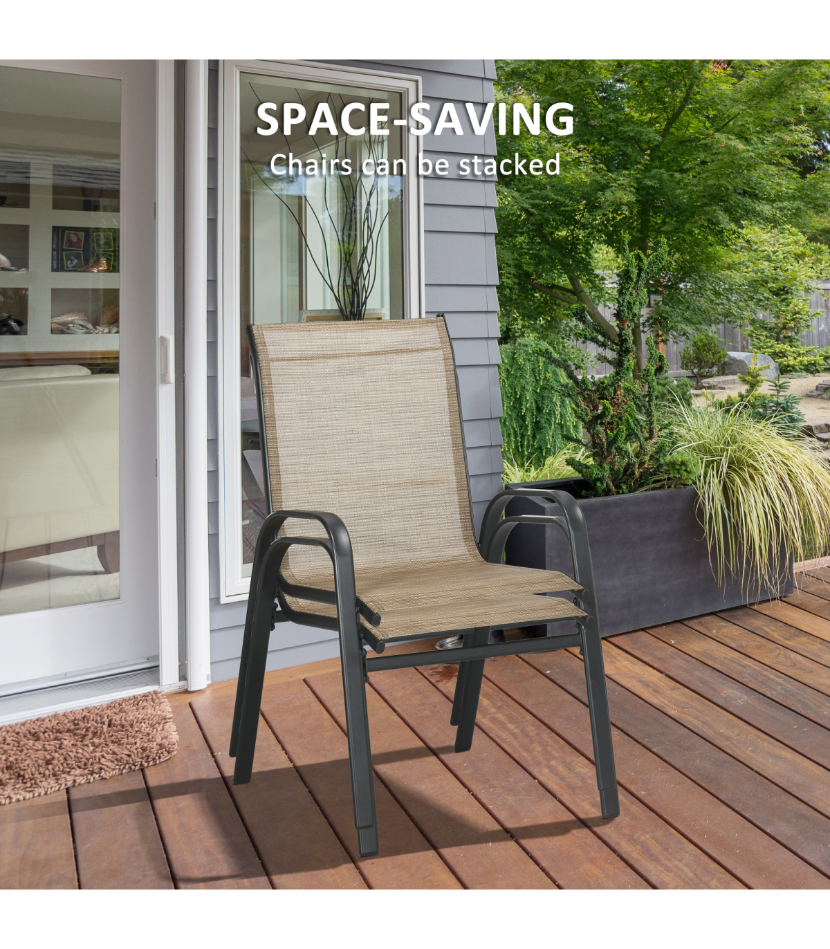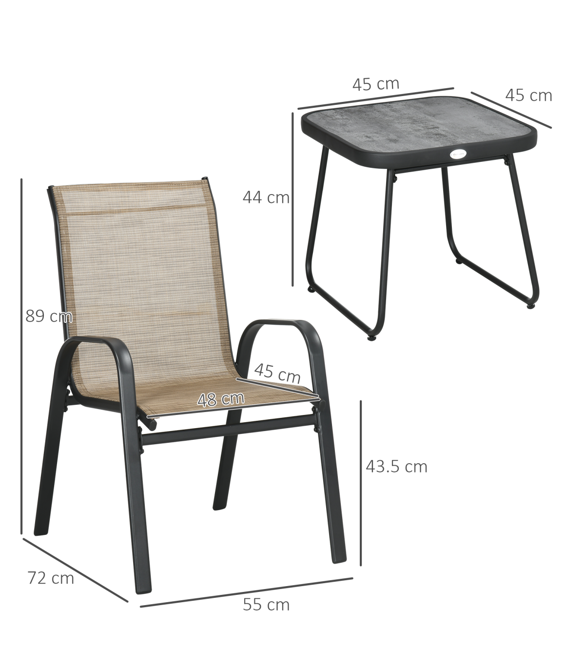 Three-piece set: Formed of two armchairs and a matching coffee table. A great addition to your outdoor areas - relax and unwind in style.Stackable chairs: Save space when not being used.Steel frames: Powder coated for extra strength - a strong core.Coffee table included: Keep things close to you as you relax.Dimensions: Table: 45H x 45.5L x 45.5Wcm. Chair: 93H x 68D x 57.5Wcm, Assembly required.