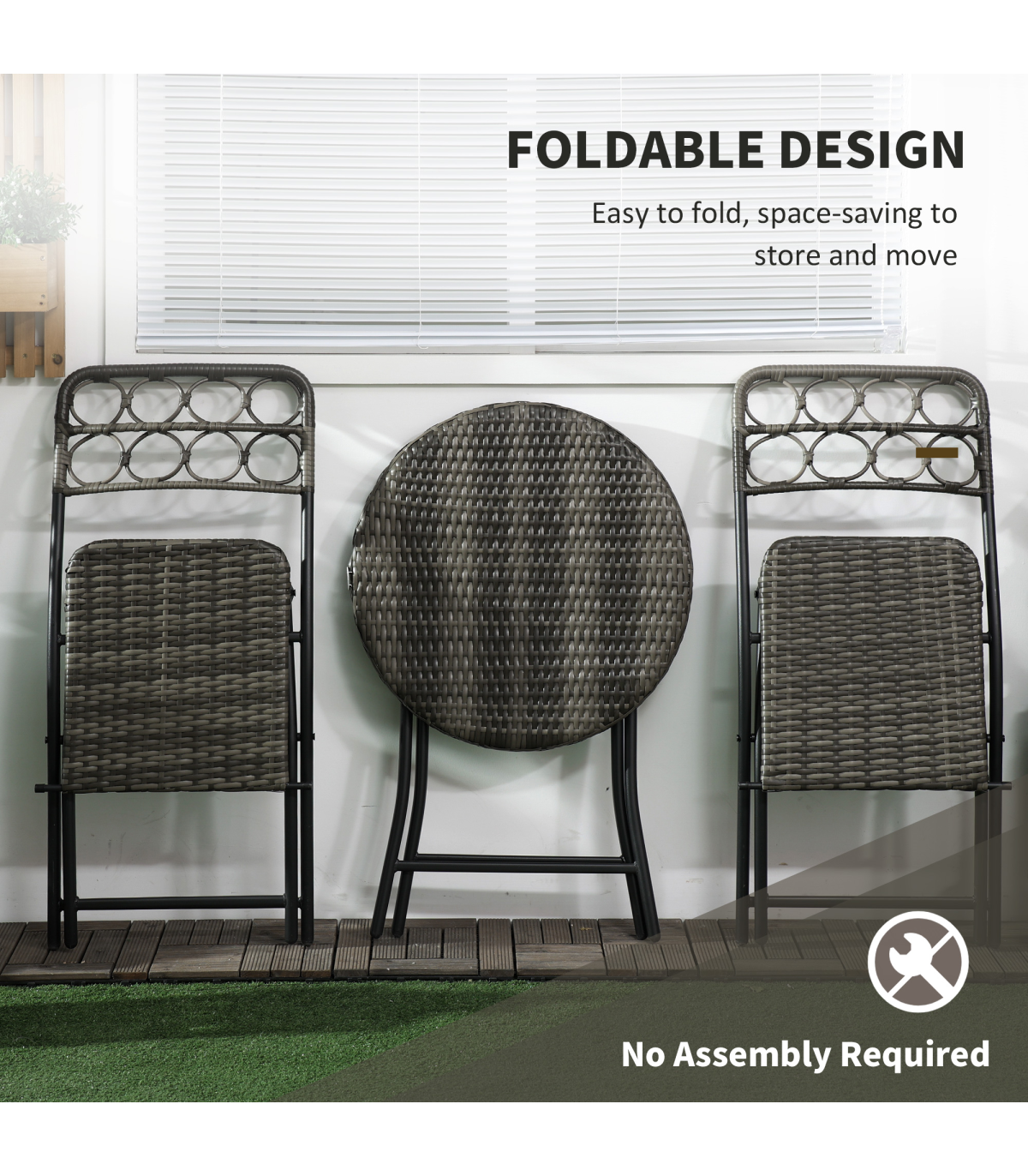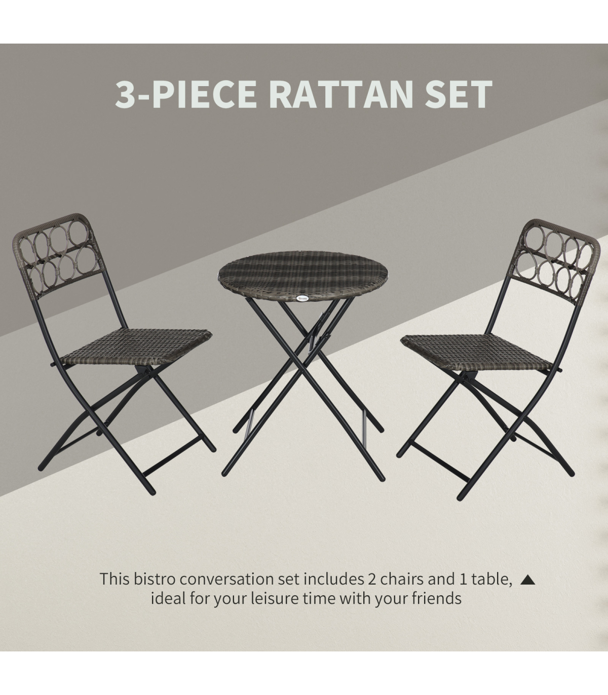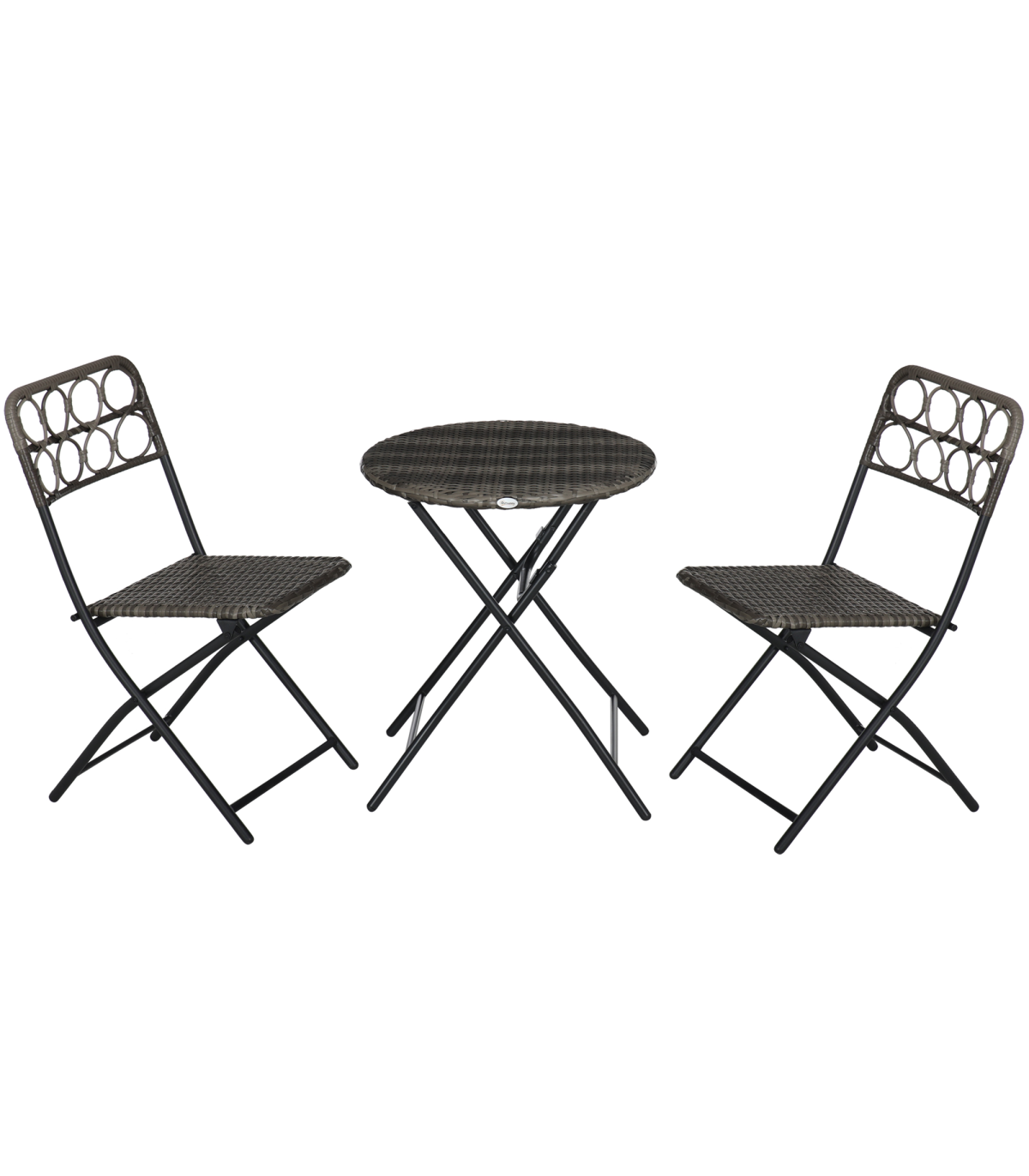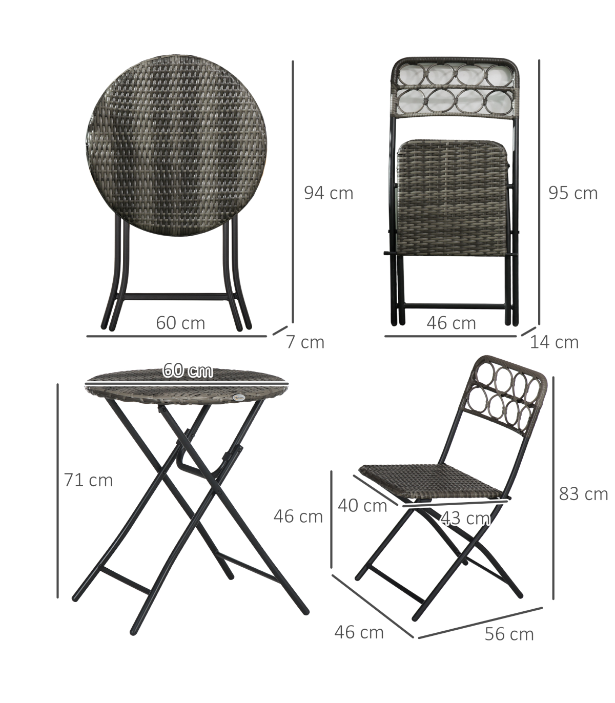 - "Outsunny 3 PCS Folding Rattan Wicker Bistro Set, Coffee Table Set, Grey" - Description: - Folding: Both chairs and table in this bistro table set can be folded - carry and store easily. - Rattan design: An on-trend and stylish design featuring weaved seats and tabletop. - Cut-out design on chair backs for added character. - Steel frames: Strong cores that support you when using this set. - Three-piece outdoor patio set: Comes with two chairs and a matching table. - Dimensions: - Table: 60 x 71Hcm. - Chair: 46W x 56D x 83Hcm. - No assembly required.
