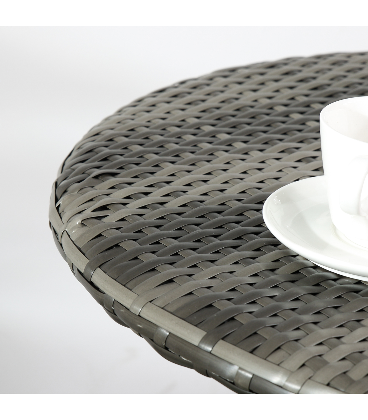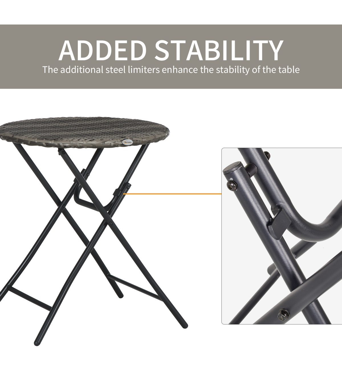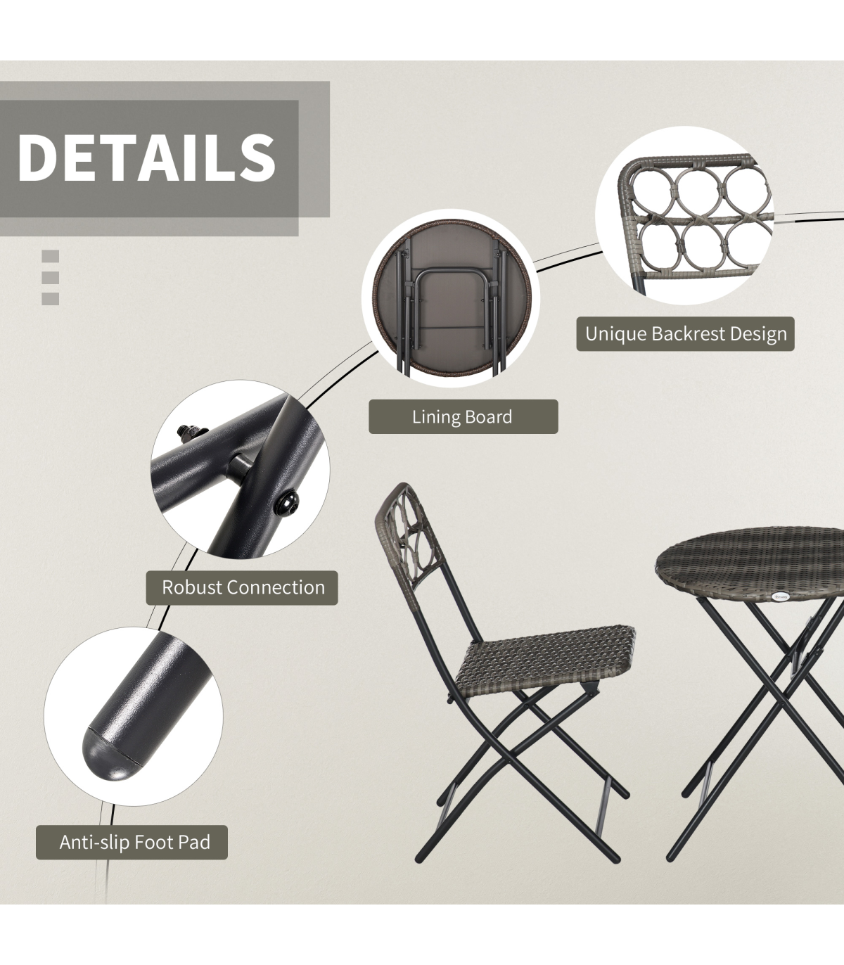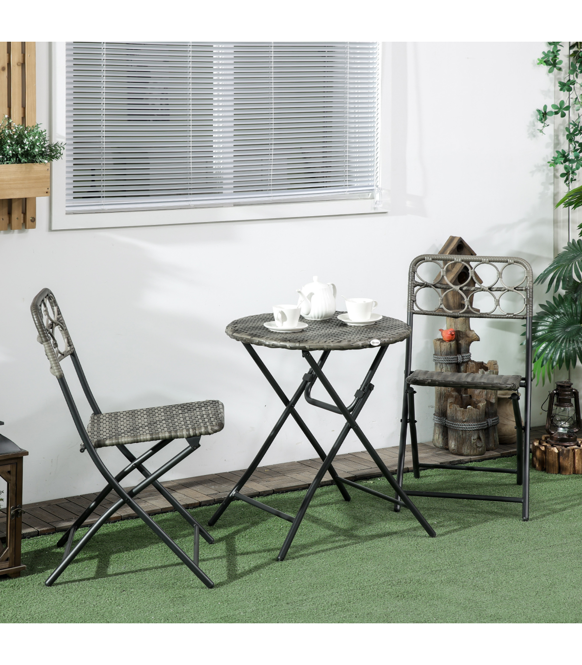 - "Outsunny 3 PCS Folding Rattan Wicker Bistro Set, Coffee Table Set, Grey" - Description: - Folding: Both chairs and table in this bistro table set can be folded - carry and store easily. - Rattan design: An on-trend and stylish design featuring weaved seats and tabletop. - Cut-out design on chair backs for added character. - Steel frames: Strong cores that support you when using this set. - Three-piece outdoor patio set: Comes with two chairs and a matching table. - Dimensions: - Table: 60 x 71Hcm. - Chair: 46W x 56D x 83Hcm. - No assembly required.