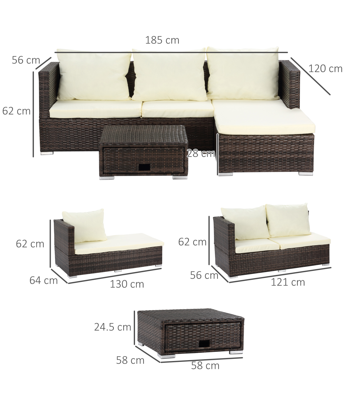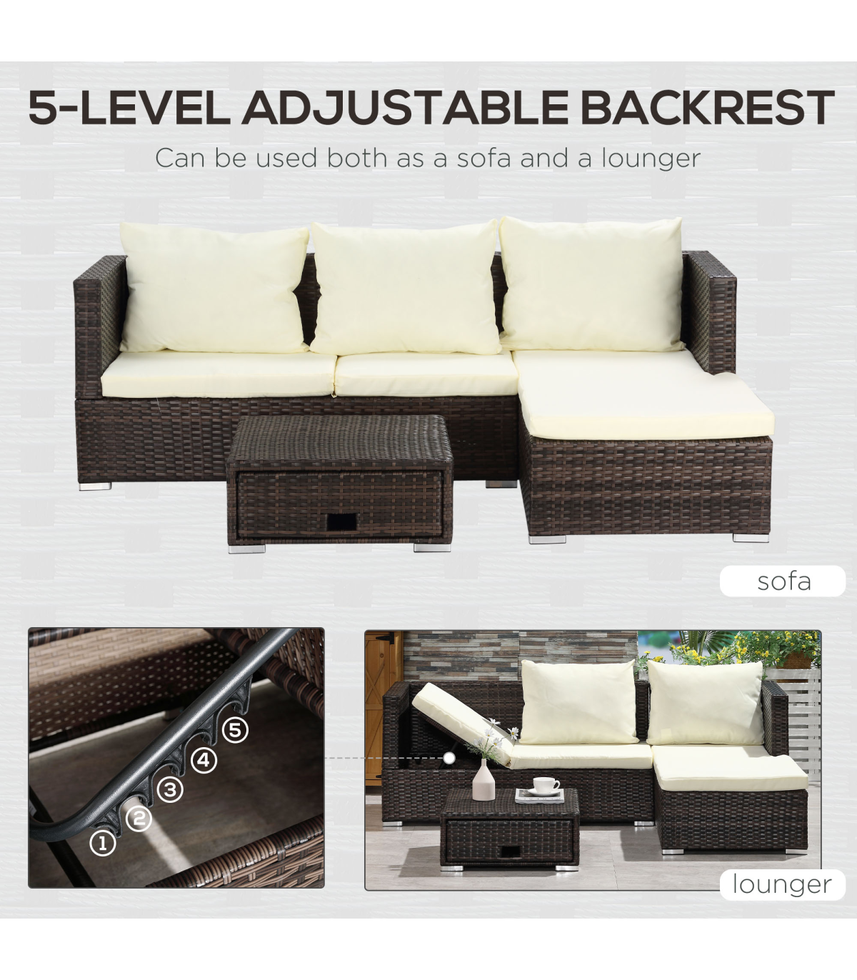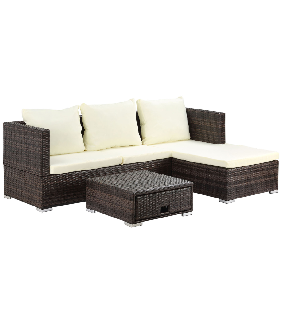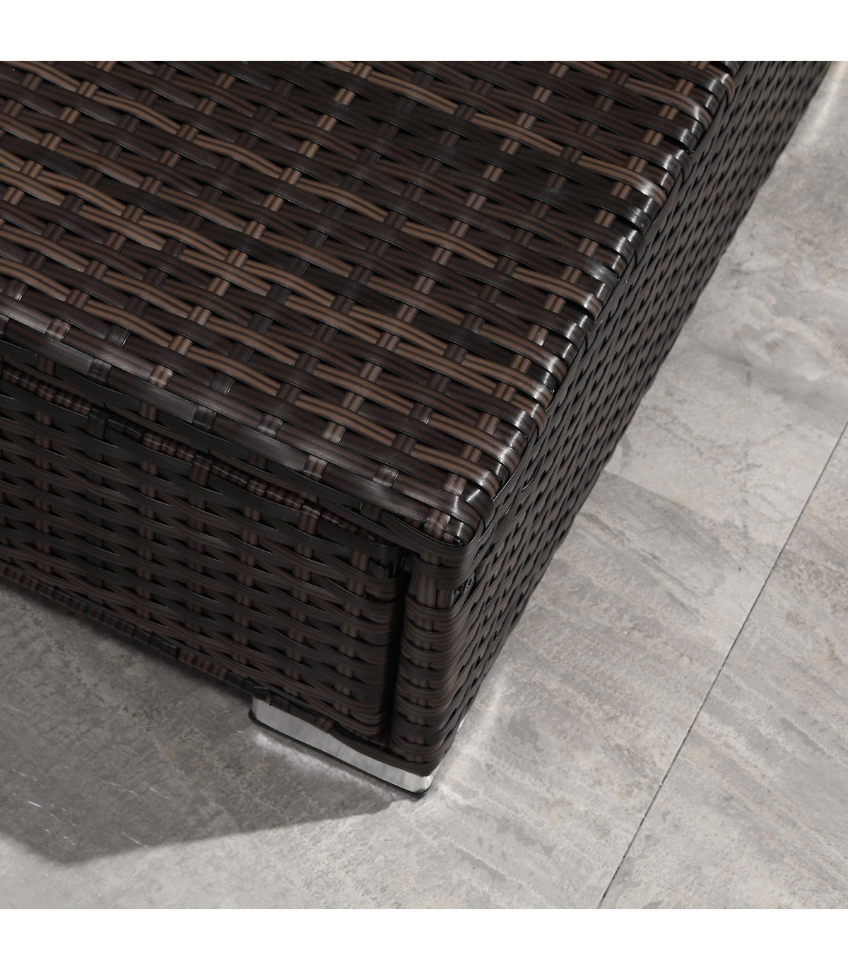 THREE PIECE SET: The rattan corner sofa includes a two-seater corner sofa, a two-seater sofa with a reclining back and a storage coffee table. Seats up to four people with plenty of room for them to relax. The rattan garden furniture is perfect for bringing family and friends together this Summer and beyond.METAL WRAPPED IN RATTAN: The garden corner sofa has powder coated, rust-resistant steel ensures a strong and stable base, with the PE wicker making it sturdy, durable, easy to clean and resistant to UV and light water damage.RECLINING SEAT: Located among the garden rattan furniture sets, it leans back to five different positions, letting you choose an angle which is most comfortable for you. STORAGE TABLE: Underneath space of the outdoor corner sofa is concealed by a side lift-up door, a discreet way to keep your garden dining area neat and tidy.THICK CUSHIONS: Placed on the seats and backs and on the footstool of the conservatory furniture so you can sit comfortably all day long. Machine washable covers are resistant to light water and stains. DIMENSIONS: Sofa: 62H x 130W x 64Dcm. Seat: 121W x 56Dcm. Adjustable seat back: 31-62cm. Table: 24.5H x 58W x 58Dcm.MAXIMUM LOAD: Sofa: 160kg per seat. Table: 50kg. ASSEMBLY REQUIRED.