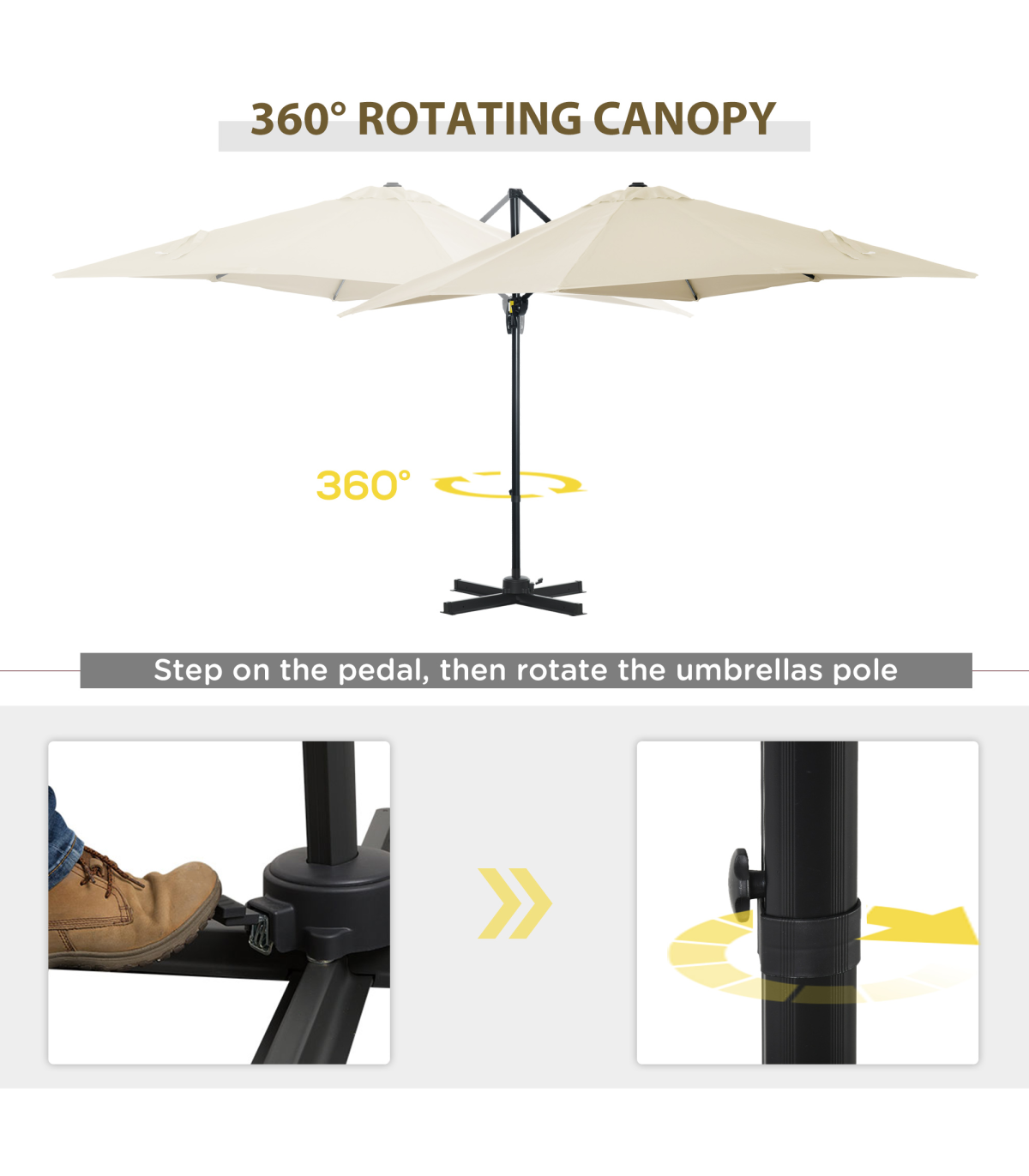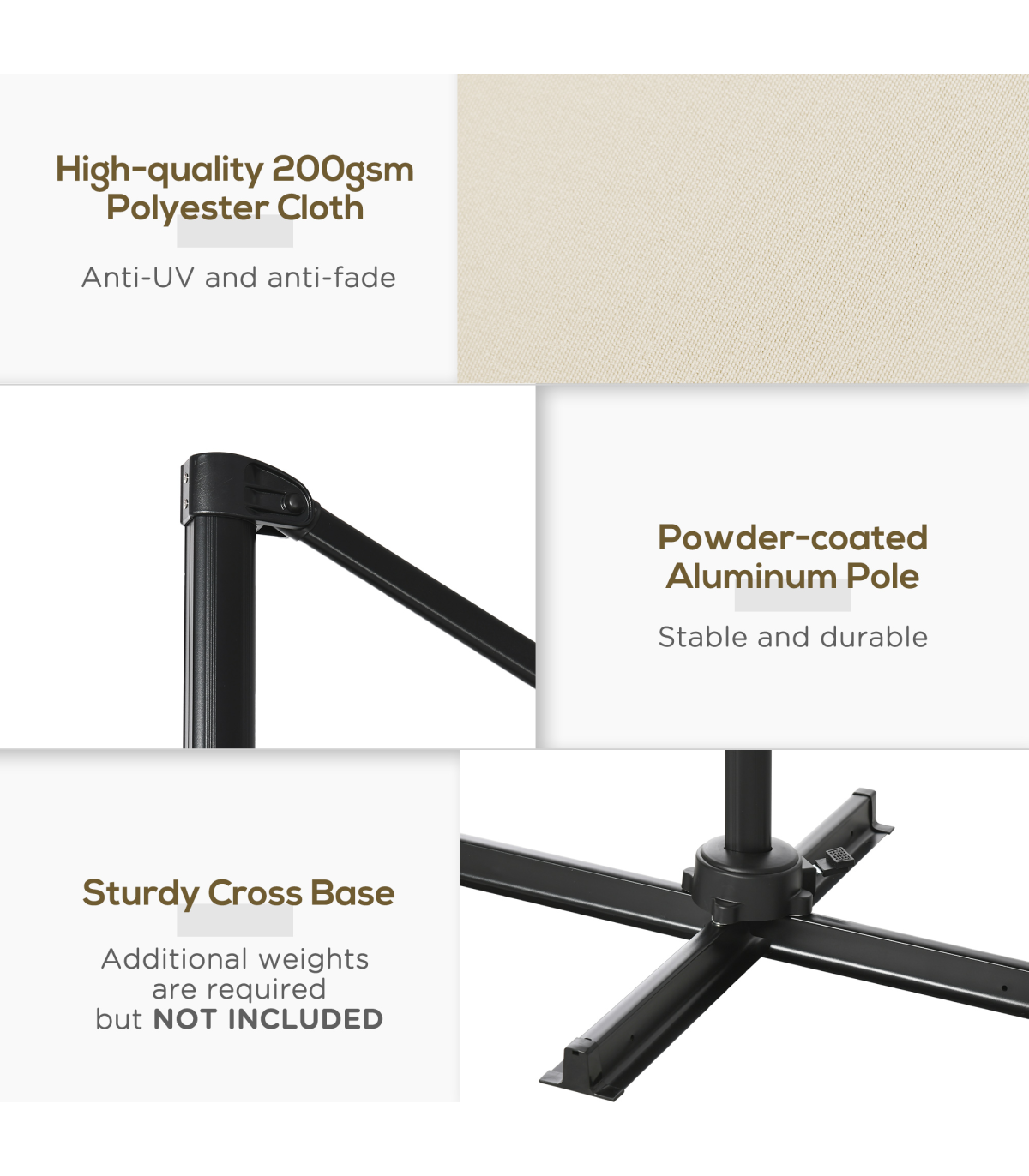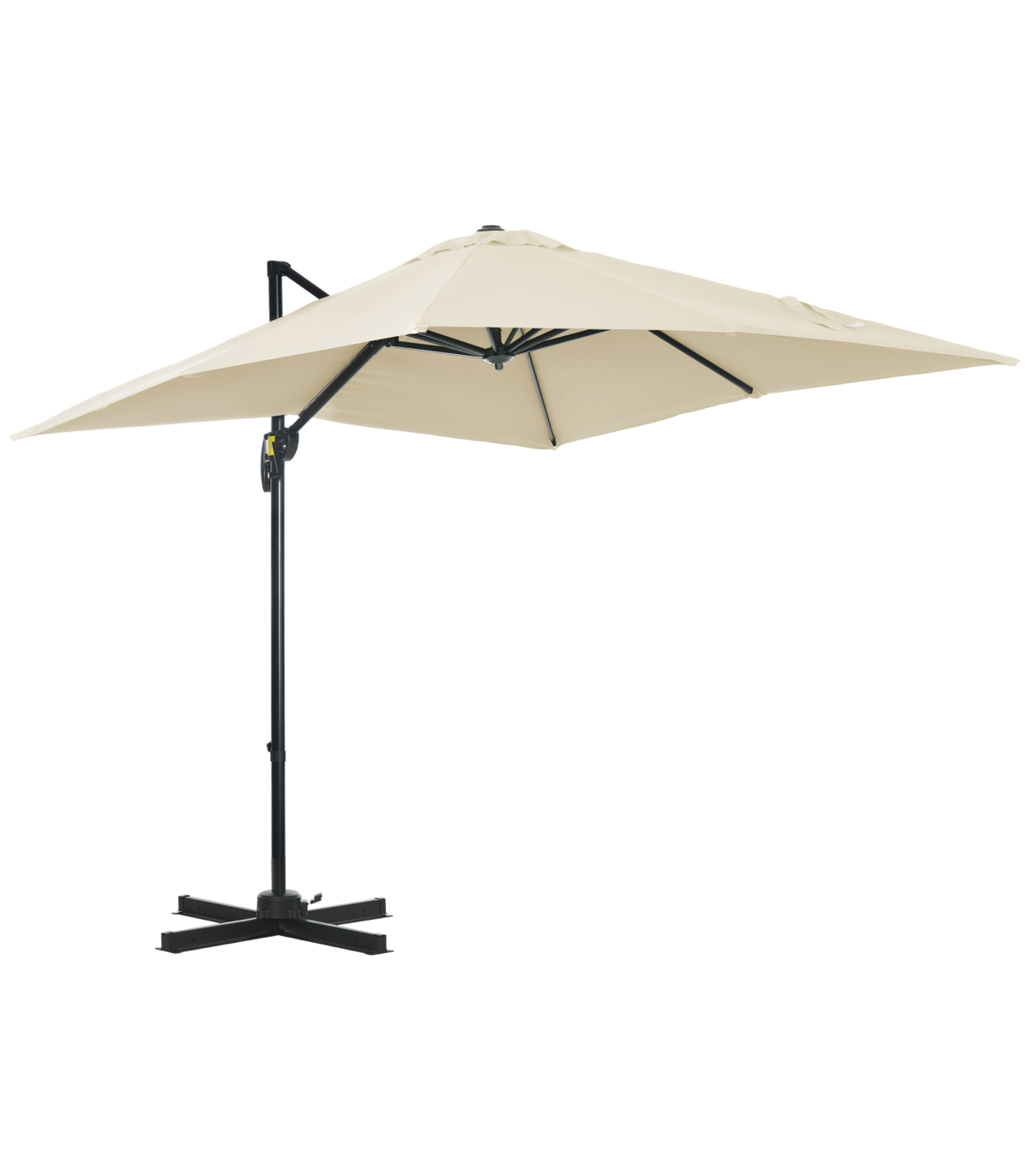 - Square Cantilever Roma Parasol 360 Rotation w/ Hand Crank, Cream White - Description: - Stylish: The overhanging parasol is with a beautiful and simplistic color that suits all style gardens, patios, etc. - 2.45M x 2.45M square canopy covers a large surface area. - UV and fade resistant. - Aluminium pole: A strong core for this cantilever patio umbrella. - Eight steel ribs connecting to the canopy for extra support. - 360° movement, five-position tilt: Garden umbrella parasol can be set to practically any position you want, use throughout the whole day. - Cross base included: Weights are required, however. - Dimensions: 245H x 245L x 245Wcm. - Base: 6H x 100L x 100Wcm.